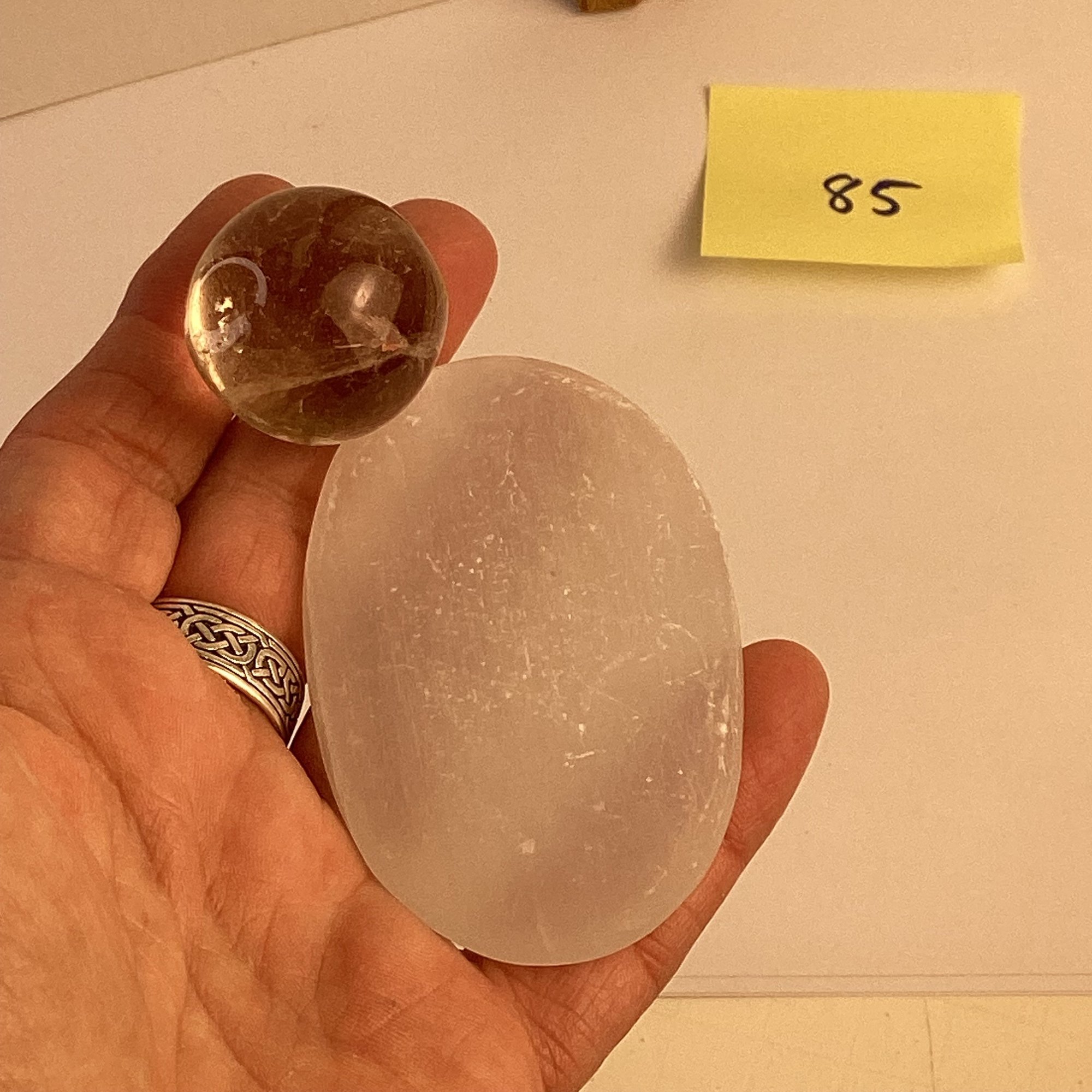 LOT 85, Rocks/crystals, 2 Pc., Selanite Palm Stone With Clear Quartz Sphere