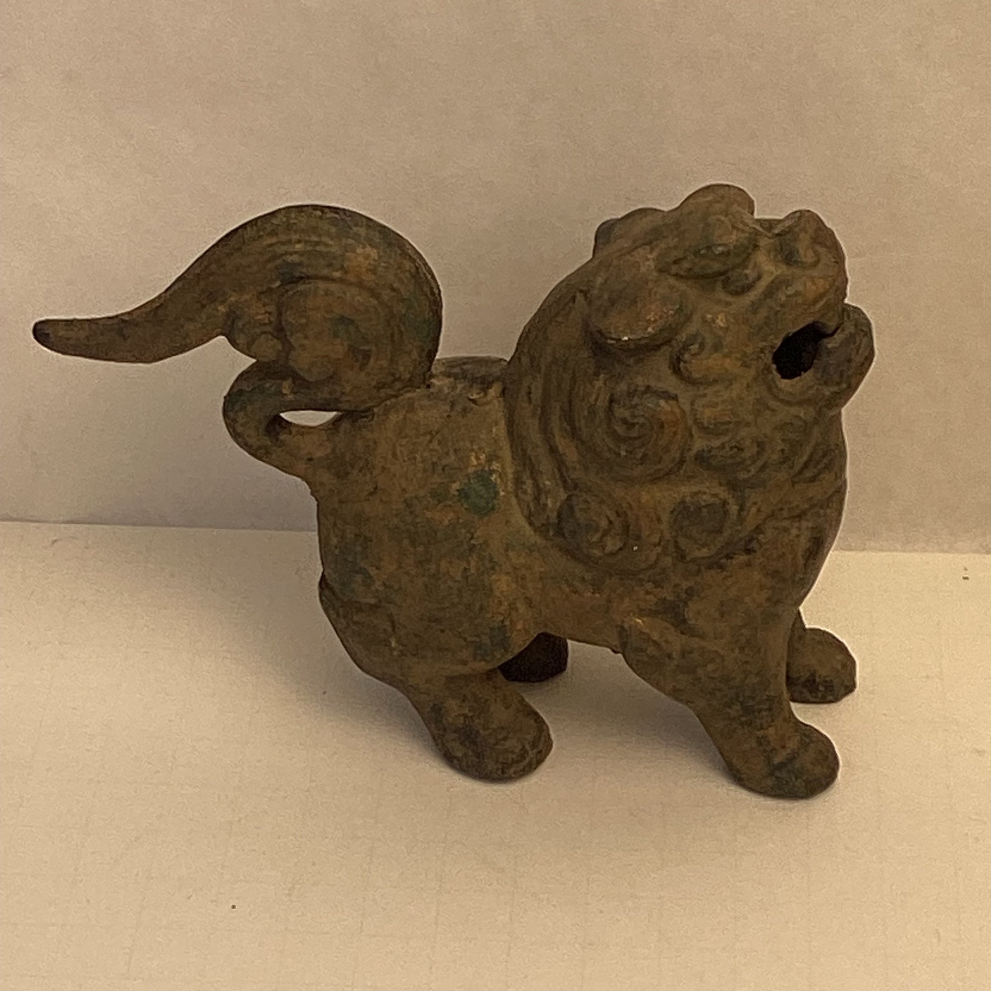 Impressive Antique Foo Dog Or Lion Casting, Iron With Verdigris/gold Paint