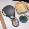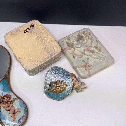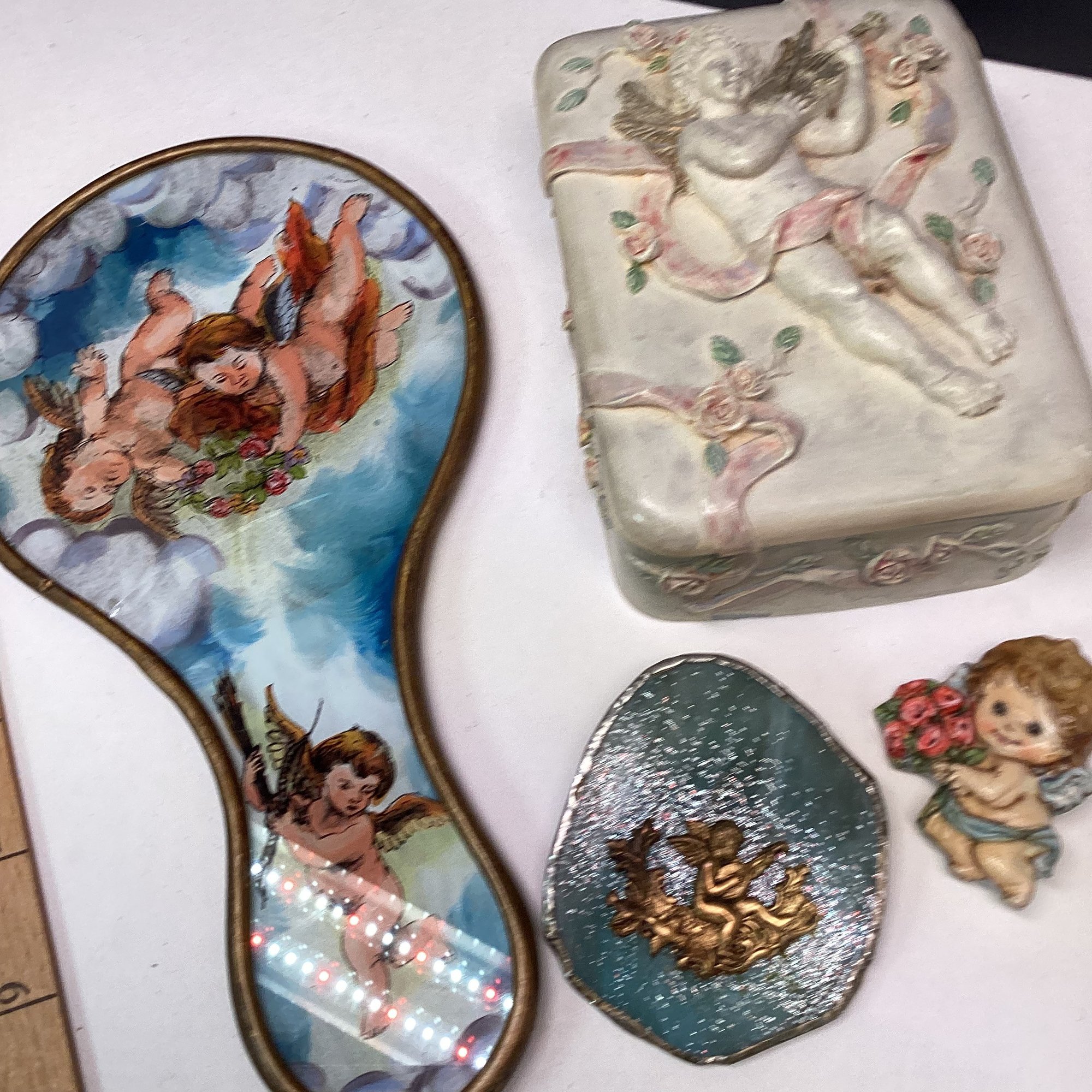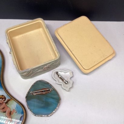 Vintage Cherub Themed Lot, Heavy Resin Box, Mirror, Pins