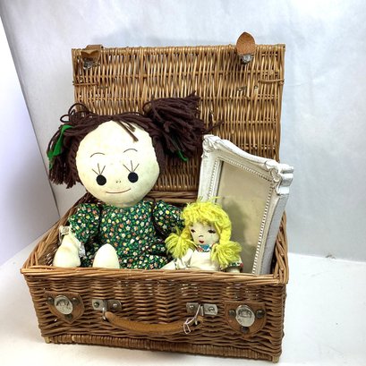 Vintage Picnic Basket W/ Rag Dolls And Frame, Leather Straps