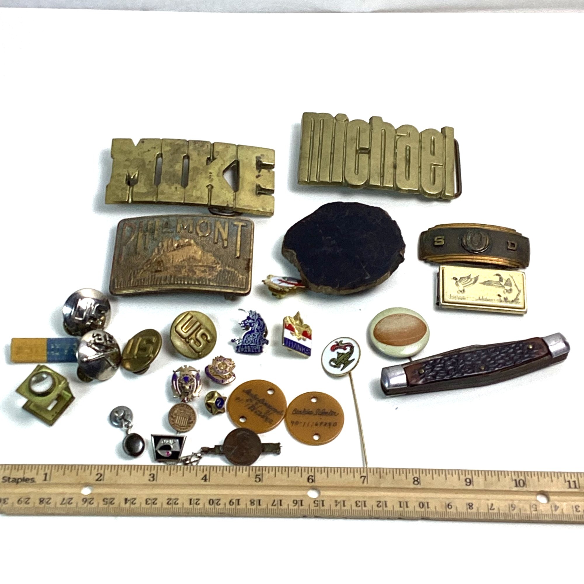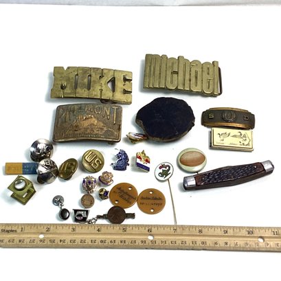 Vintage Smalls Lot, Brass Belt Buckles, Pocket Knife, Etc.