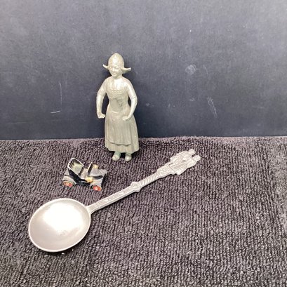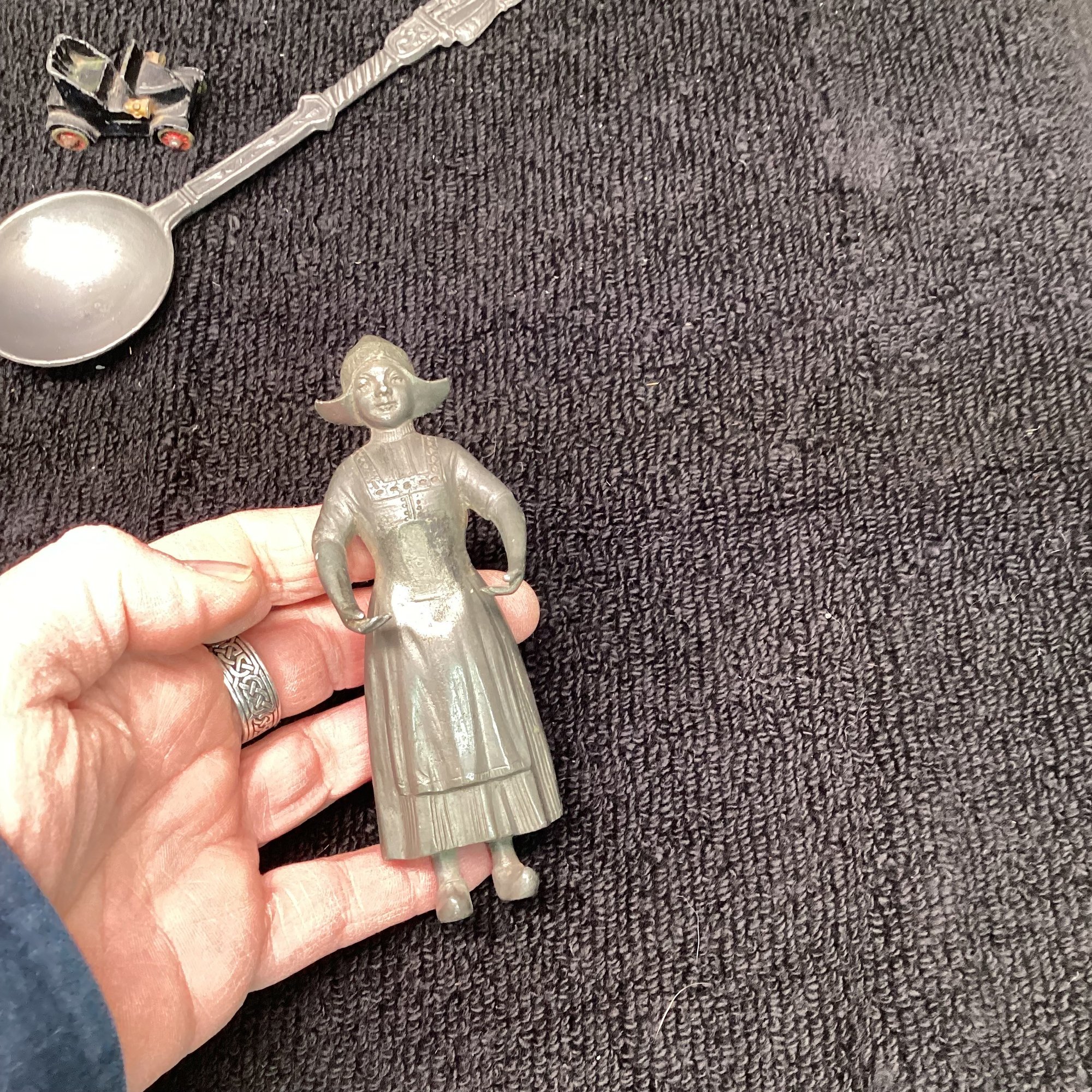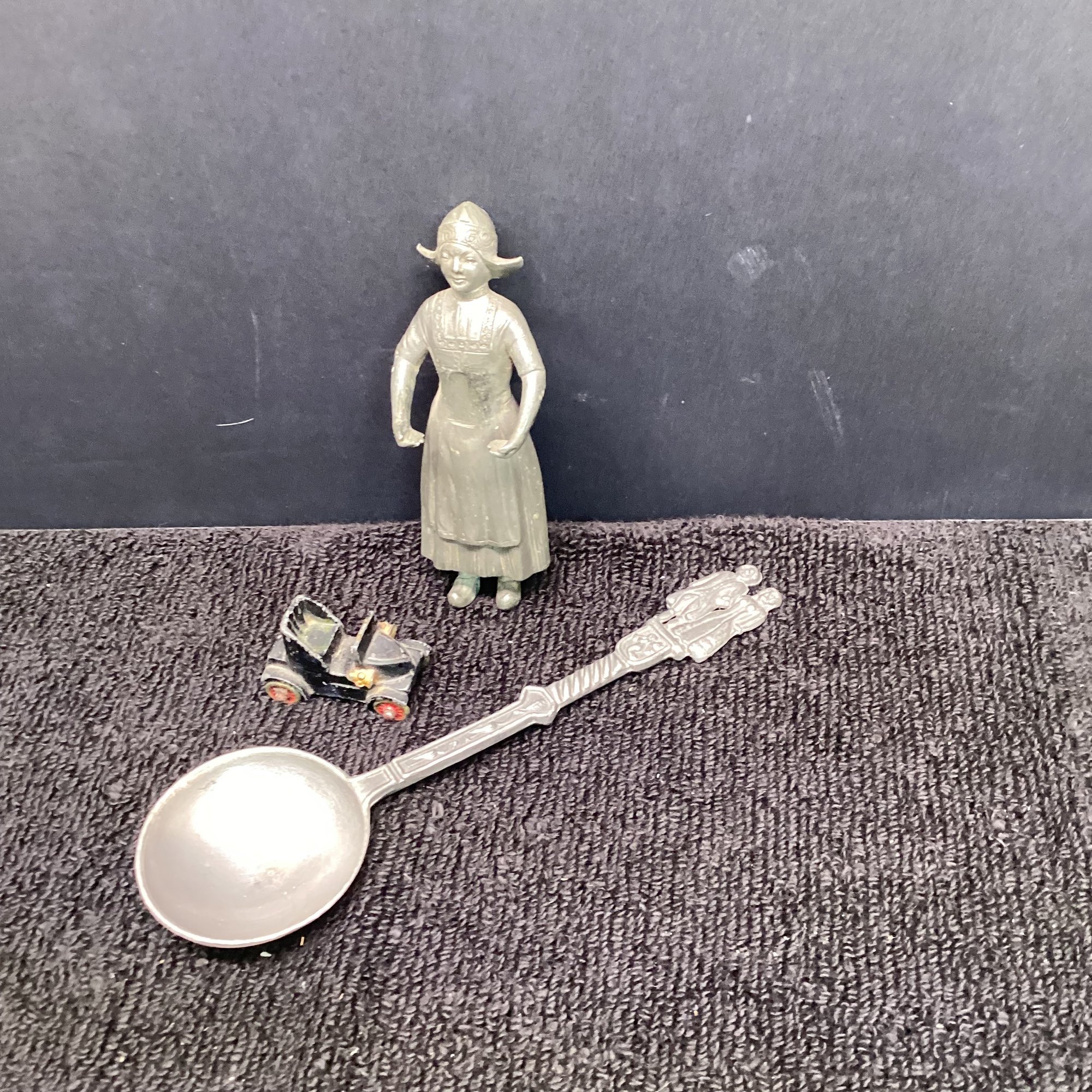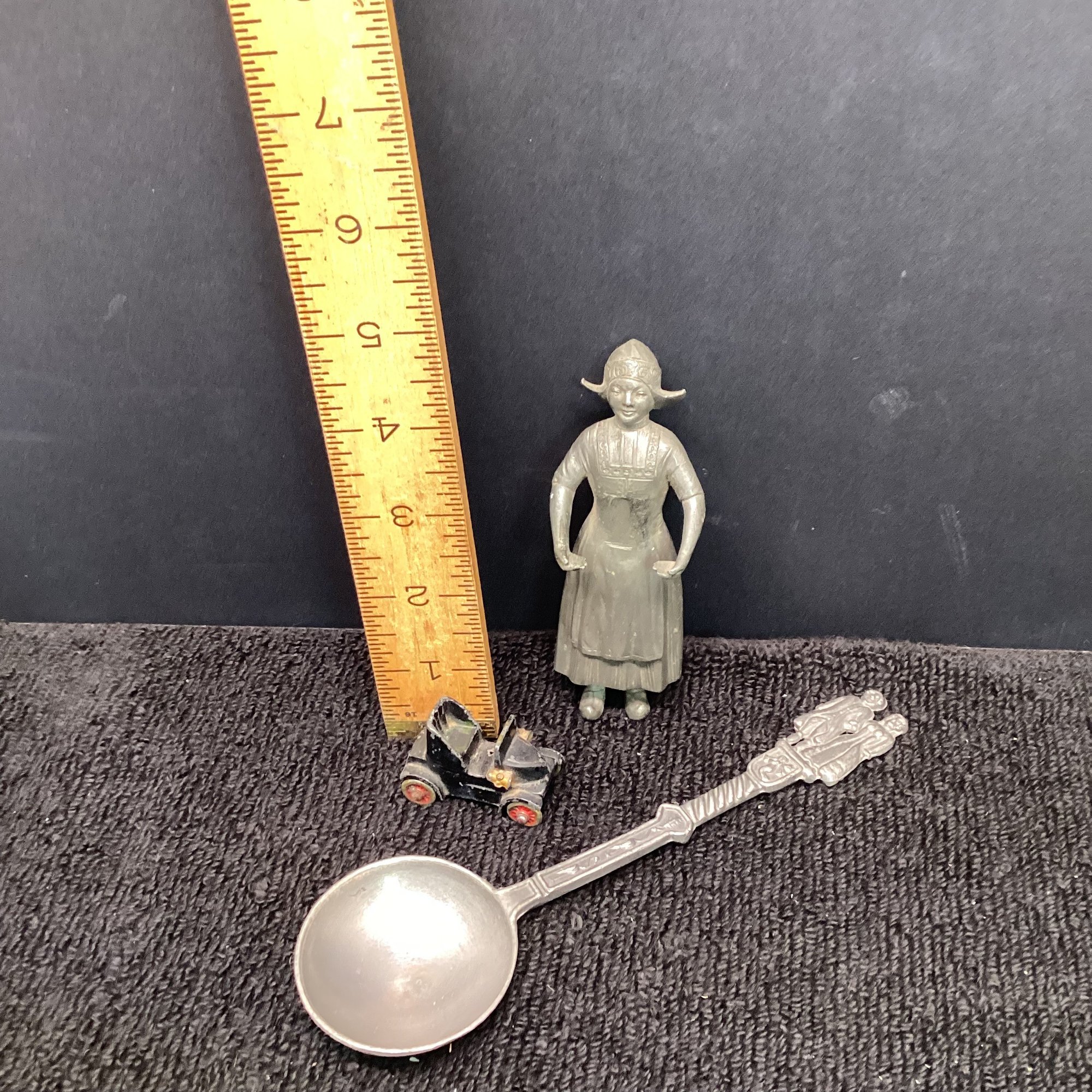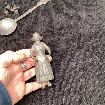 Vintage Solid Pewter Woman Figurine, Pewter Spoon And Metal Car