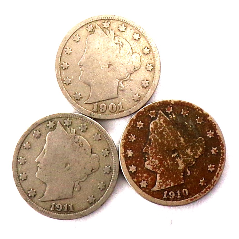 (3) Liberty Head V Nickels 1901, 1910 & 1911