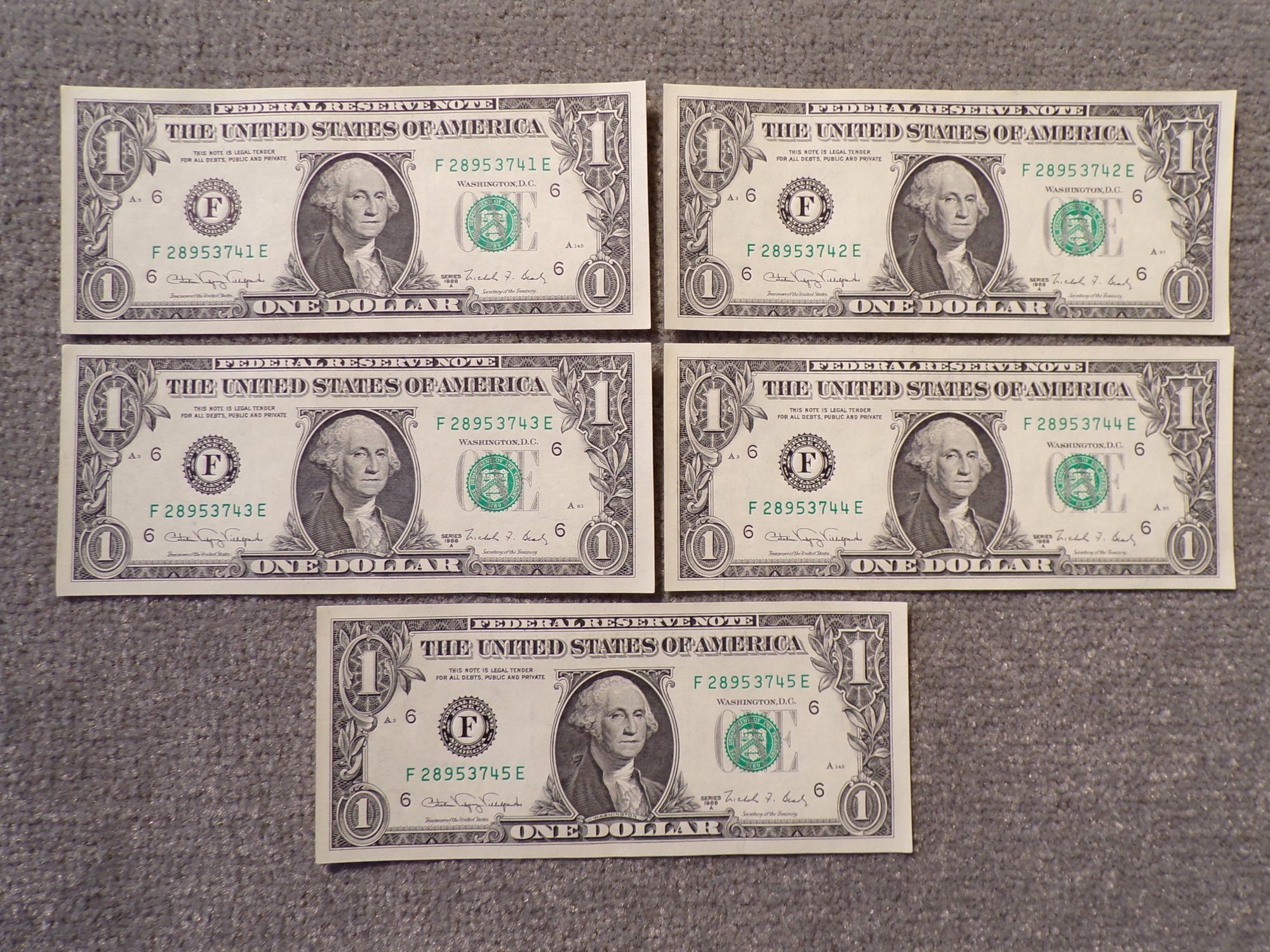 (5) Five Consecutive Serial Number 1988-A $1 Federal Reserve Notes Gem Crisp Uncirculated