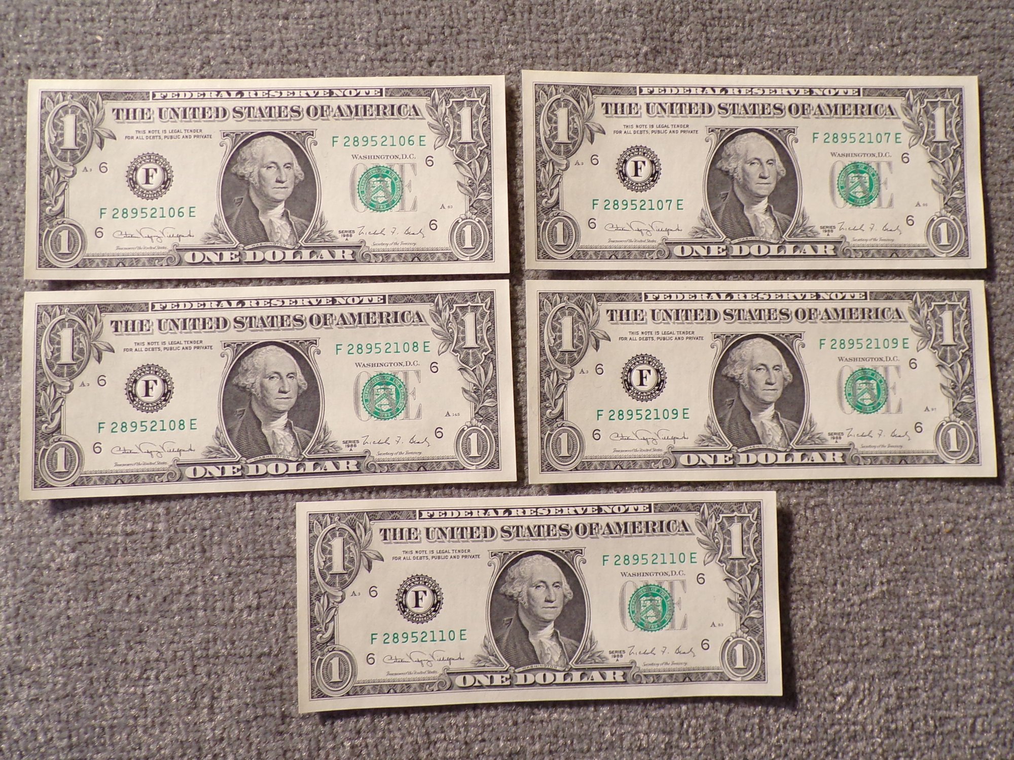 (5) Five Consecutive Serial Number 1988-A $1 Federal Reserve Notes Gem Crisp Uncirculated