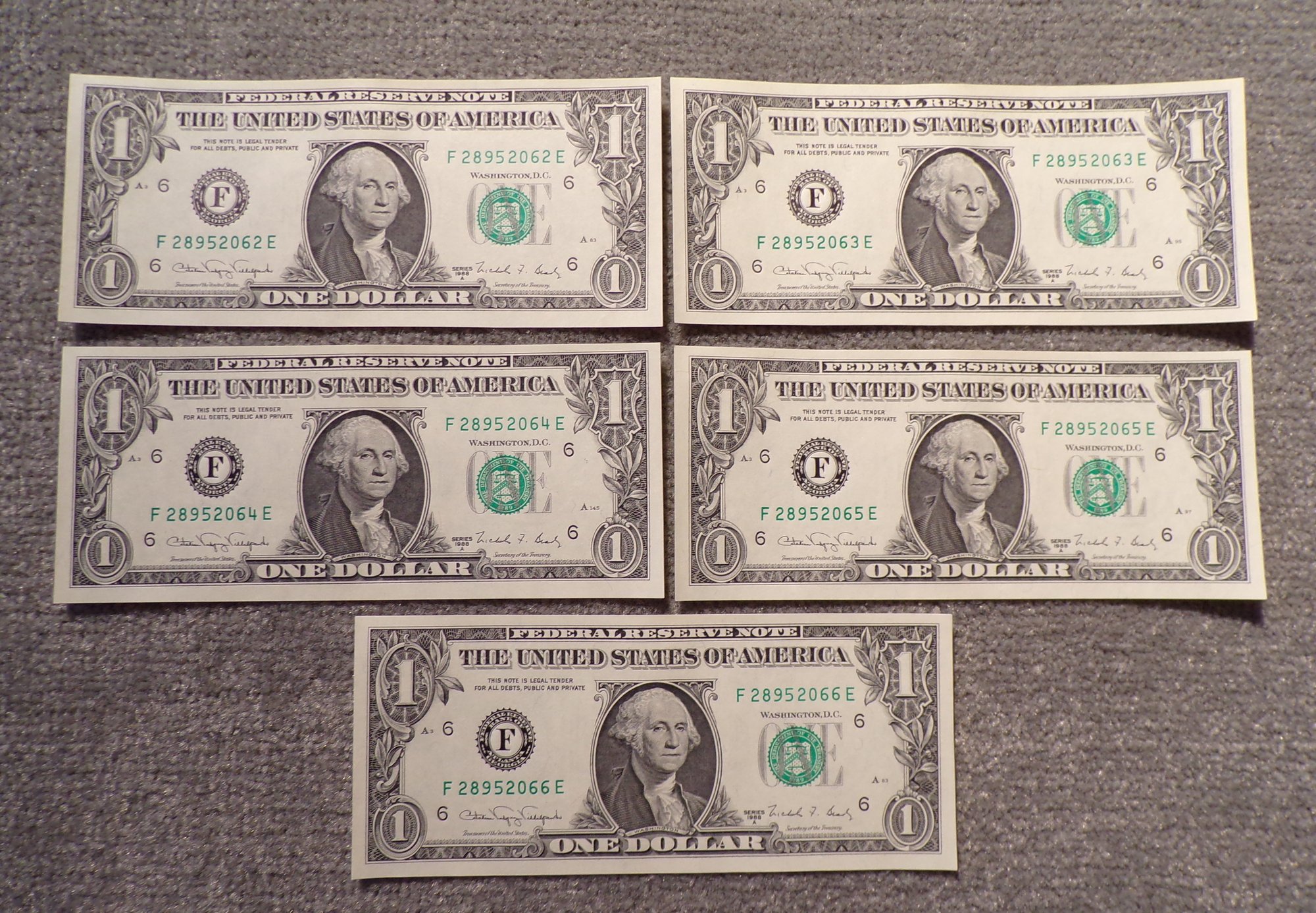 (5) Five Consecutive Serial Number 1988-A $1 Federal Reserve Notes Gem Crisp Uncirculated