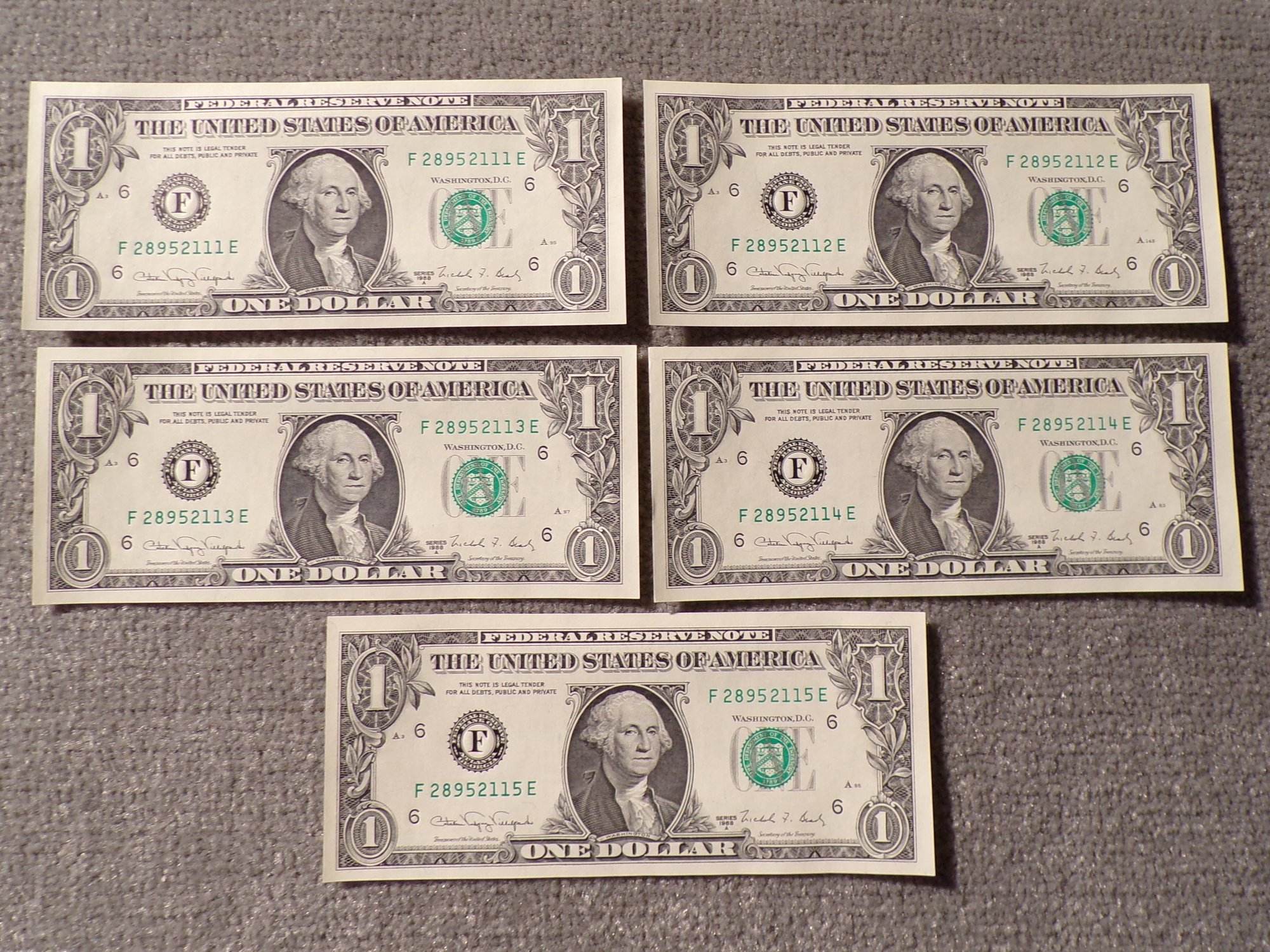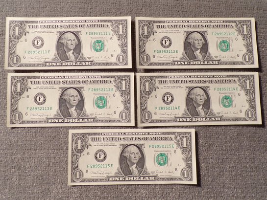 (5) Five Consecutive Serial Number 1988-A $1 Federal Reserve Notes Gem Crisp Uncirculated