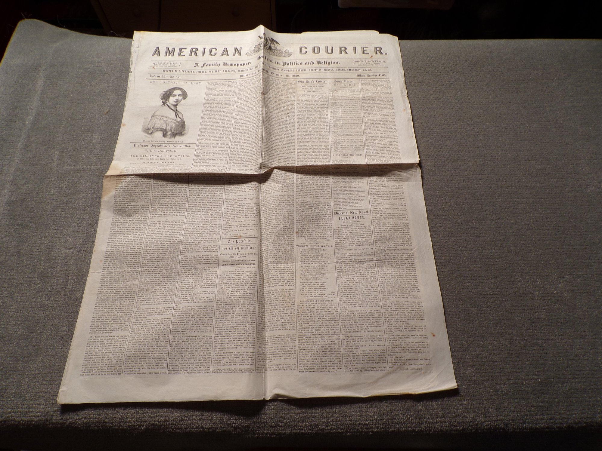 Authentic & Excellent Condition; Saturday December 18, 1852, American Courier "Philadelphia" Newspaper