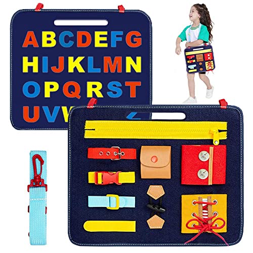 educational toys busy board for toddlers, Montessori basic skills toddler activity board for fine motor skills & learn to dress, opens into a pouch and comes with a carrying strap