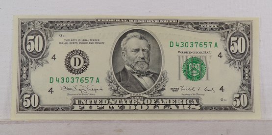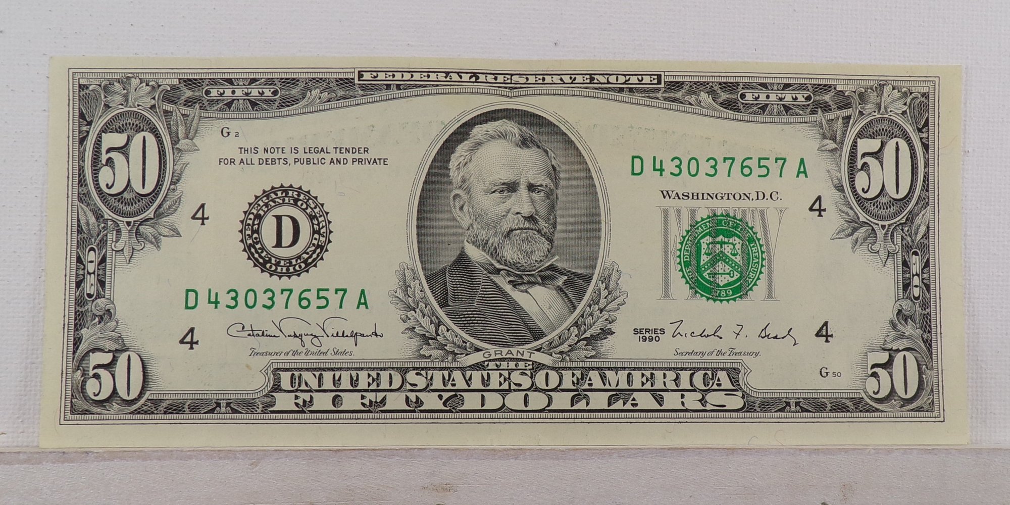 Error "Faulty Alignment, Very Scarce Both Sides" 1990 $50 Federal Reserve Note, GEM Uncirculated