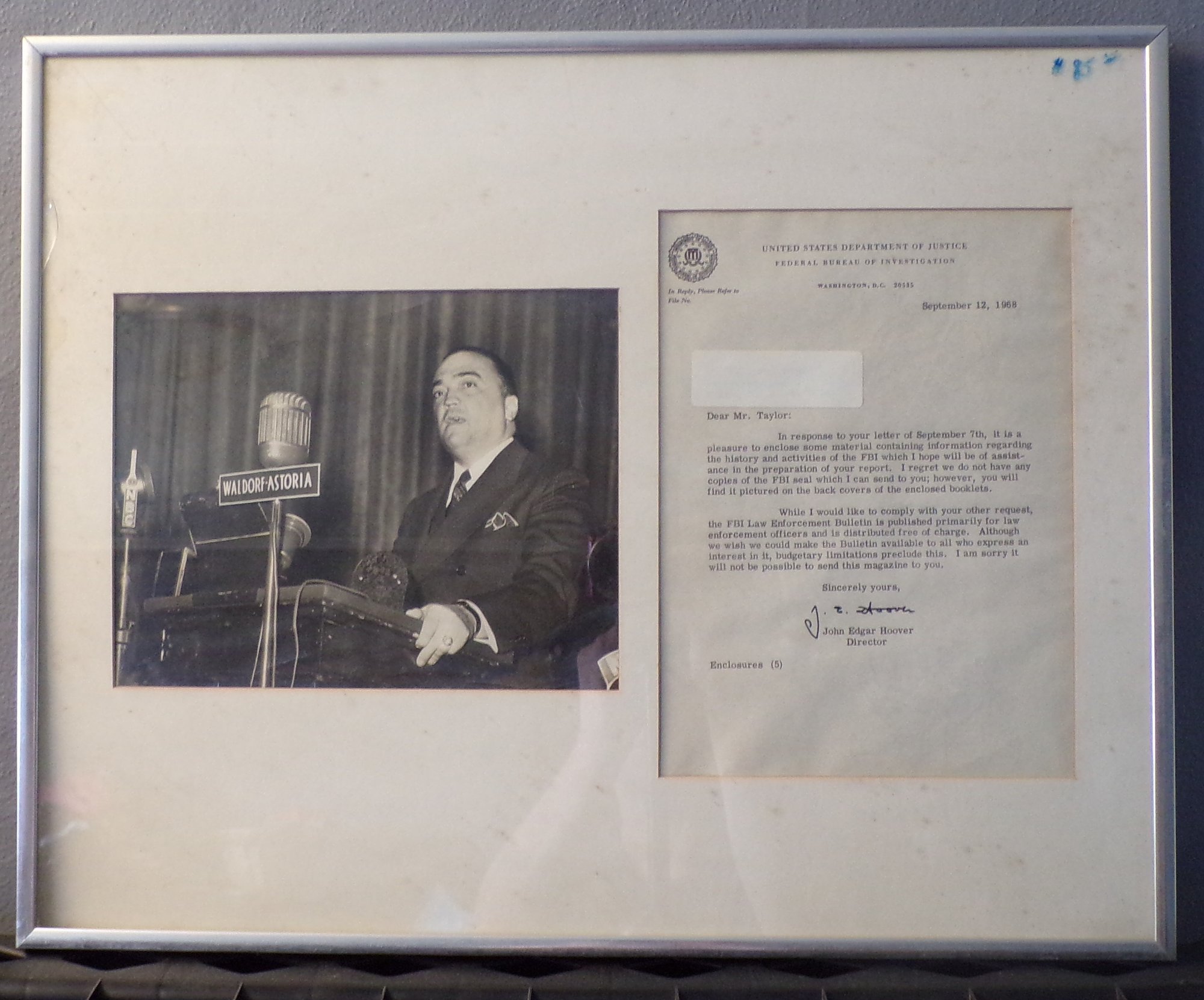 Large Framed Picture Of FBI Director J. Edgar Hoover & Signed Letter Dated 9-12-1968