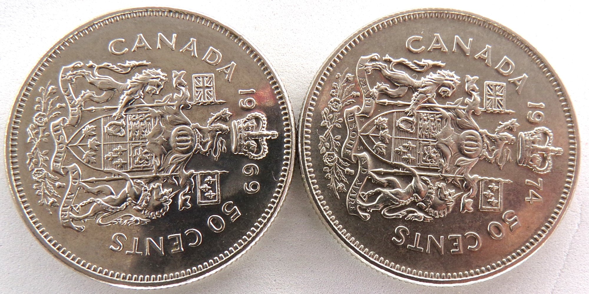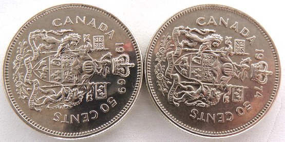 Two Canadian Half Dollars, 1969 & 1974 BU