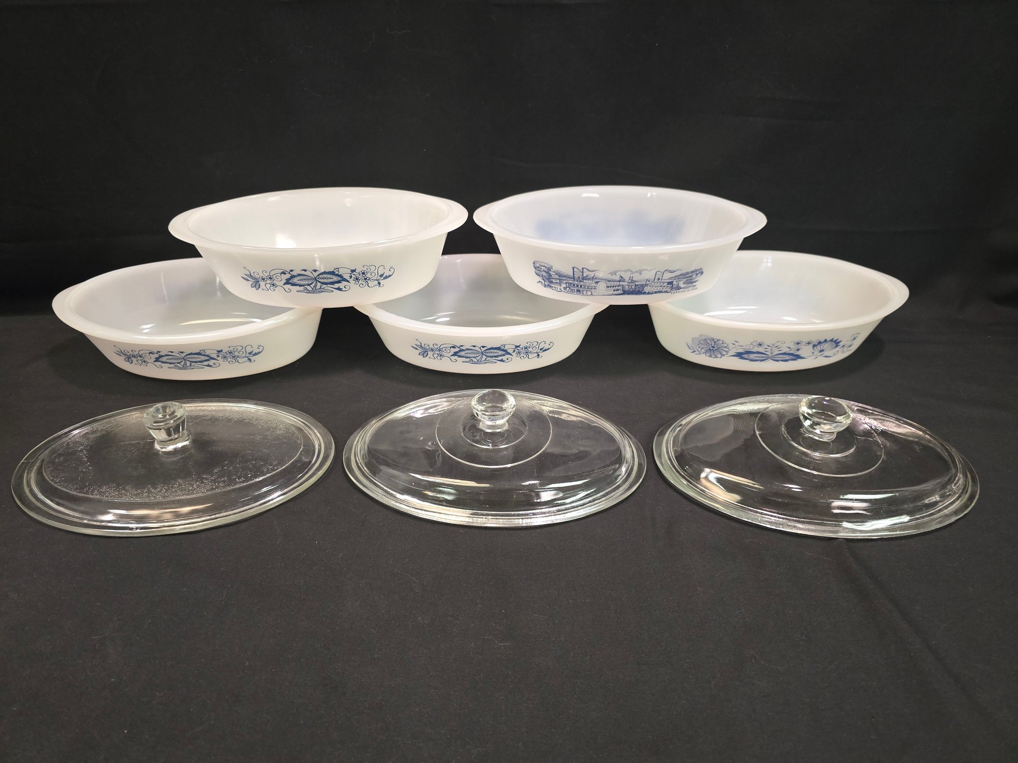 5- J-235 1 Qt. dishes (4 of one pattern) *one of the 4 has minor chipping on one handle, as photographed.