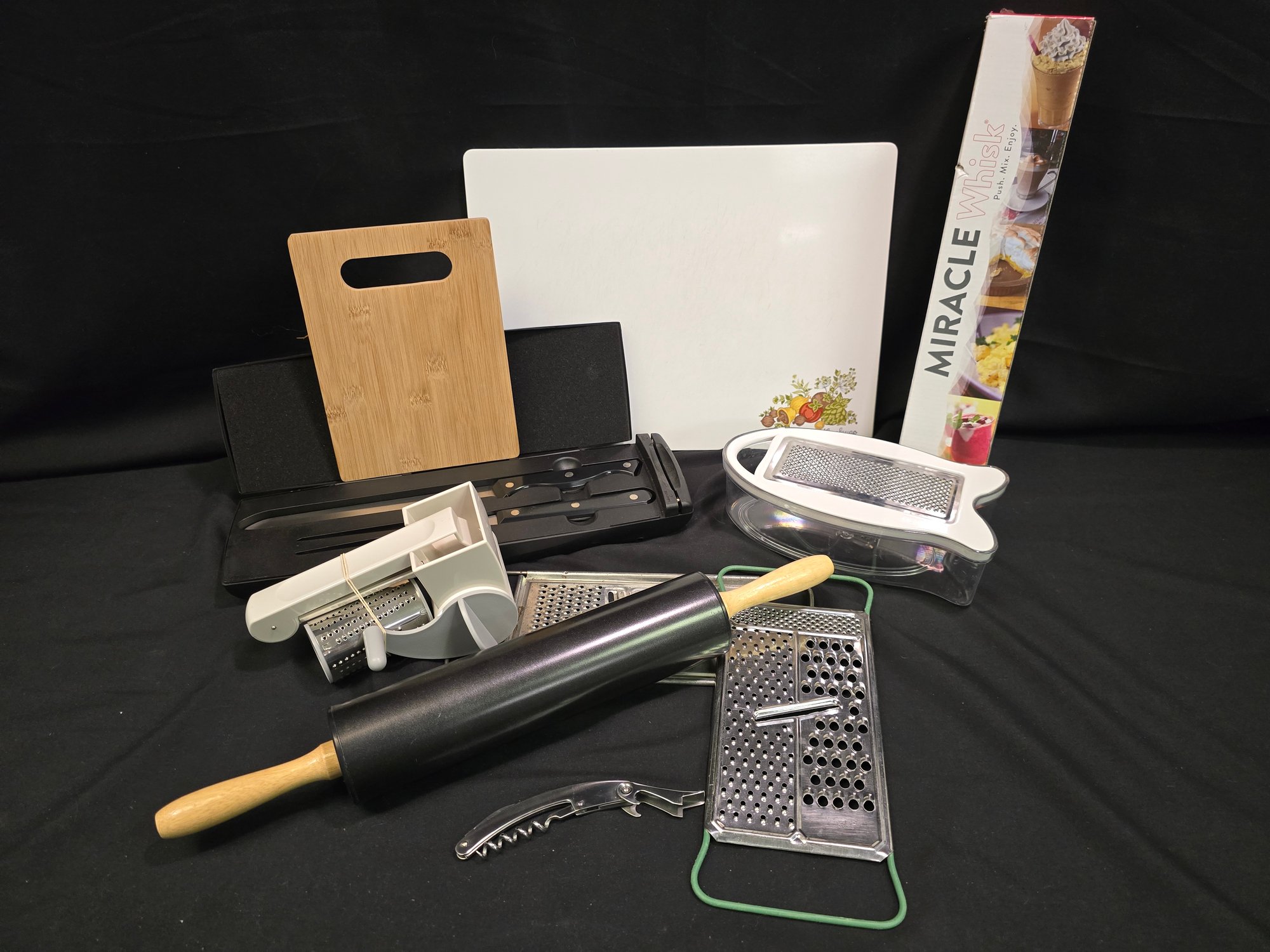 Corning cutting board, Pampered Chef carving set, vintage graters, etc.