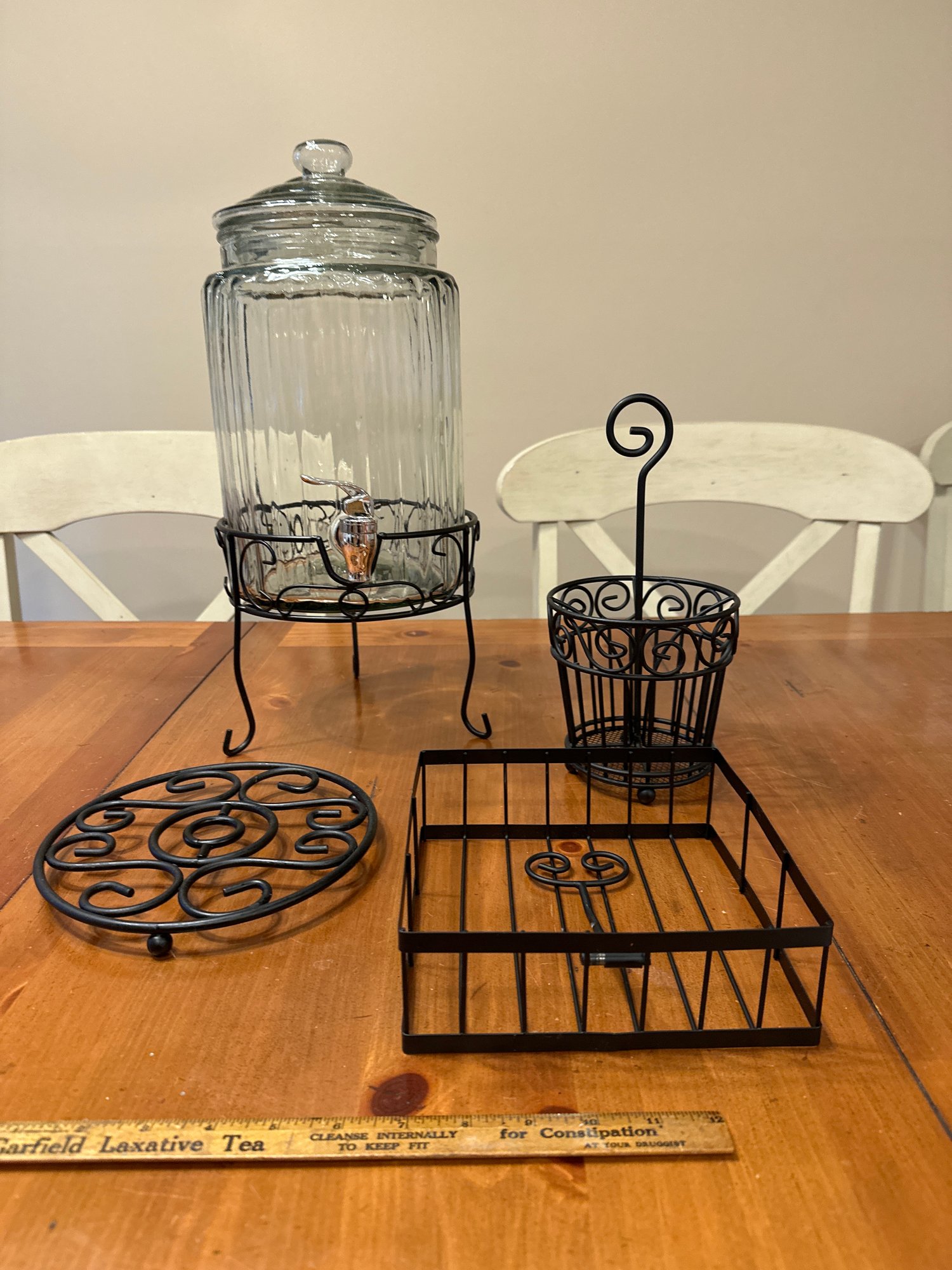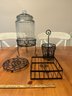 Party, Entertaining Lot, Cold Beverage Dispenser On Metal Stand, Utensil Holder, Napkin Holder And Trivet