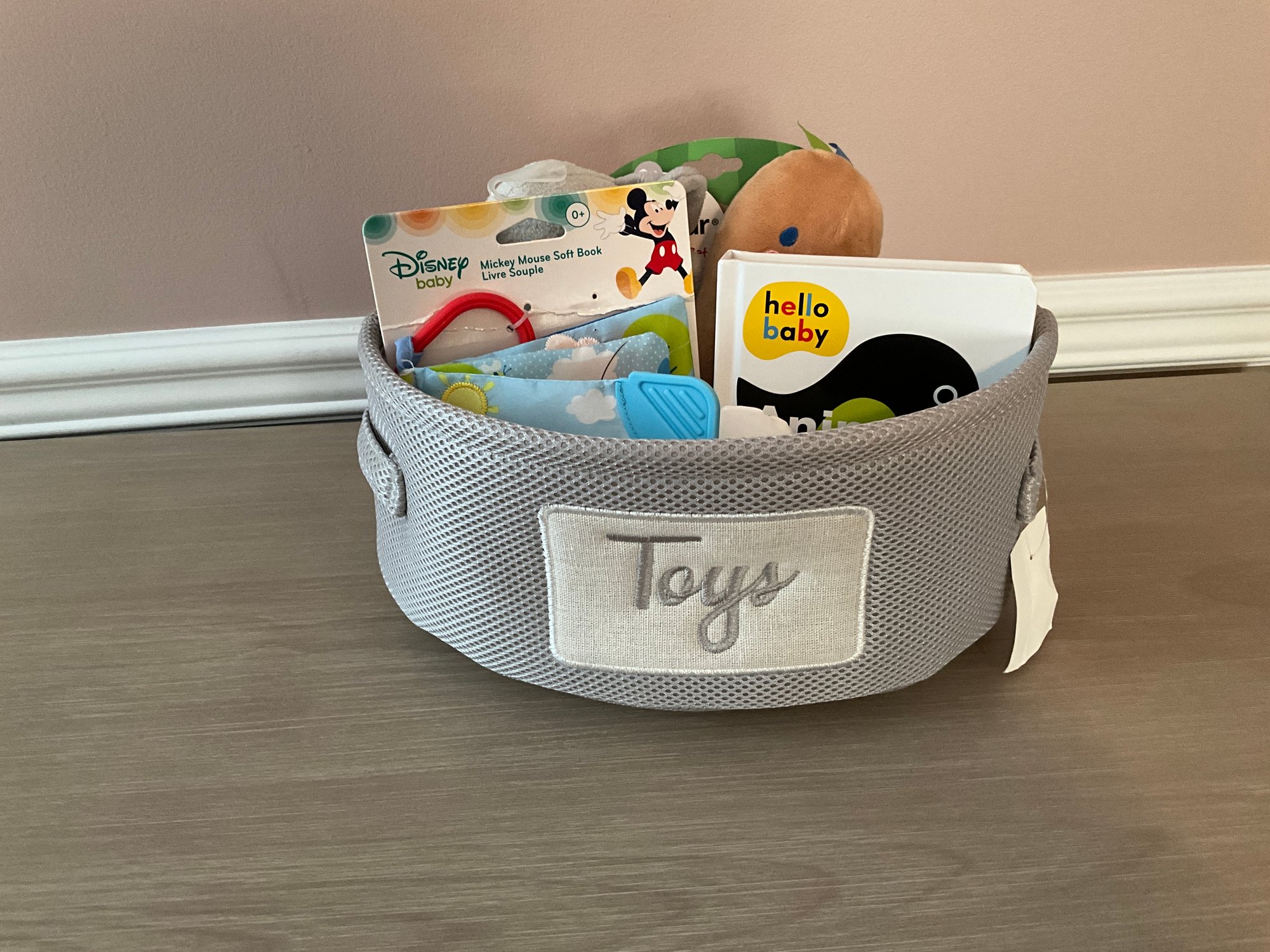 Cute Gray Nursery Toy Basket Filled With New Toys And A Book