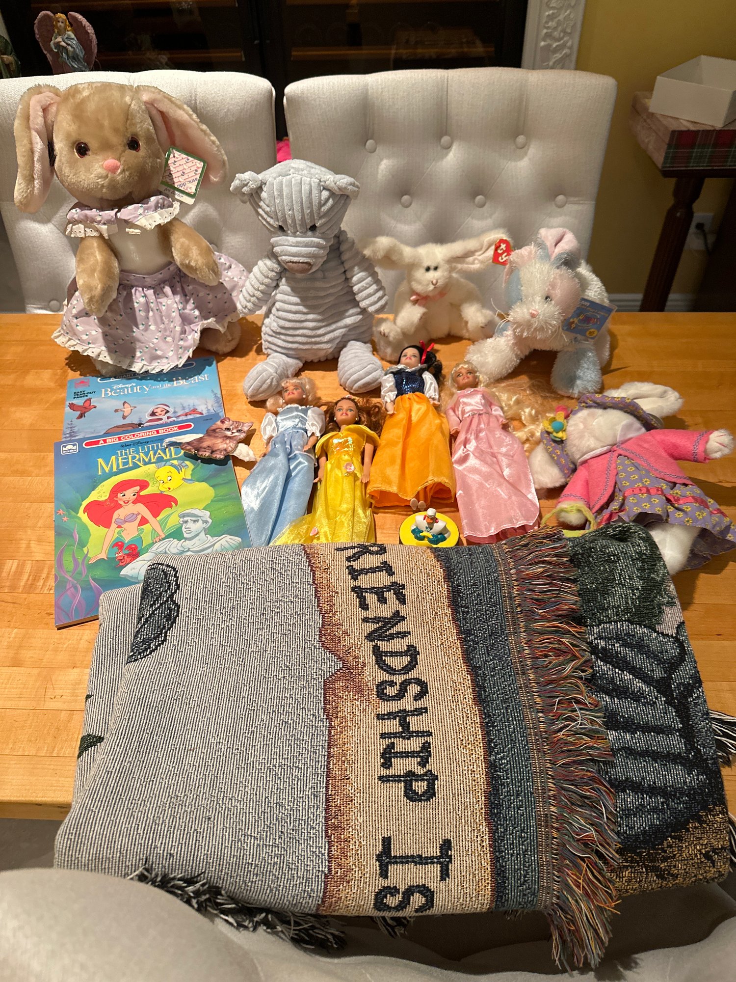 Kids Toy Lot Stuffed Animals, Barbies, Coloring Books, Boyds Bear Throw Blanket See Photos