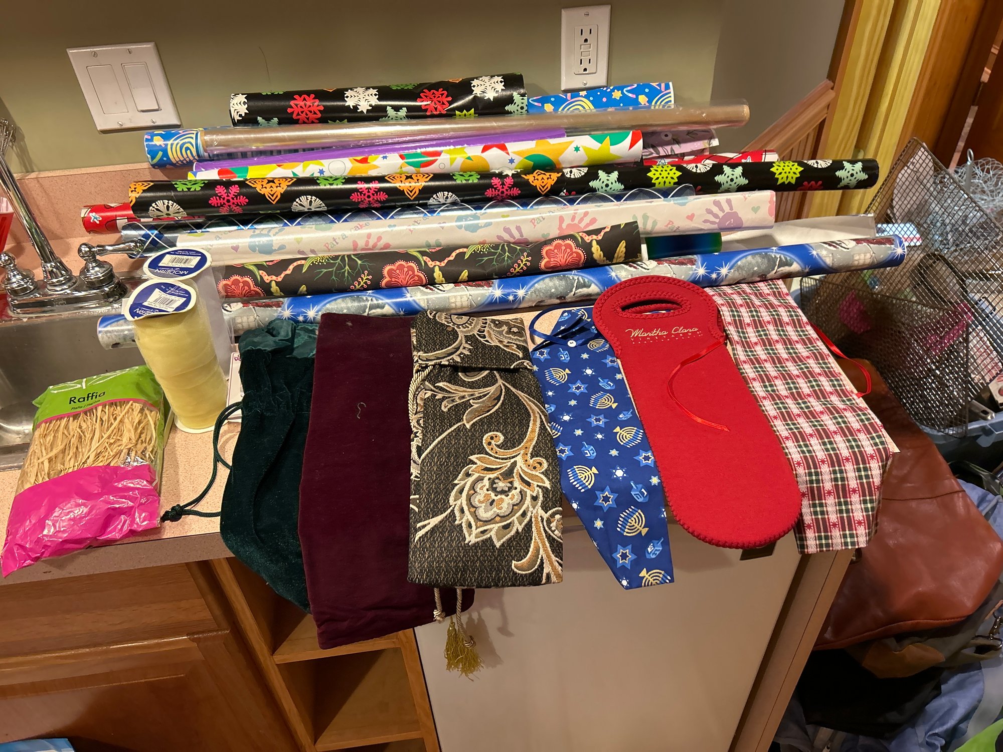 Large Assortment Of Wrapping Paper With Gift Wrapping Material And An Assortment Of Wine Bottle Sleeves