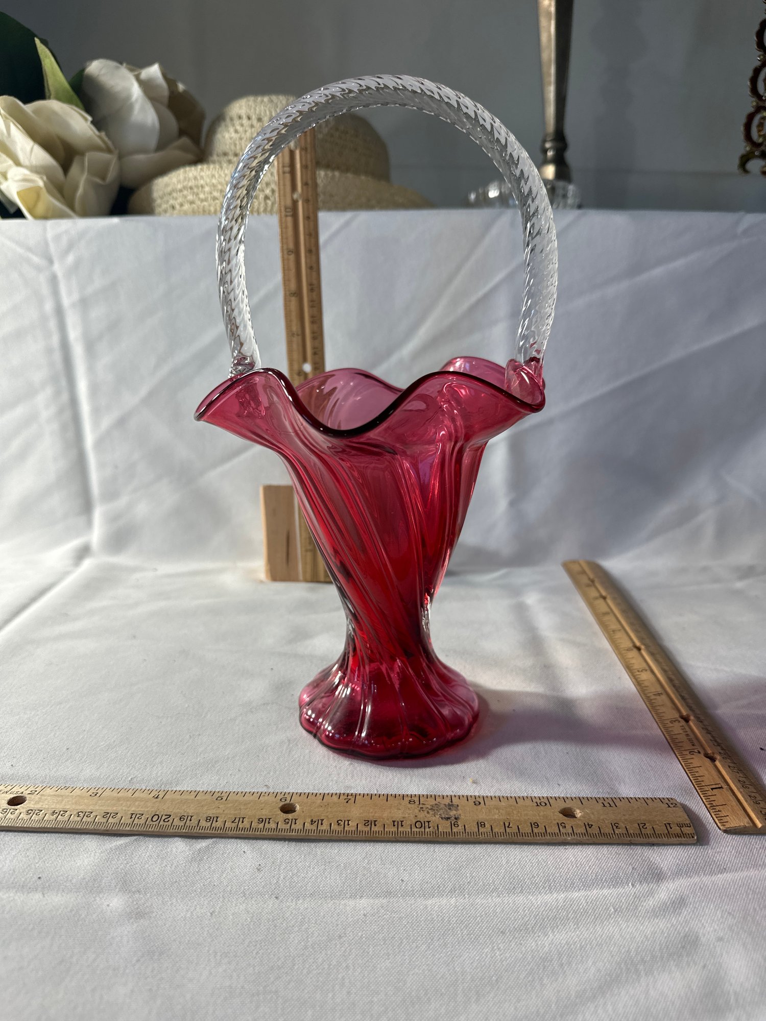 Ruby Red Fenton Glass Basket Clear Handle Ruffled Rim 11.4" Tall