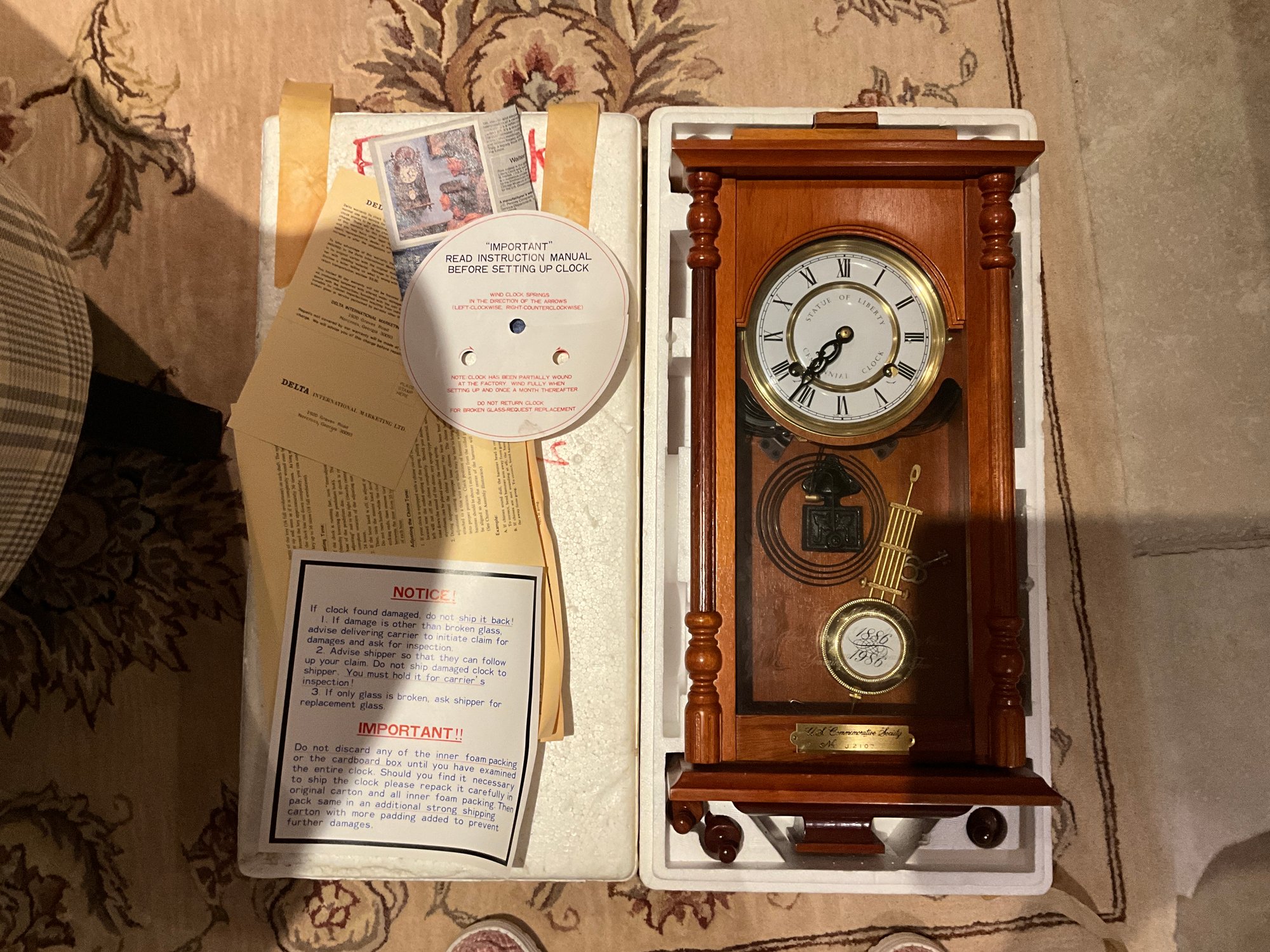 Statue Of Liberty Centennial Pendulum Wall Clock In Styrofoam With Paperwork