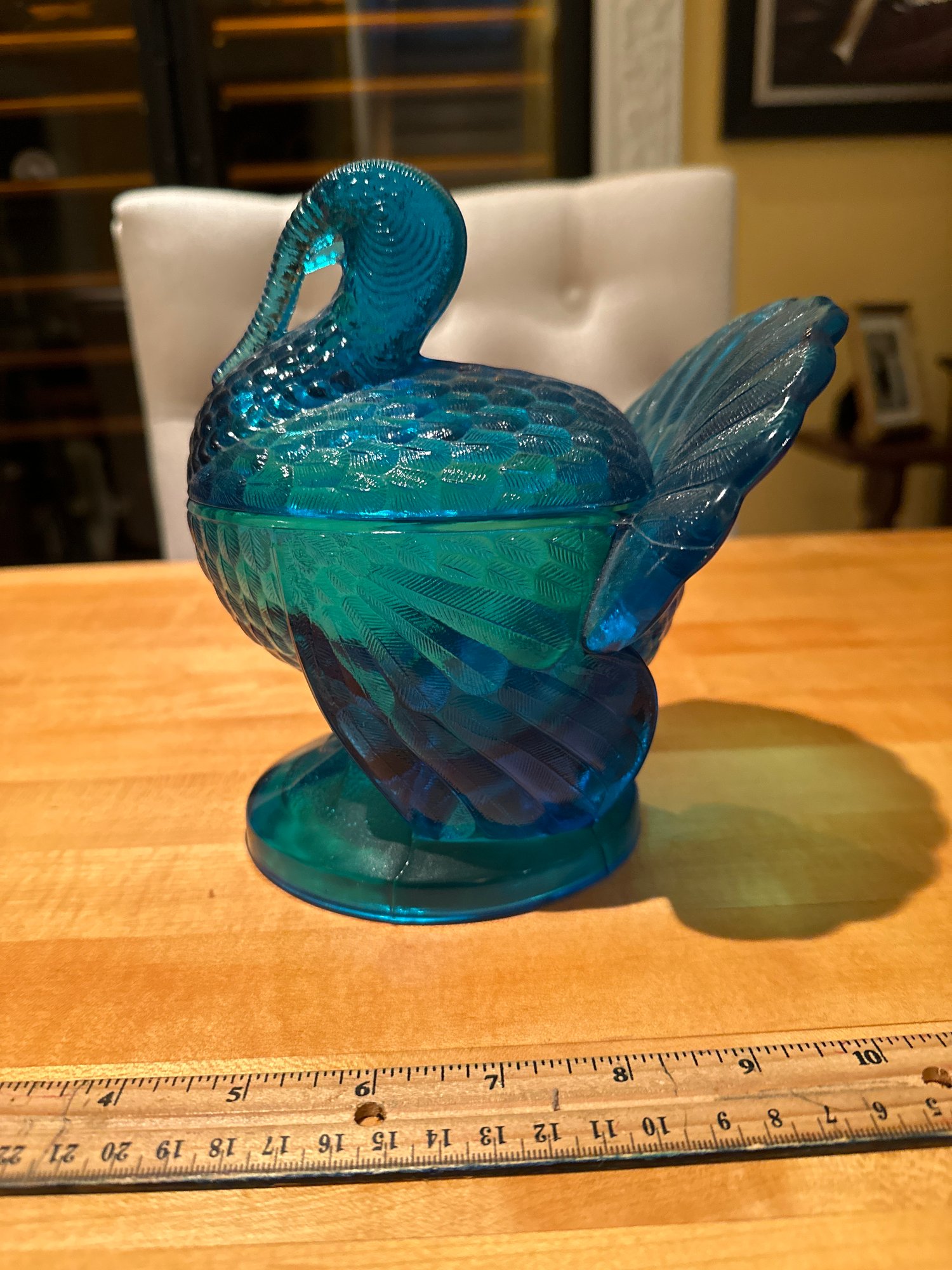 Vintage Aqua Blue Glass Turkey Lidded Candy Dish By L.E. Smith Glass Company