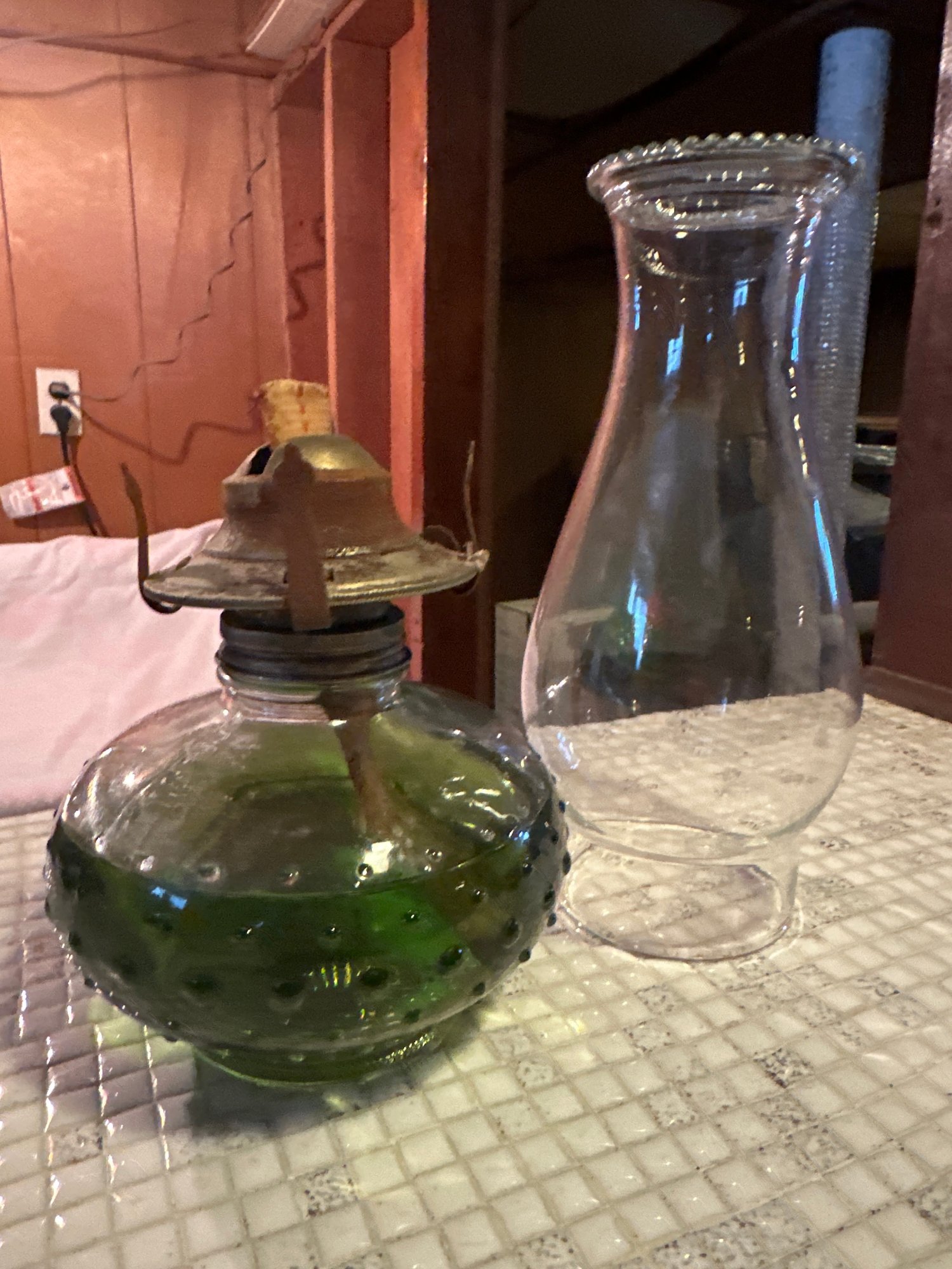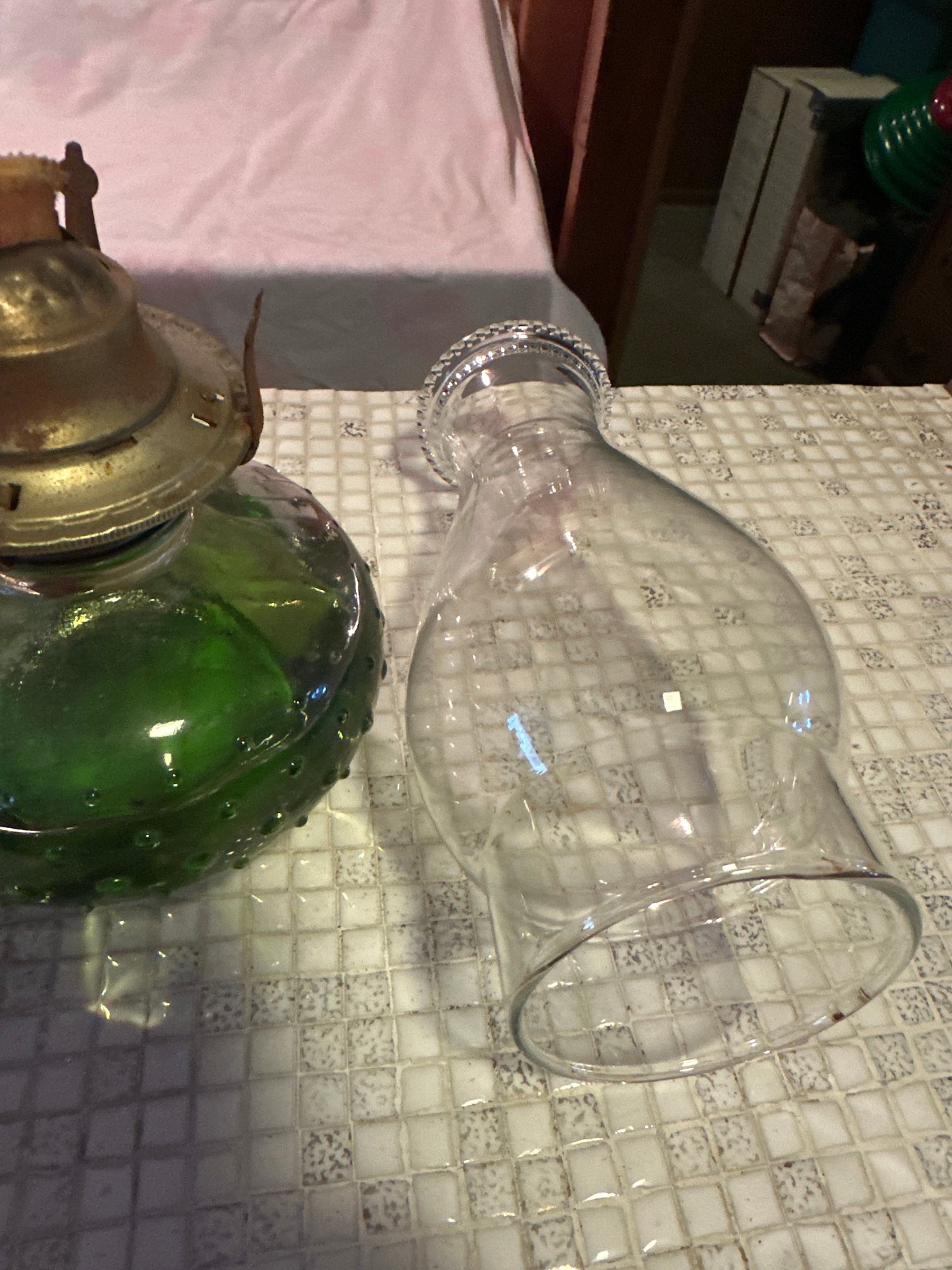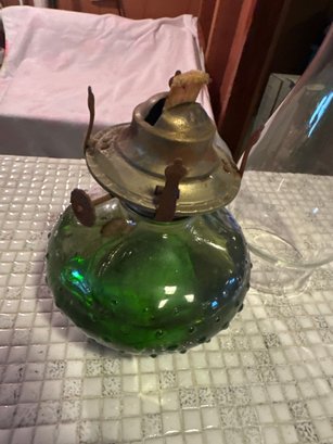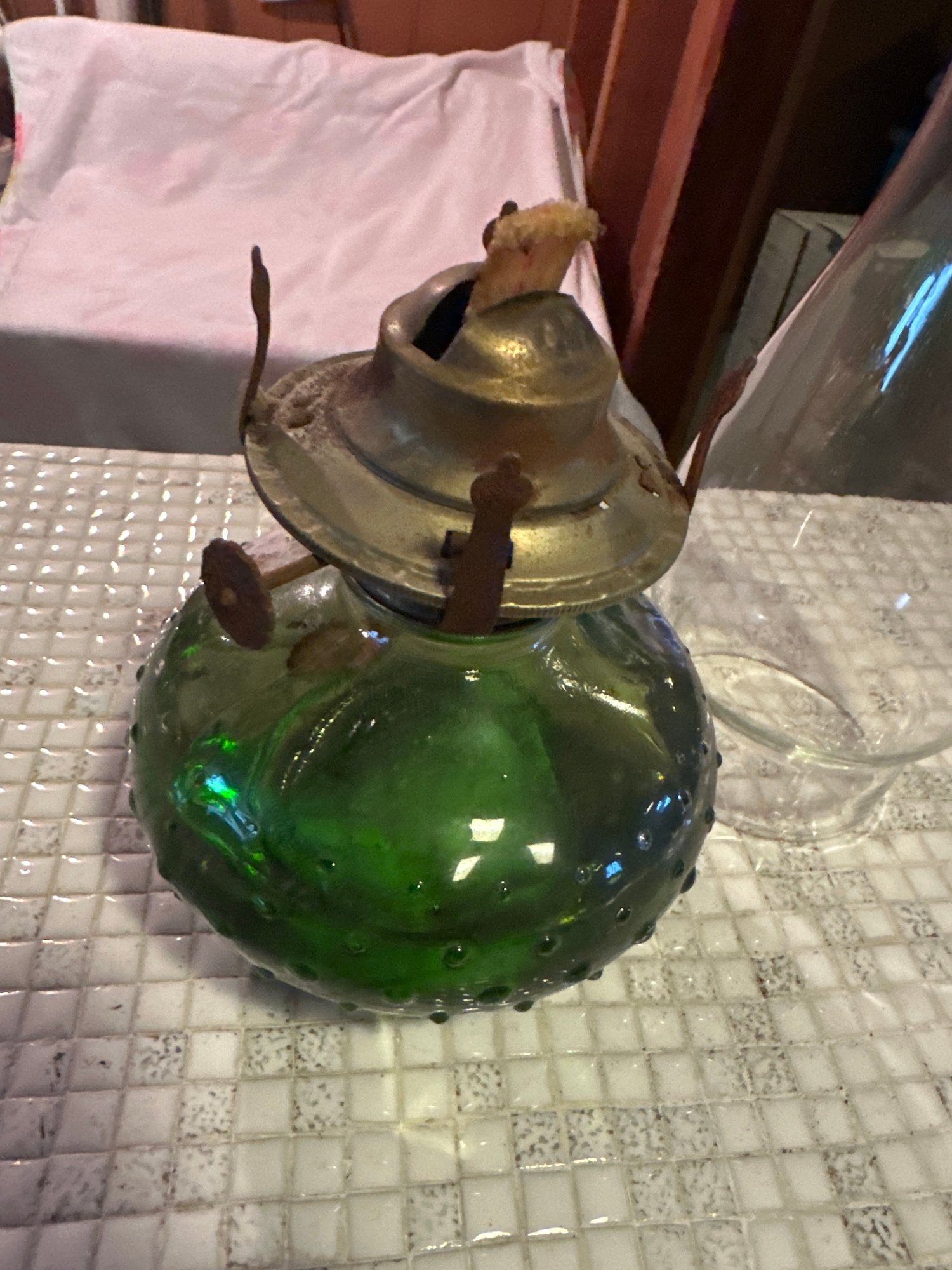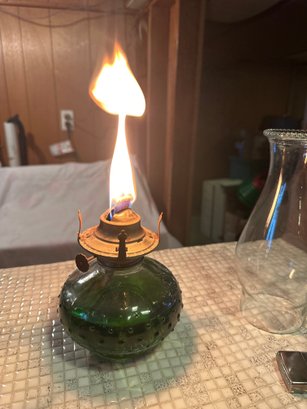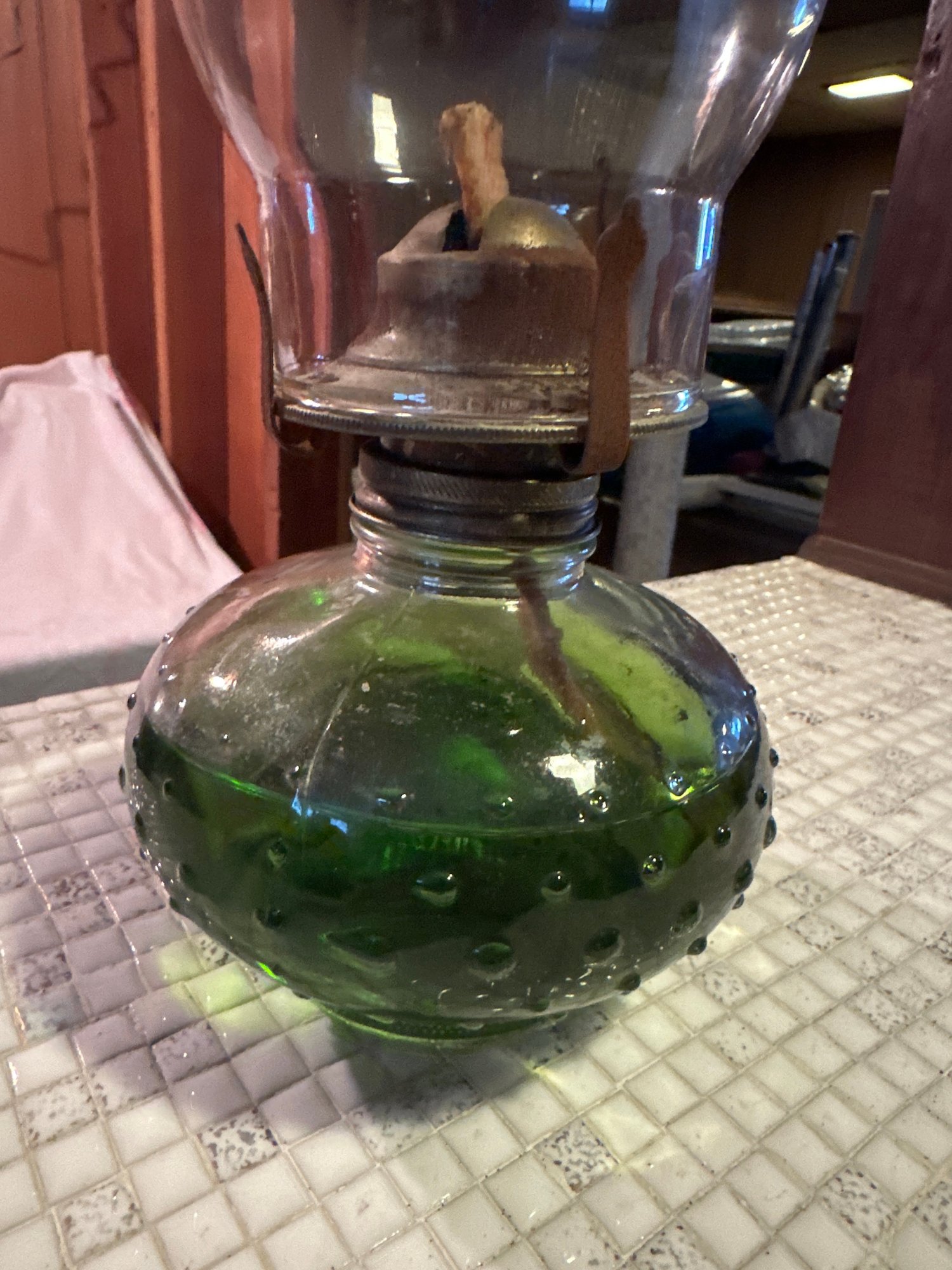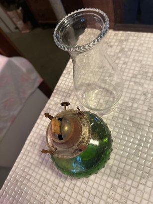 Vintage Green Oil Lamp 13 1/2 In Tall In Great Condition Works Great