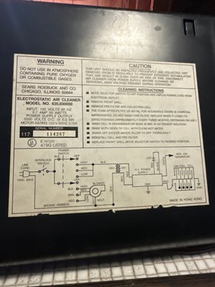 Vintage Sears And Roebucks Electrostatic Air Cleaner Model Num 635-830000 Works On High And Med Speed