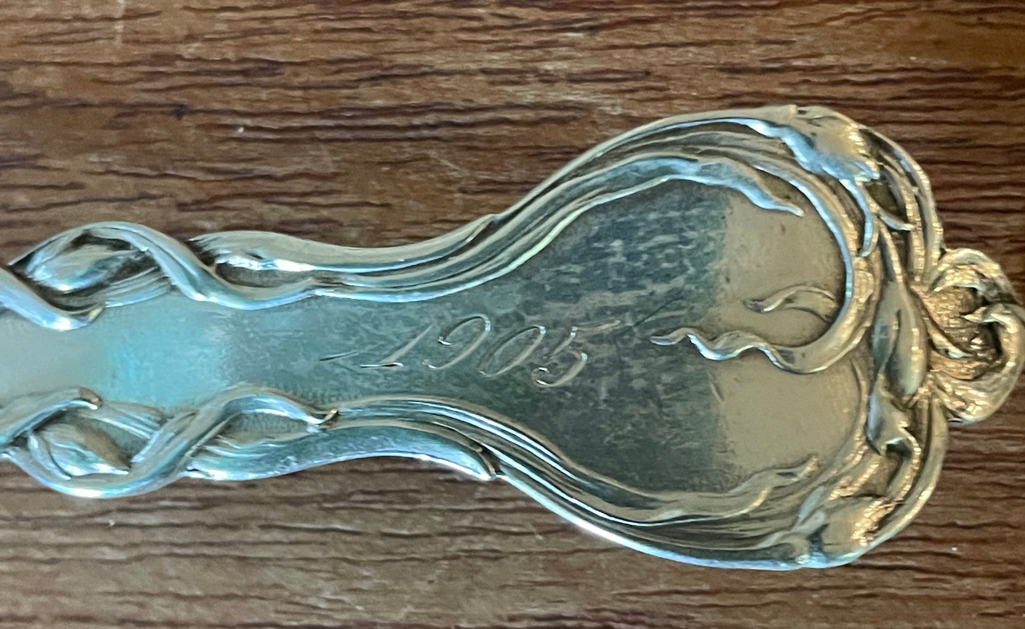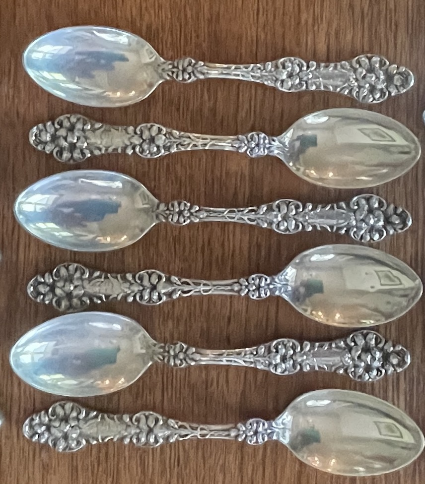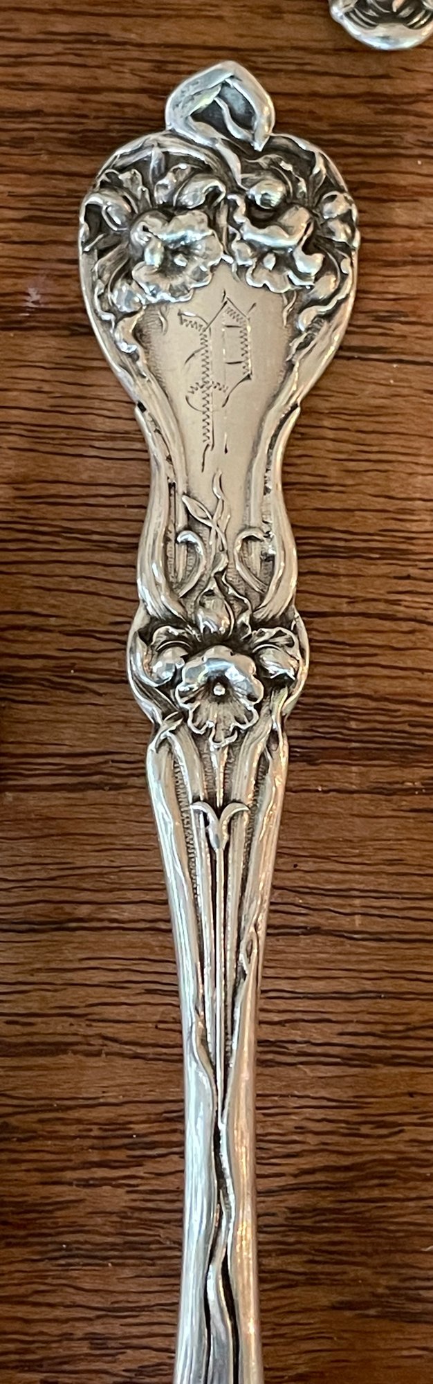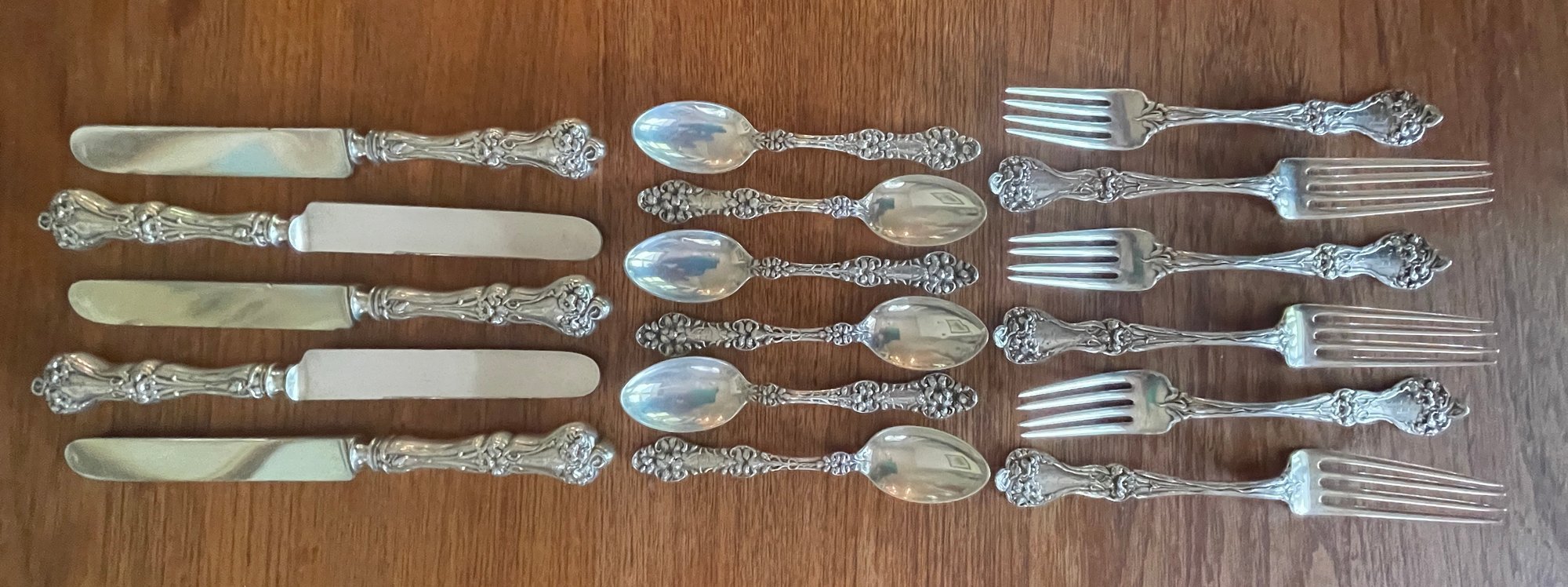 6 dinner forks, 6 small spoons, 5 knives. Solid sterling pieces weight roughly 366g. Knives weight roughly 290g. 656g total. All are monogrammed with P. Knives & forks are marked 1905 on the back.