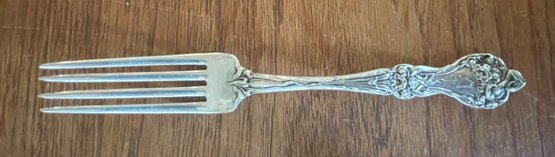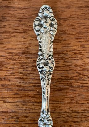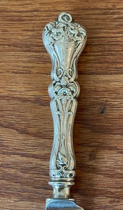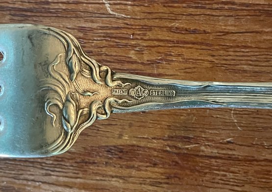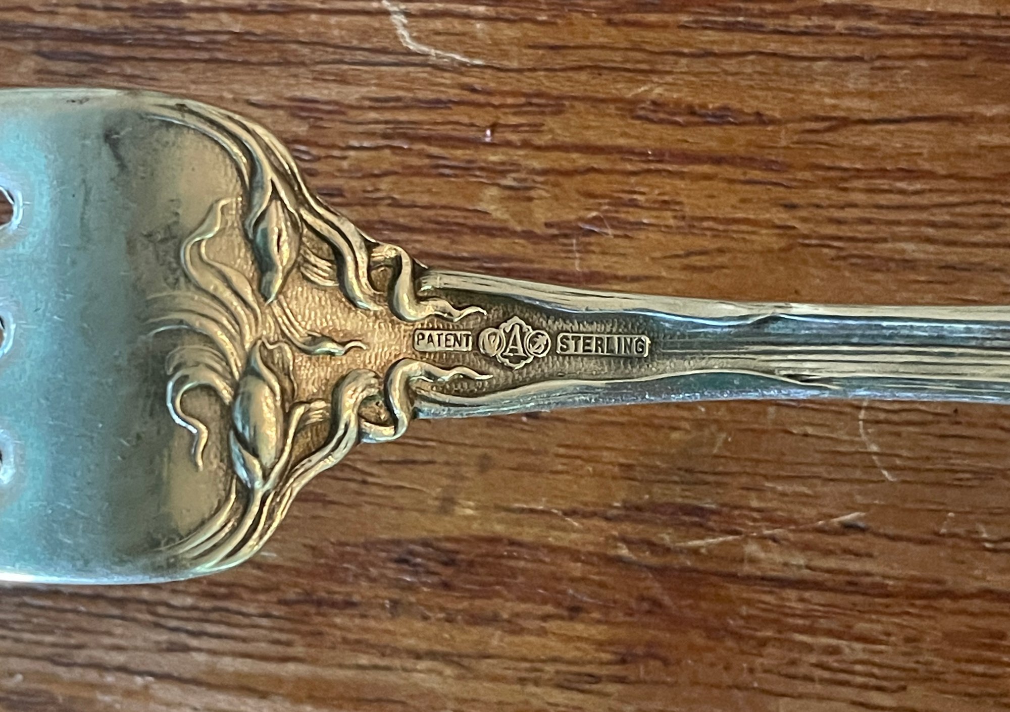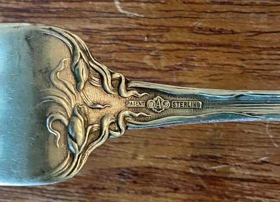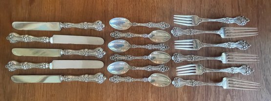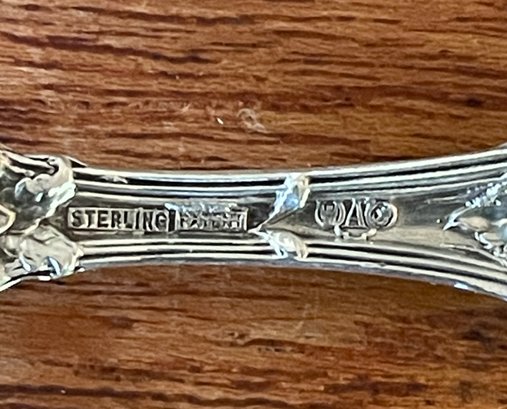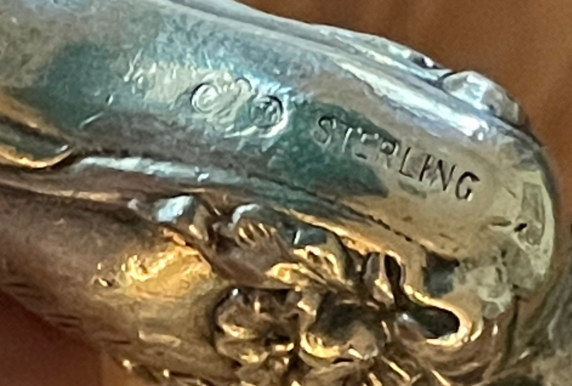 6 dinner forks, 6 small spoons, 5 knives. Solid sterling pieces weight roughly 366g. Knives weight roughly 290g. 656g total. All are monogrammed with P. Knives & forks are marked 1905 on the back.