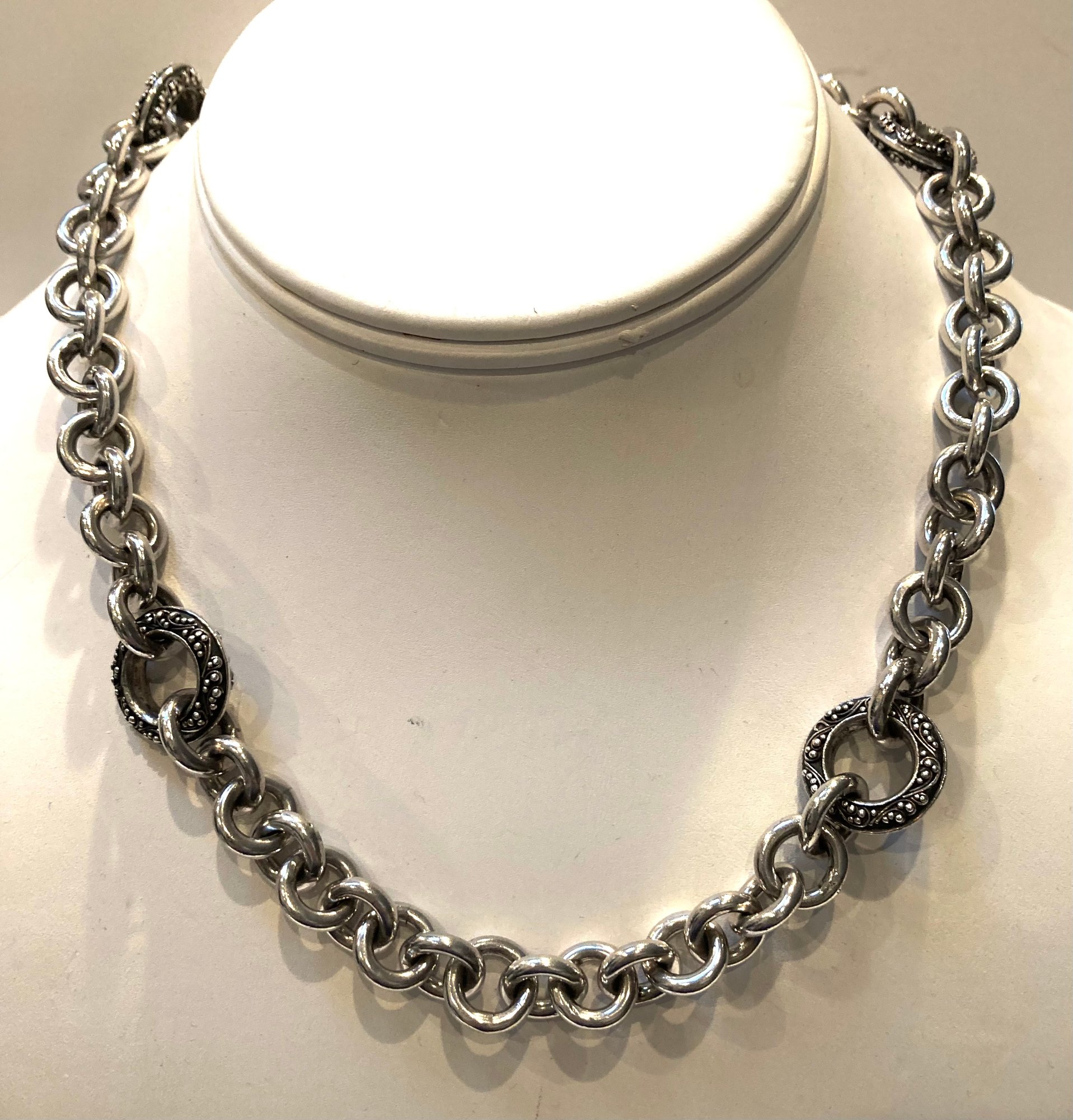 Beautiful sterling silver Lois Hill chocker measures 17.5”. It has a toggle closure and four round marcasite stations. Weighs a hefty 110 grams.