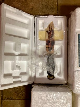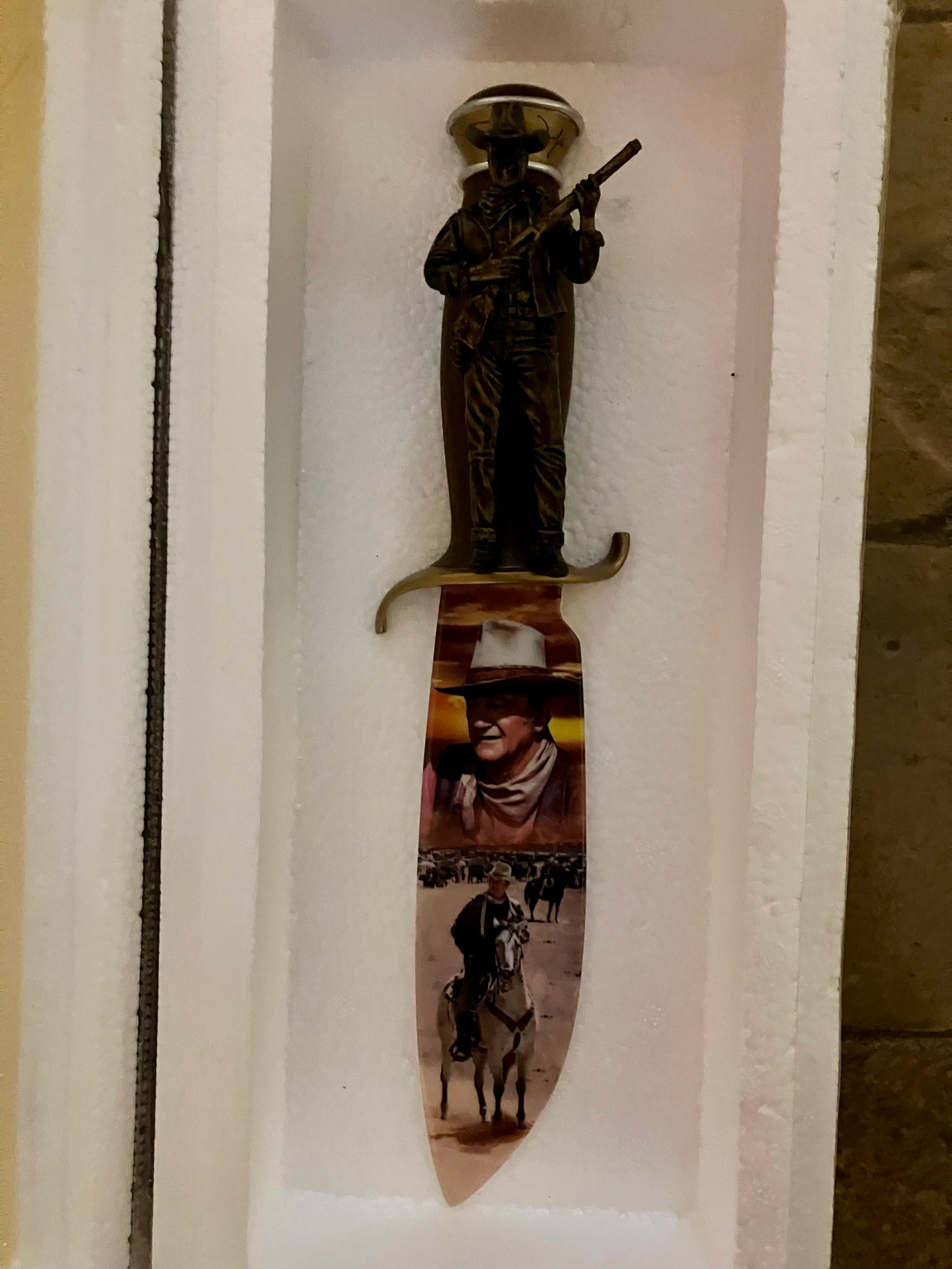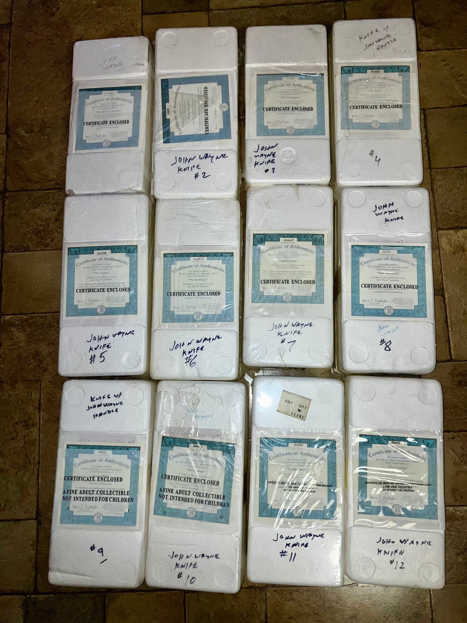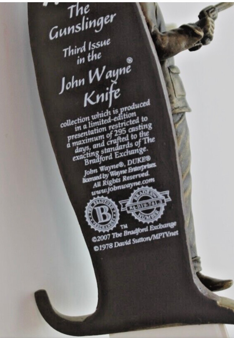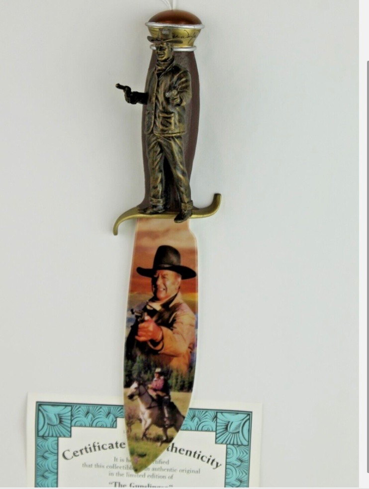 Bradford Exchange John Wayne Collector Complete Set Of 12 Knives - In Boxes w/COAS! Each replica knife's hand-painted handle is decorated with a highly realistic and handcrafted bronzed dimensional relief of John Wayne, striding boldly and fearlessly into action. These knives are distinct portraits of the Duke's movie career. A super nice addition to your Duke Collection. Each knife measures 10 1/2" long.