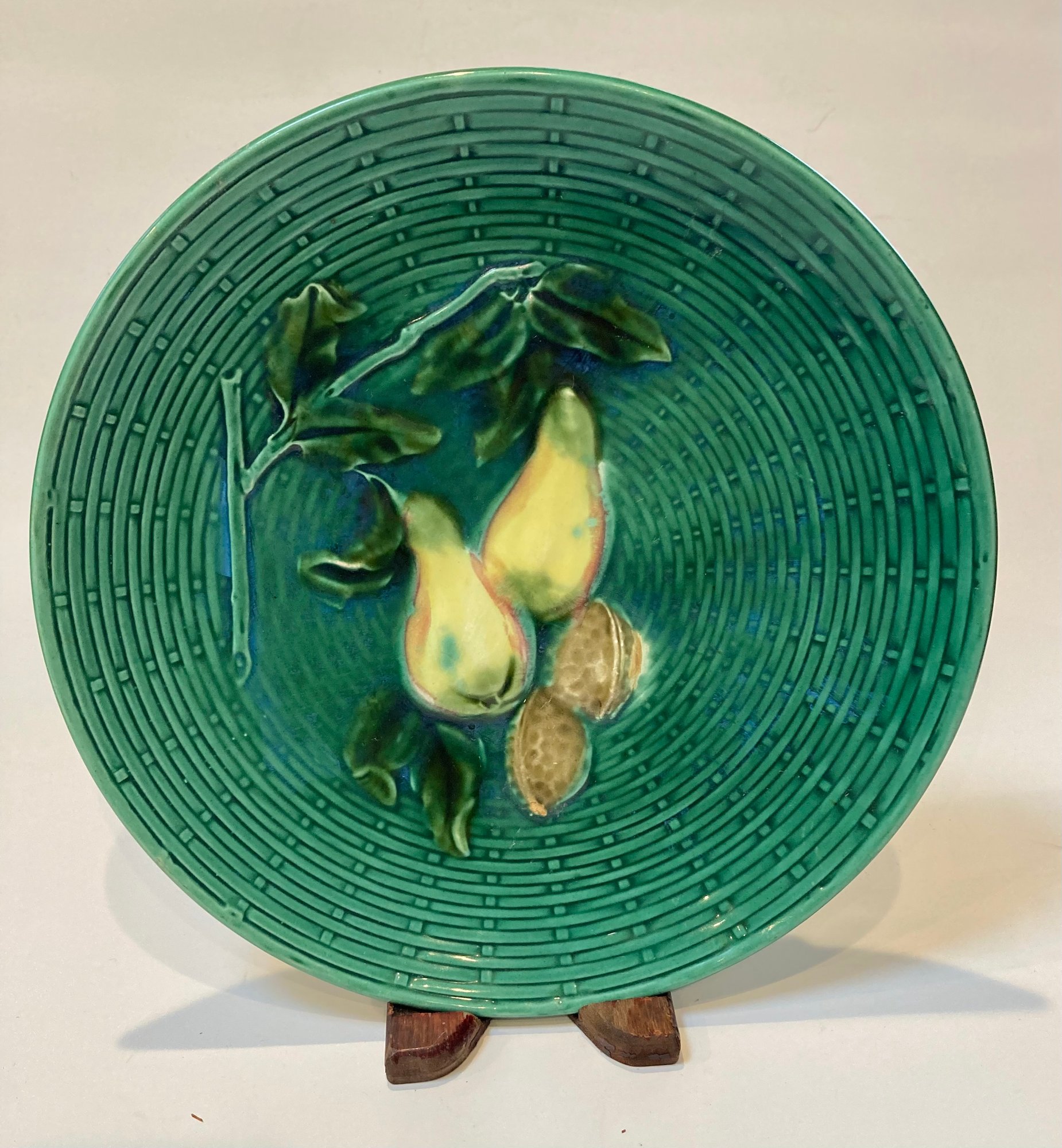 Lovely dark green majolica plate with bas relief yellow pears and nuts on a basketweave background. The plate was manufactured in Germany by Georg Schmider Zell in the late 19th or early 20th century. Plate measures 9 1/8” in diameter. No crazing but there is a small chip on the rim. Please see the photos for clarification.