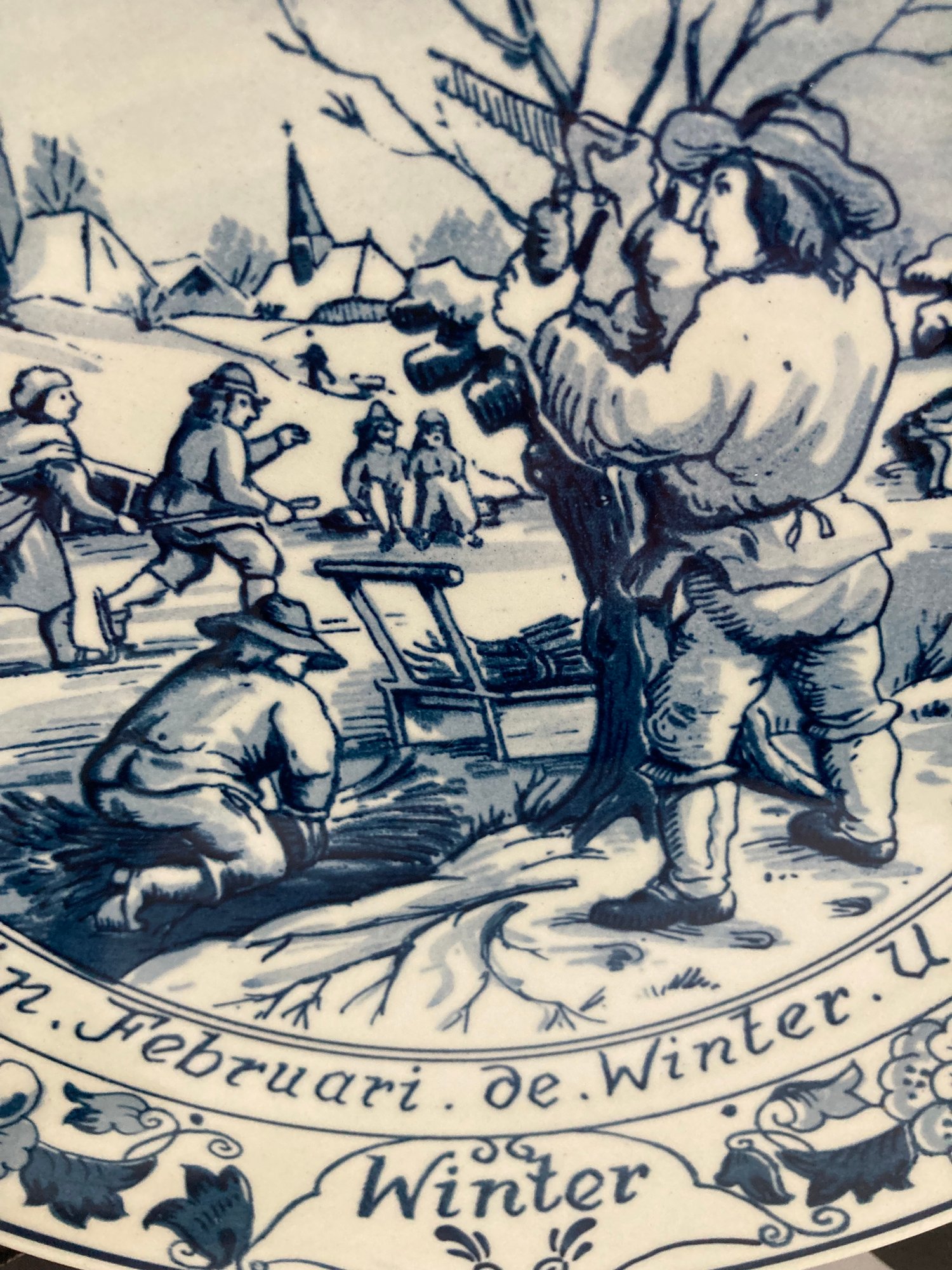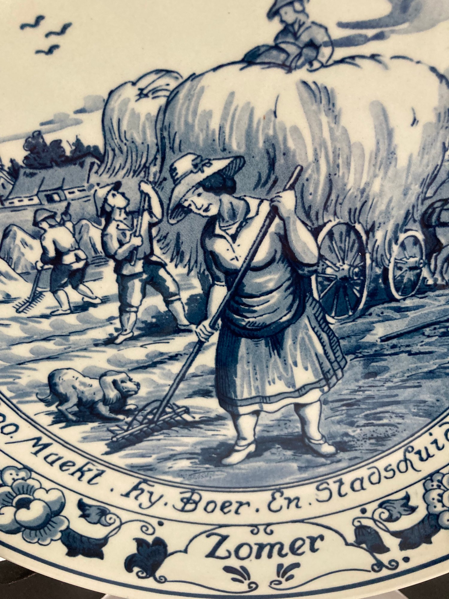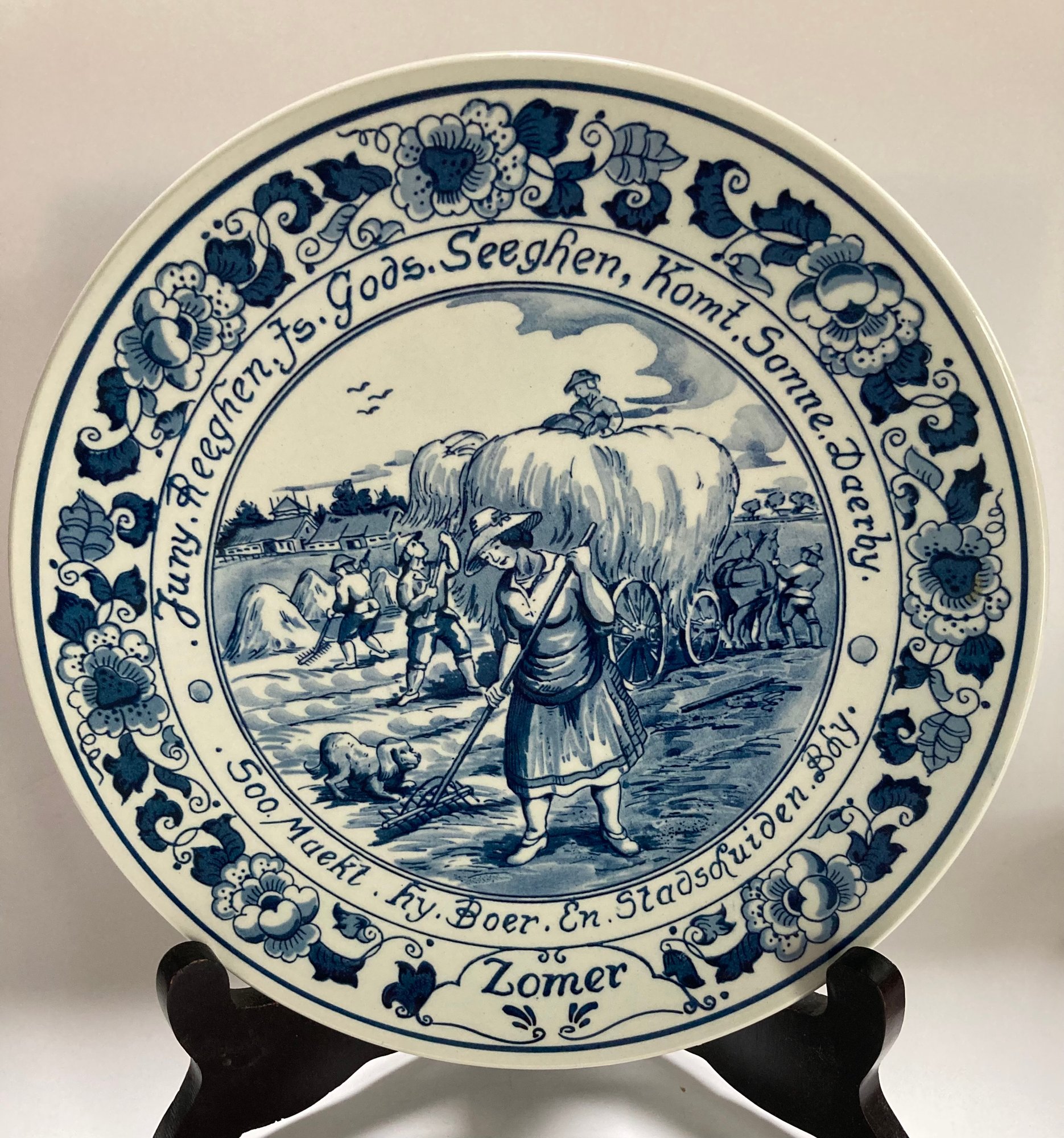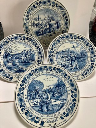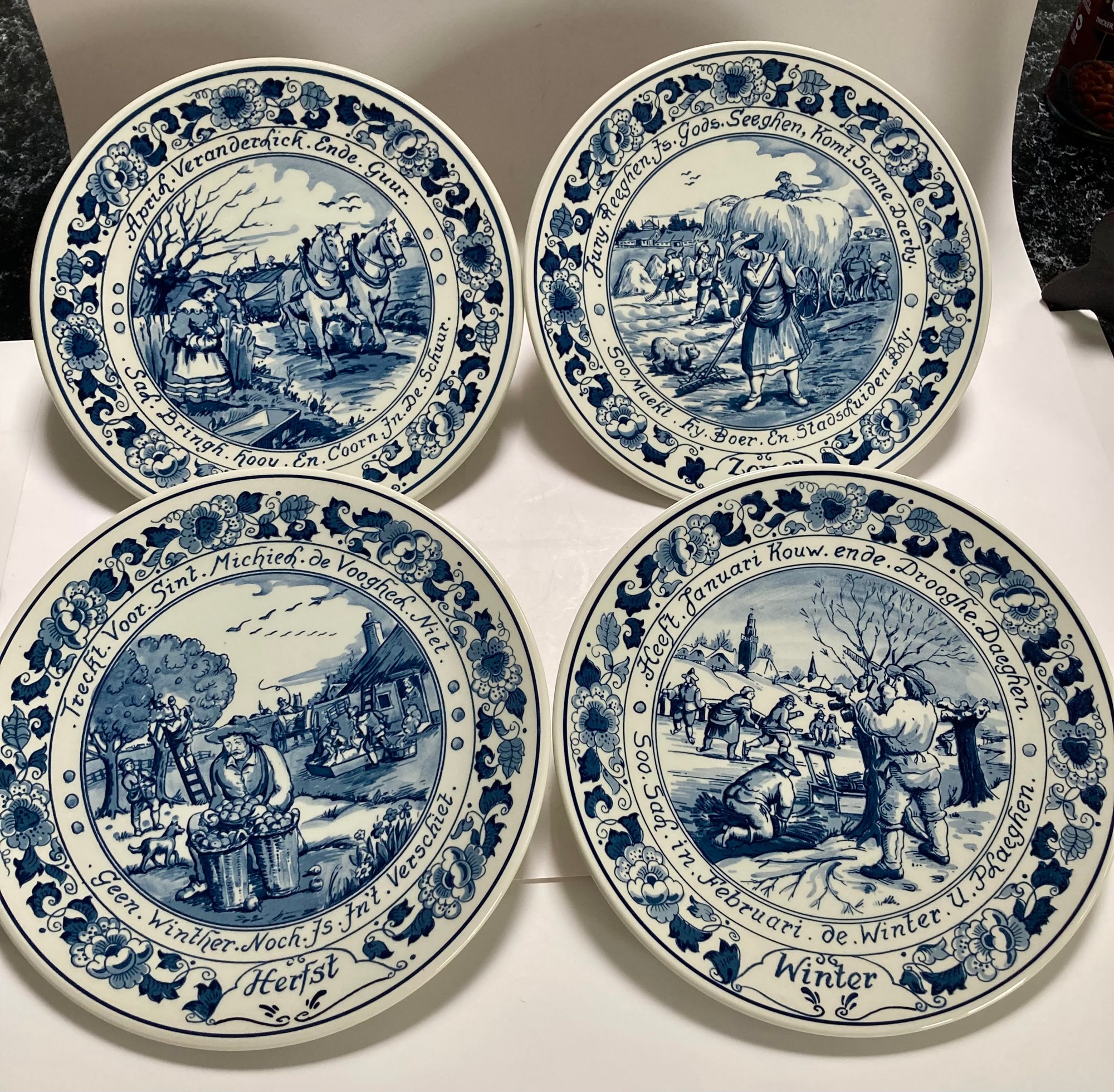 Set of four plates depicting the four seasons manufactured by Royal Goedewaagen. The plates are hand painted and are in excellent condition. They measure 9” in diameter. Royal Goedewaagen is one of the oldest earthenware factories in the world Netherlands