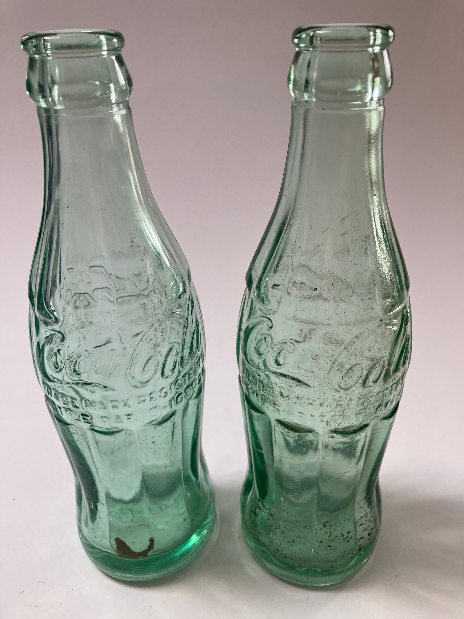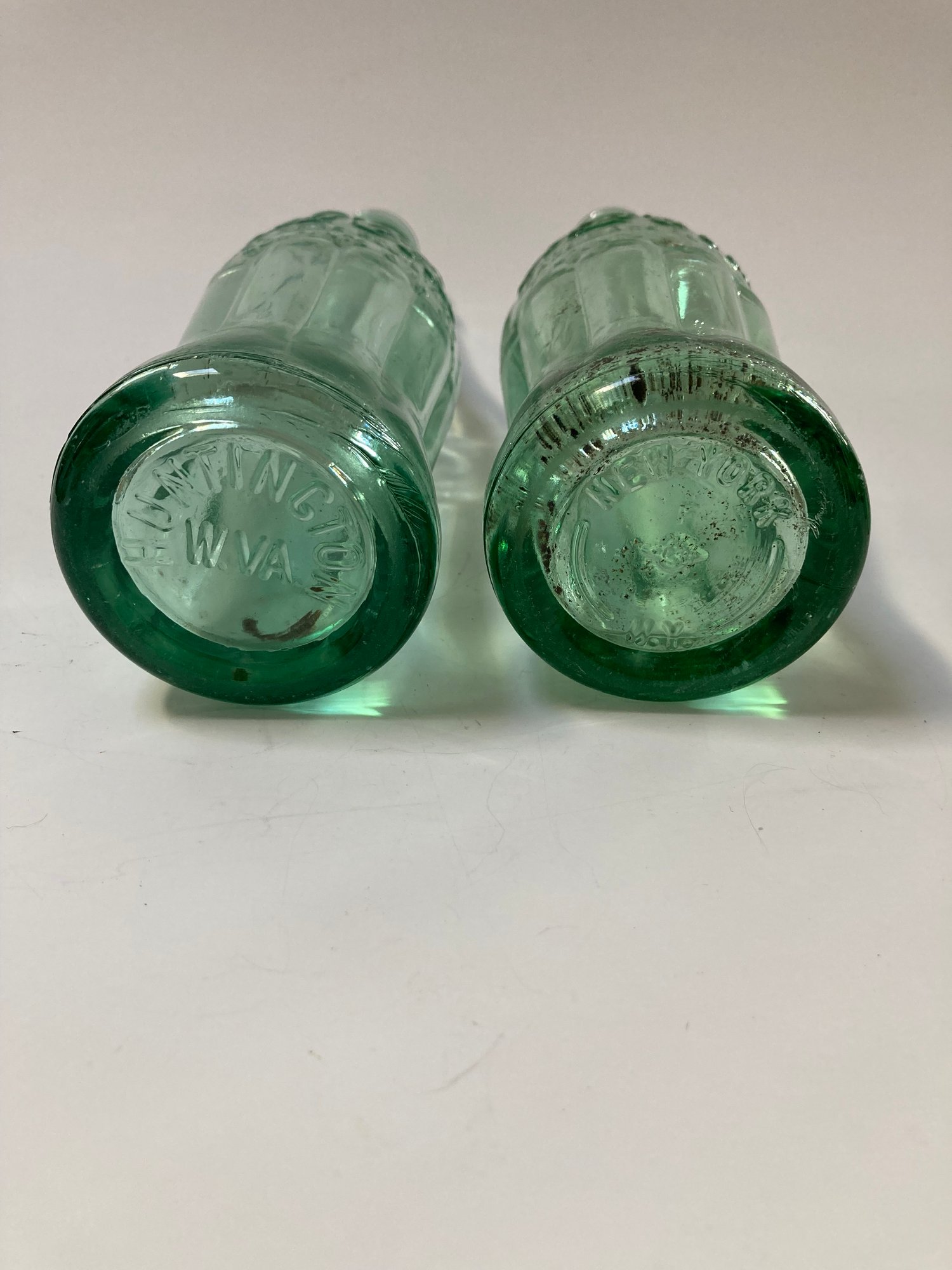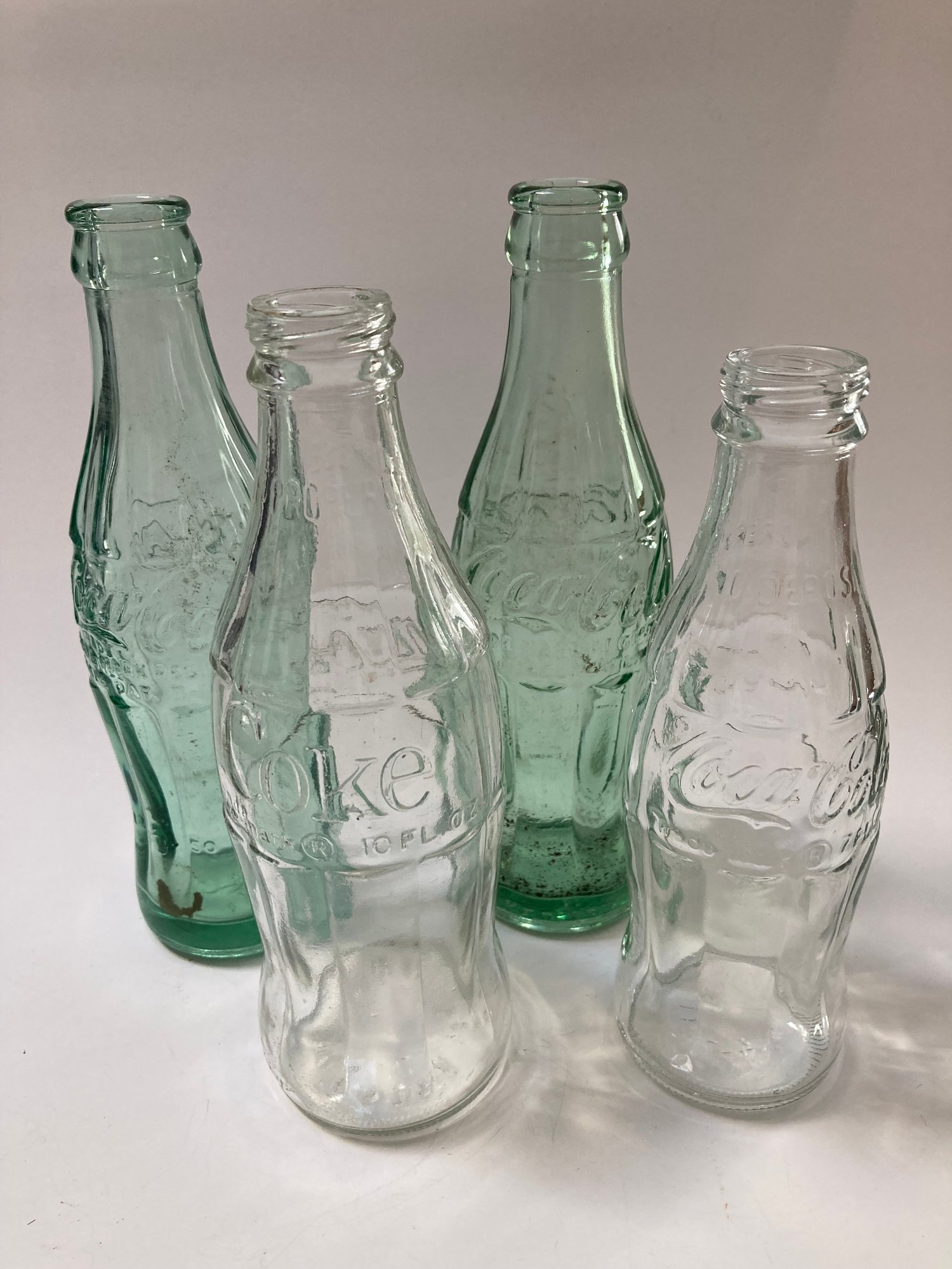 Two green Coca Cola bottles, one marked Huntington W. VA and the other New York F N.Y. Both hold 6 ozs. The shorter clear bottle hold 7 ozs, No Return, No Refill and has NB 4-77 149 on the bottom. The fourth bottle is clear, holds 10 ozs and has No refill 6- B-396 21 B C3 on the bottom. No cracks or chips on any bottle.