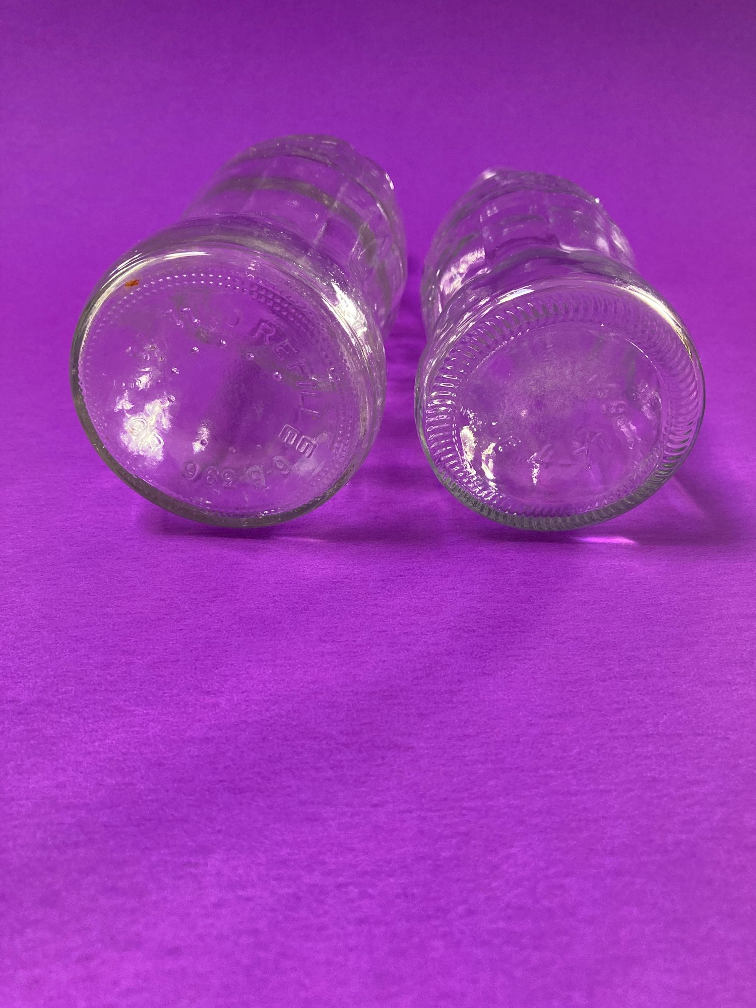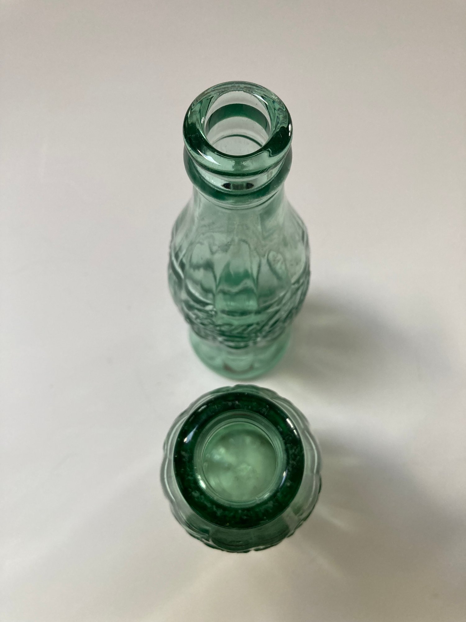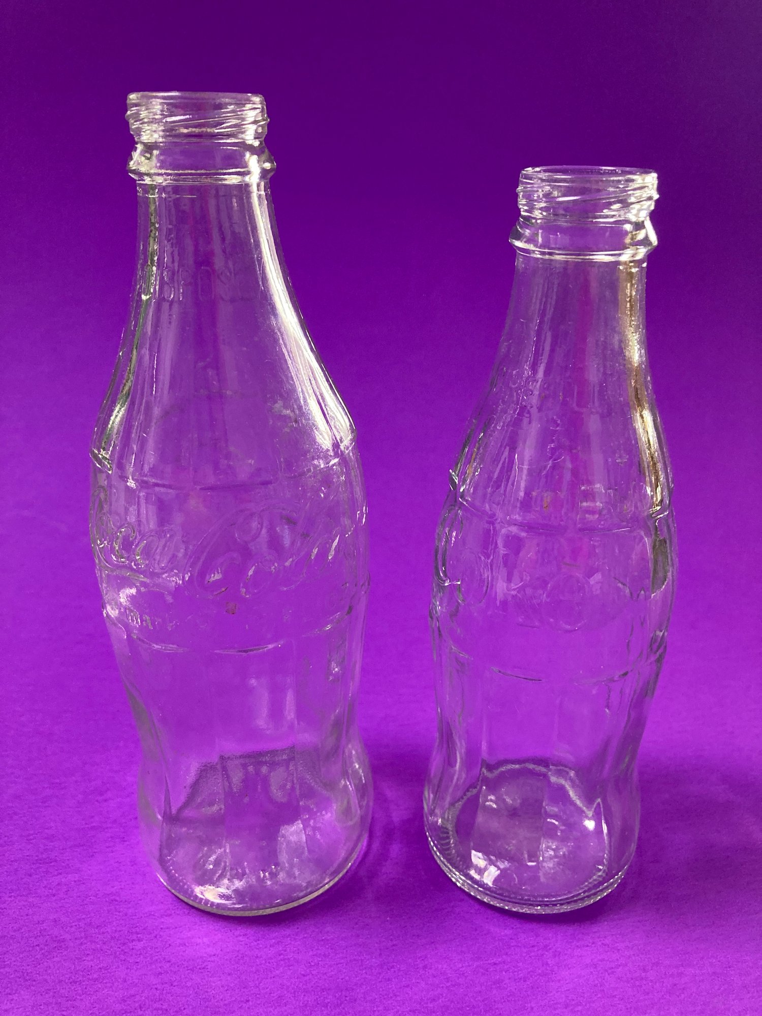 Two green Coca Cola bottles, one marked Huntington W. VA and the other New York F N.Y. Both hold 6 ozs. The shorter clear bottle hold 7 ozs, No Return, No Refill and has NB 4-77 149 on the bottom. The fourth bottle is clear, holds 10 ozs and has No refill 6- B-396 21 B C3 on the bottom. No cracks or chips on any bottle.