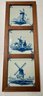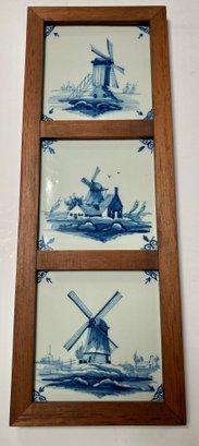 Nicely framed set of three vintage hand painted Delft windmills. The frame measures 6 1/2” by 17 1/2”.