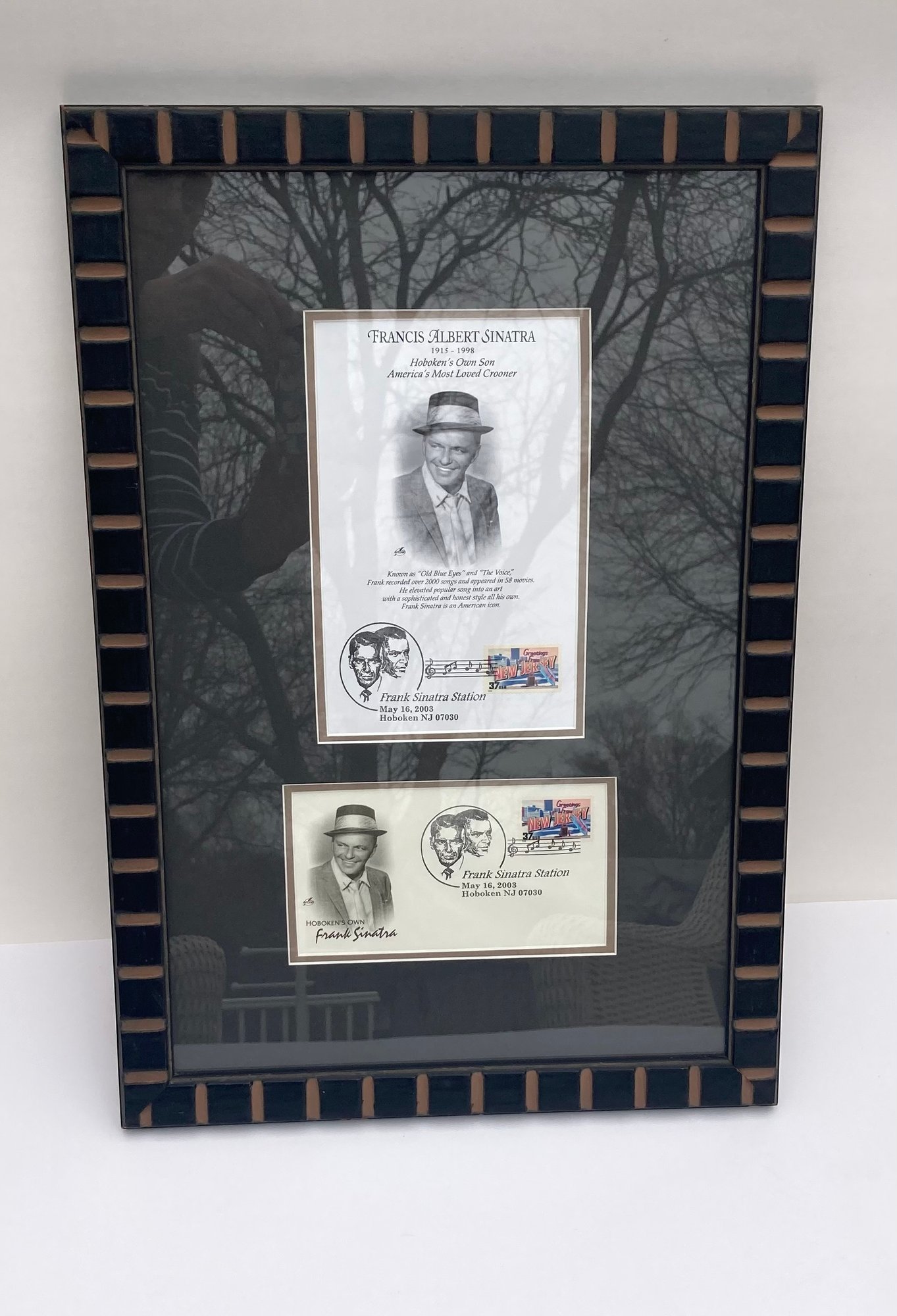Nicely framed commemorative display of Frank Sinatra’s achievements. The United States Post Office issued a stamp in his honor in 2003. The Hoboken Post Office was renamed Frank Sinatra Station at the same time. Frame measures 20” x 13.5”.