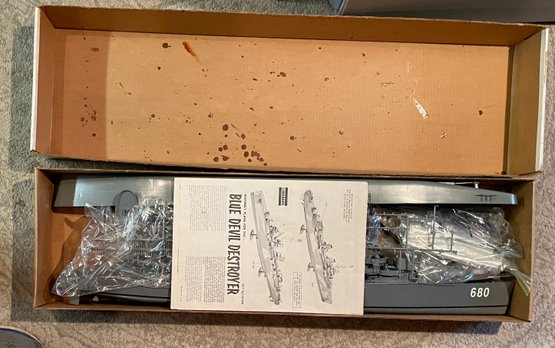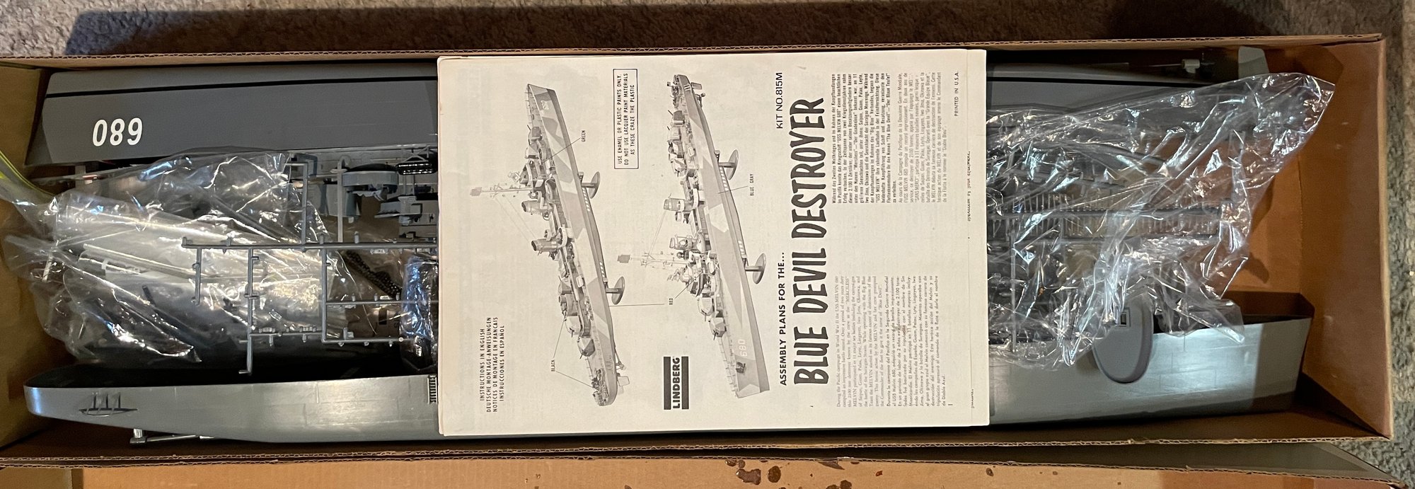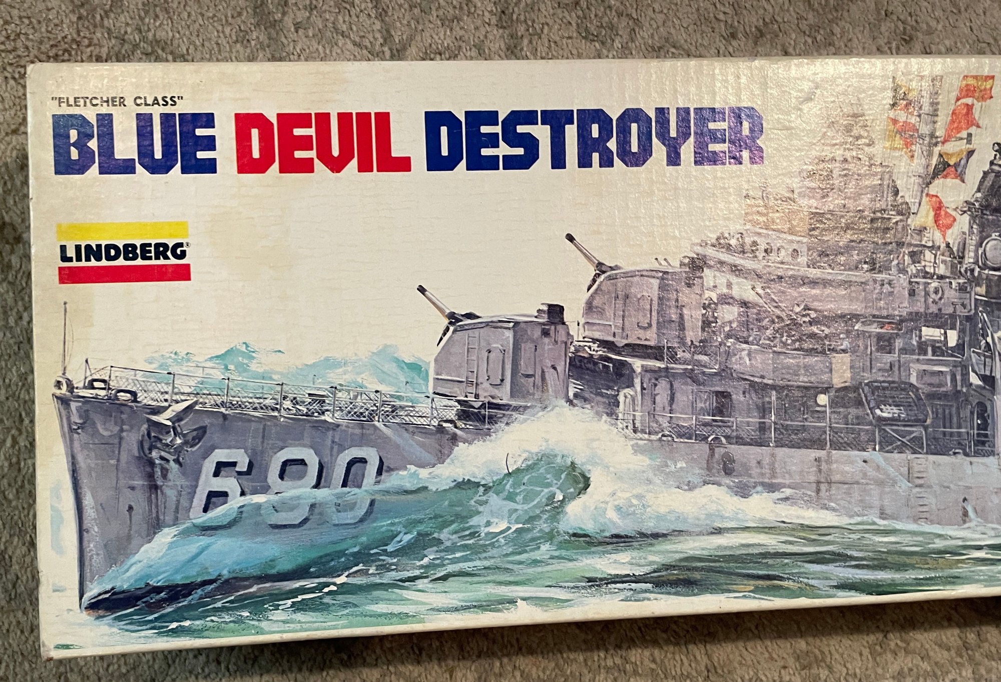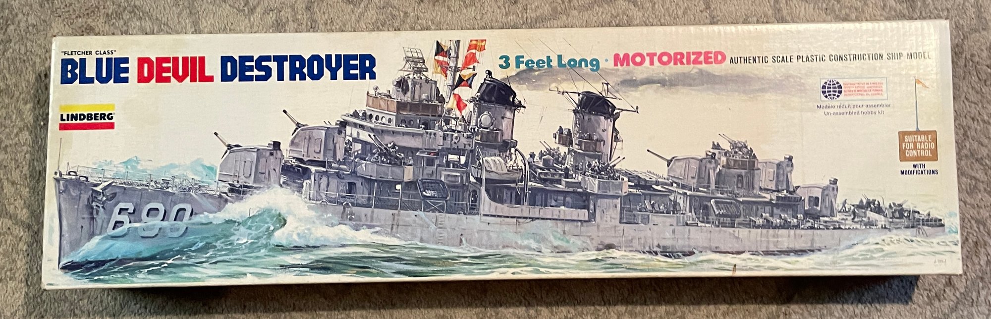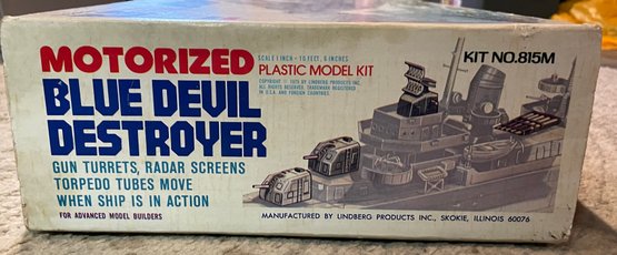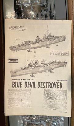 LINDBERG FLETCHER CLASS - Motorized Blue Devil Destroyer Model Kit No. 815M. Appears assembly was started. We did not go through the box, therefore assume that no Controller or Engine included. We have not gone through the box to confirm every piece, but everything here shown will be included. Enjoy!