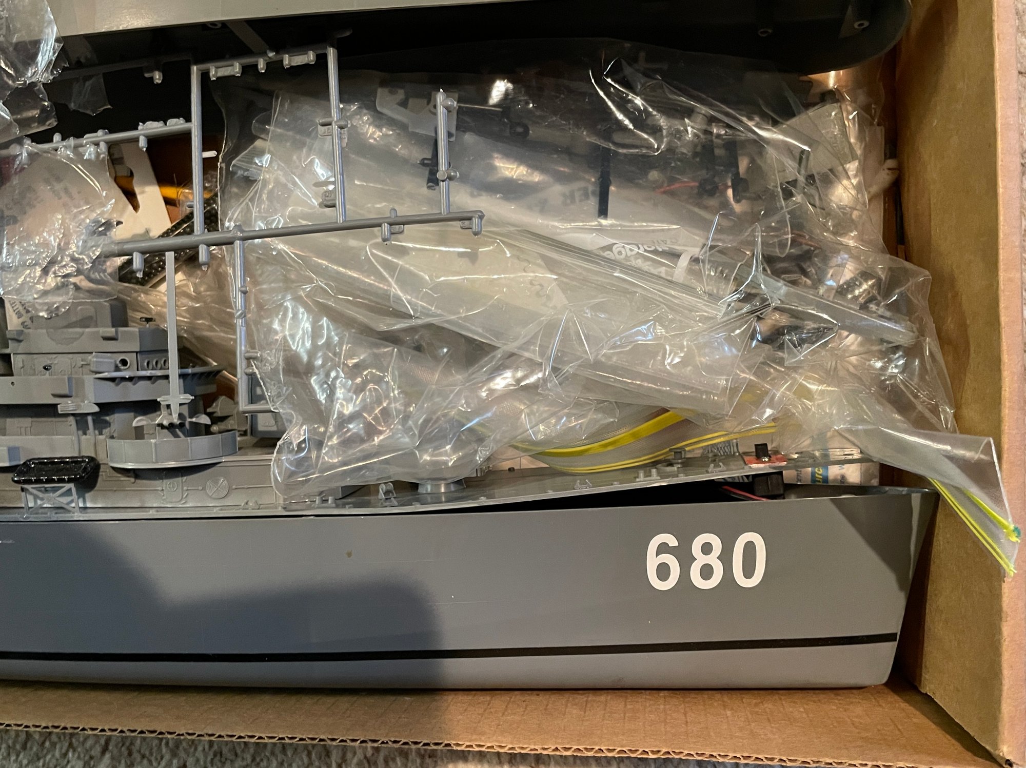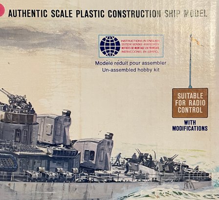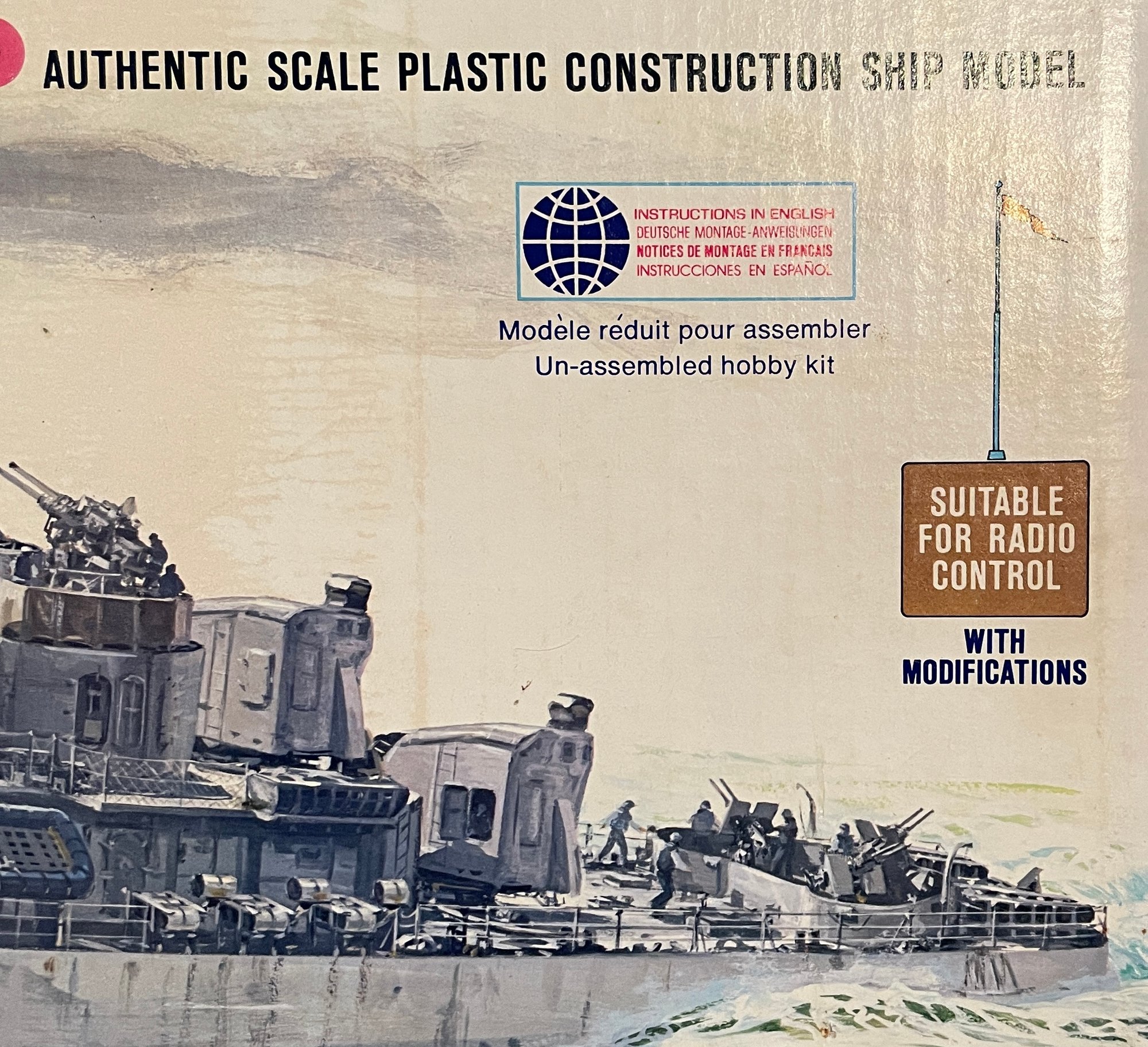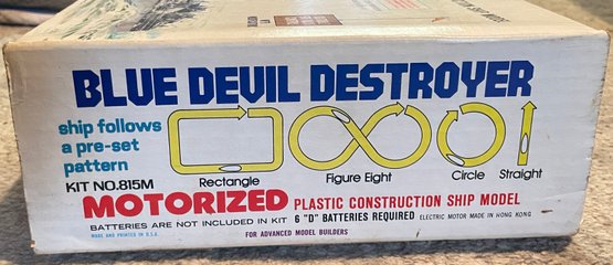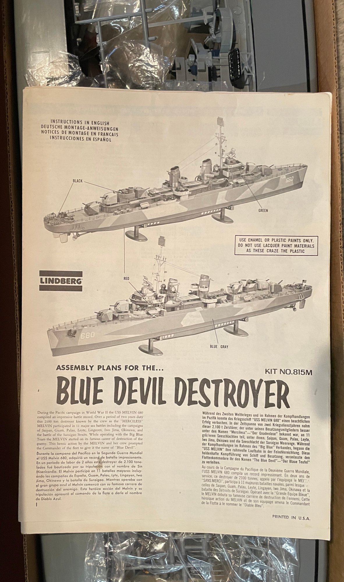 LINDBERG FLETCHER CLASS - Motorized Blue Devil Destroyer Model Kit No. 815M. Appears assembly was started. We did not go through the box, therefore assume that no Controller or Engine included. We have not gone through the box to confirm every piece, but everything here shown will be included. Enjoy!