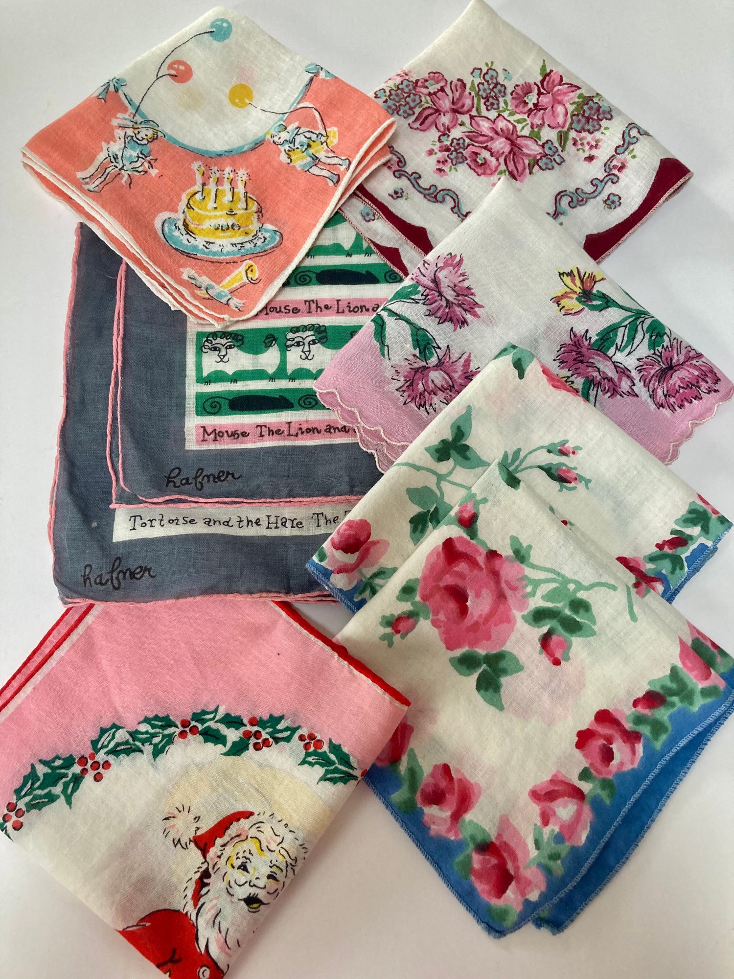 Lot of eight vintage handkerchiefs. Four are floral, two are from children’s nursery rhymes, one shows Santa Claus and the last shows balloons and birthday cake from a child’s party. There are no stains or holes. The larger 13.5” square hankies are marked Hafnerand show the tortoise and the hare and the Lion and the mouse.