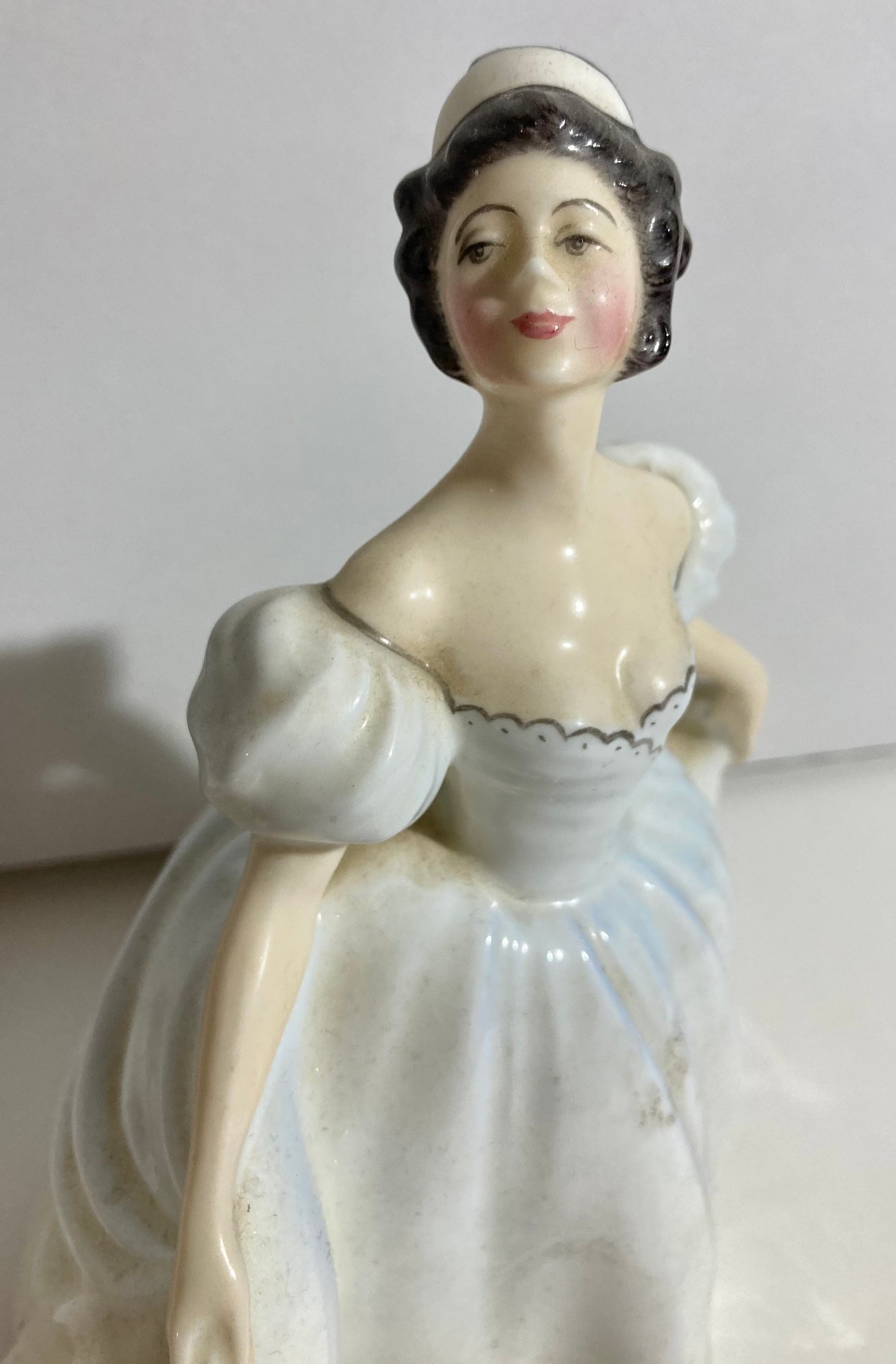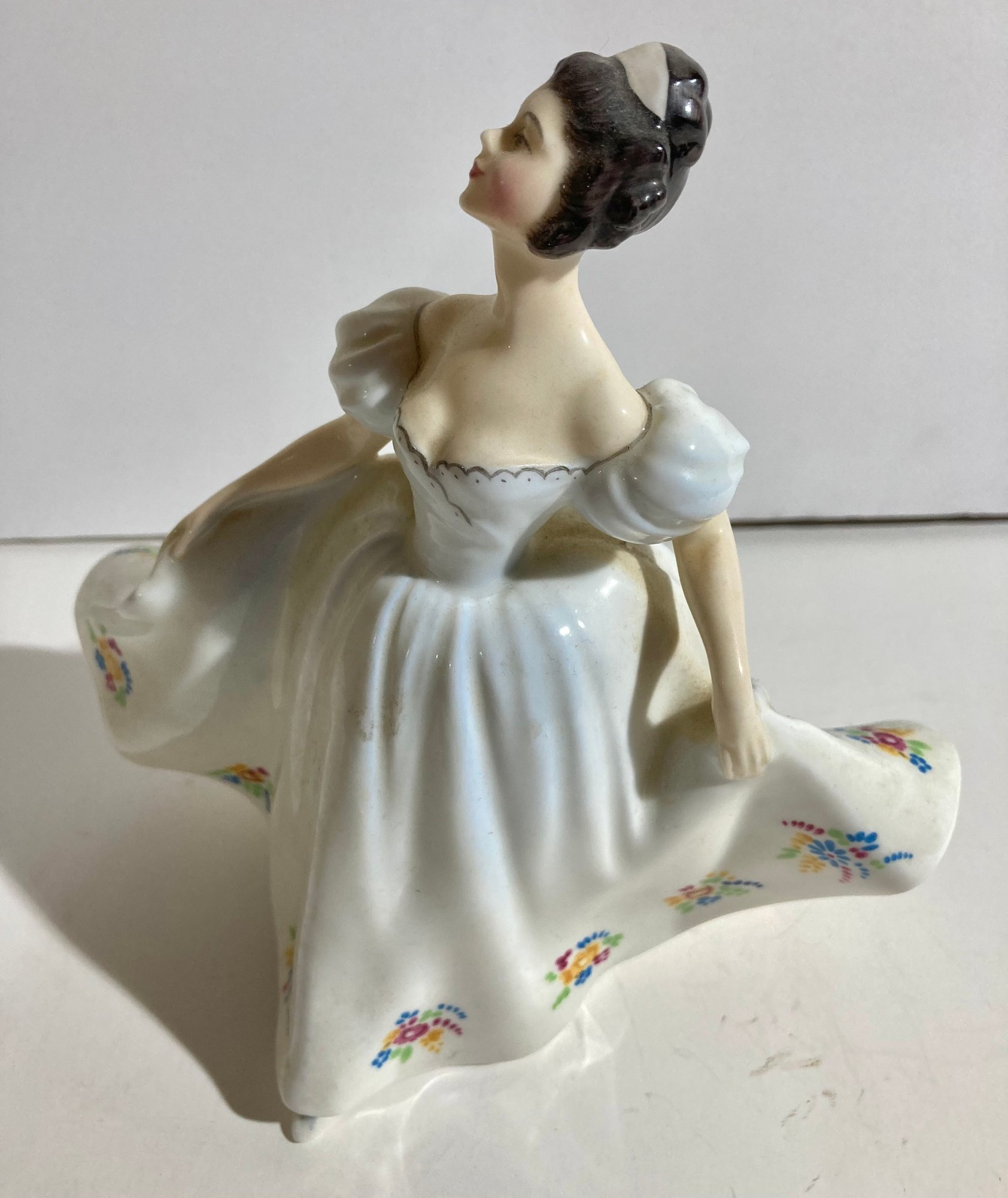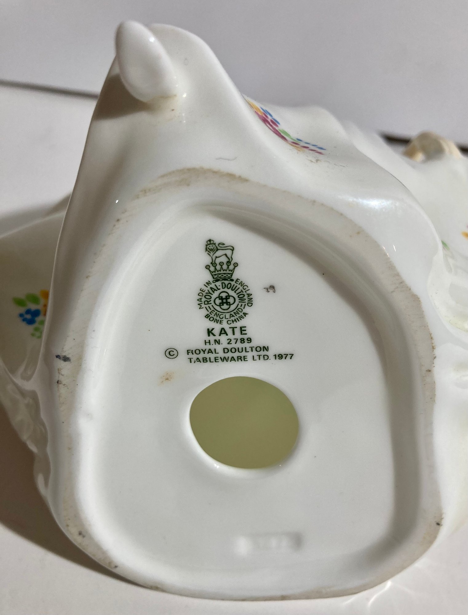 Royal Doulton figurine HN 2789 is of Kate, wearing a white dress with floral accents. Manufactured in England of bone china, she stands 7 1/4.” There are no chips cracks, crazing. No box