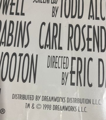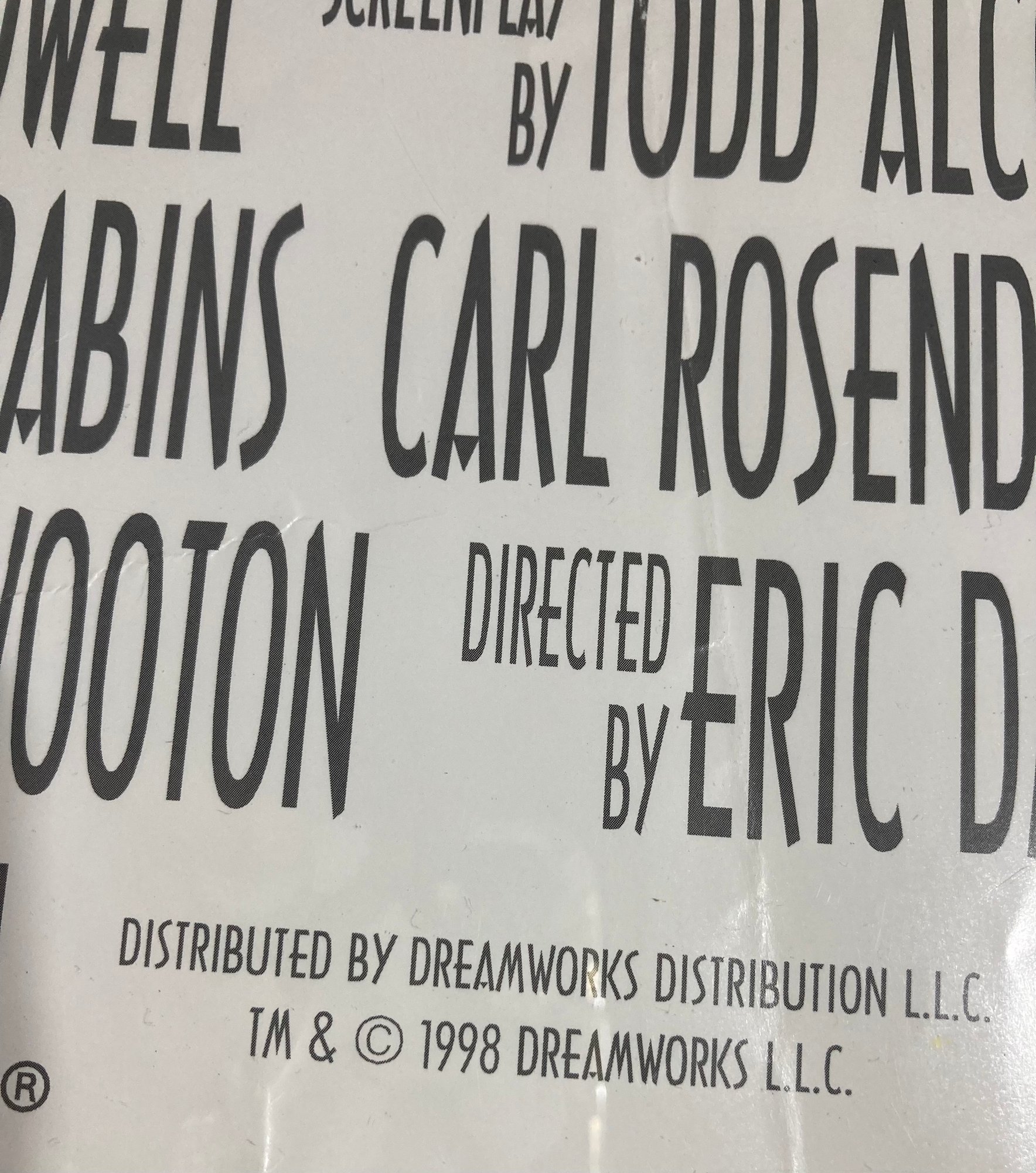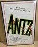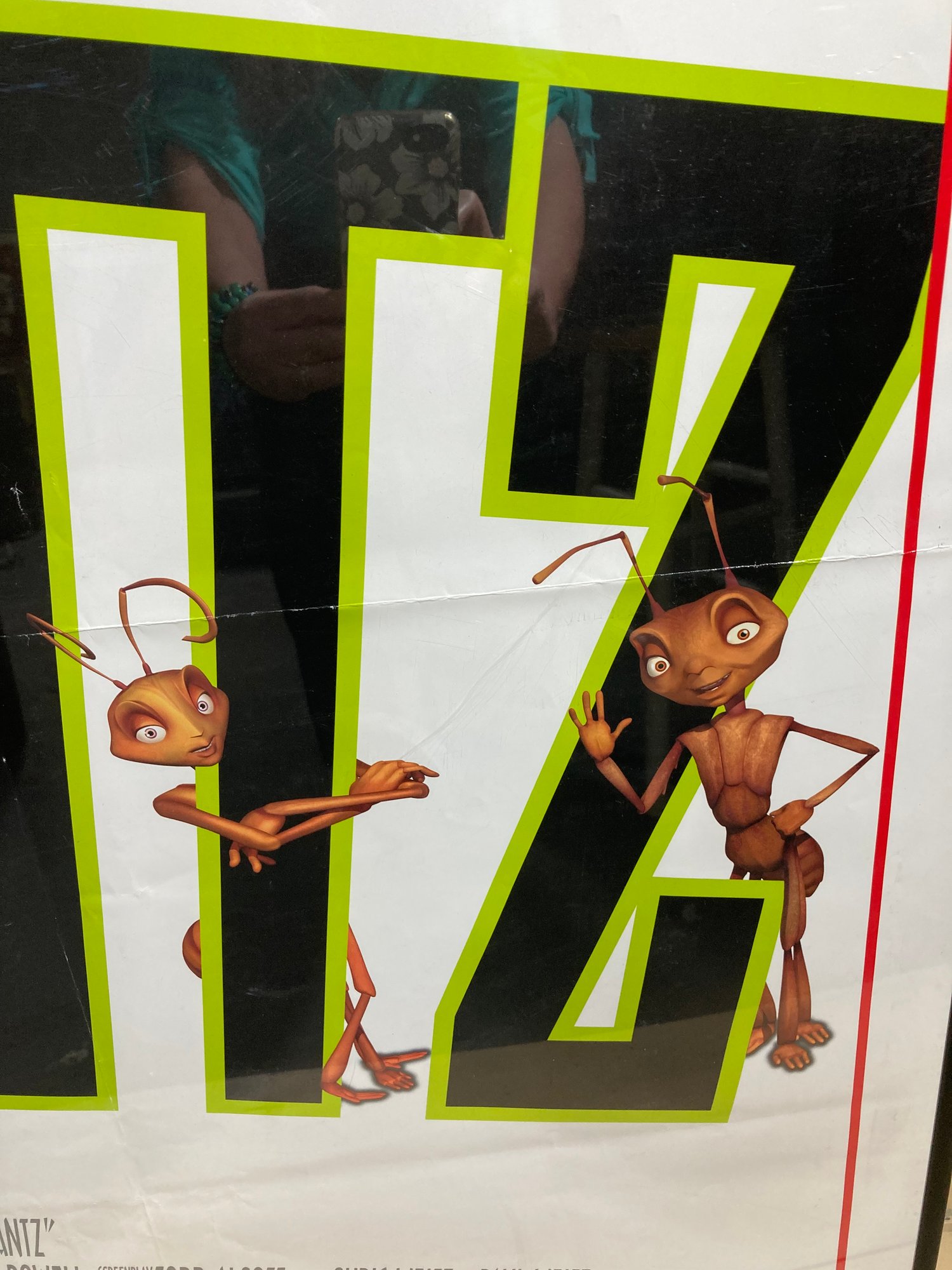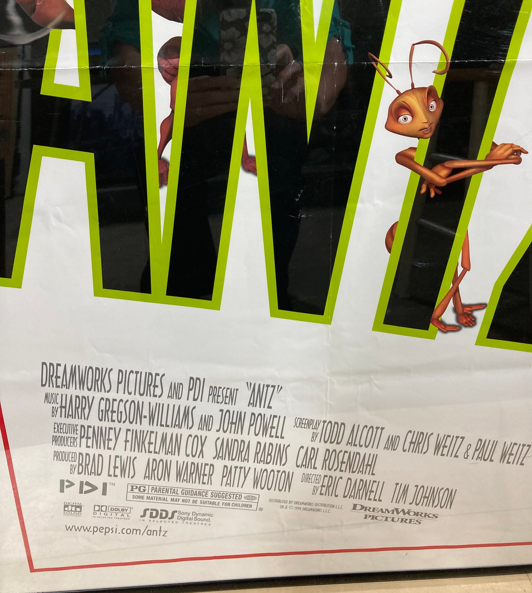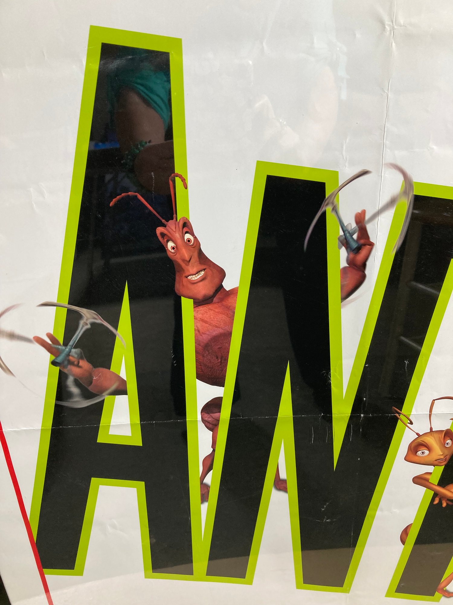 Original movie poster for the animated adventure comedy Antz, released in 1998. The movie stars Woody Allen, Sharon Stone, Jennifer Lopez, and Sylvester Stallone. The frame measures 27” x 40”
