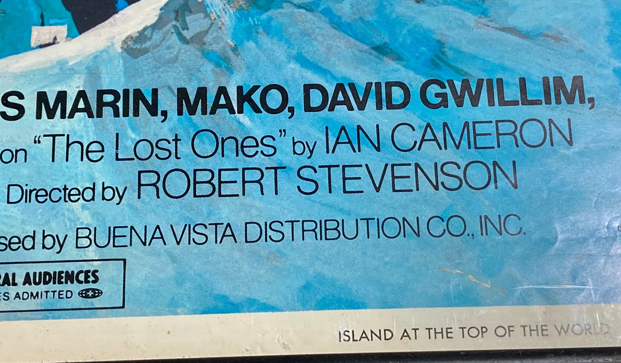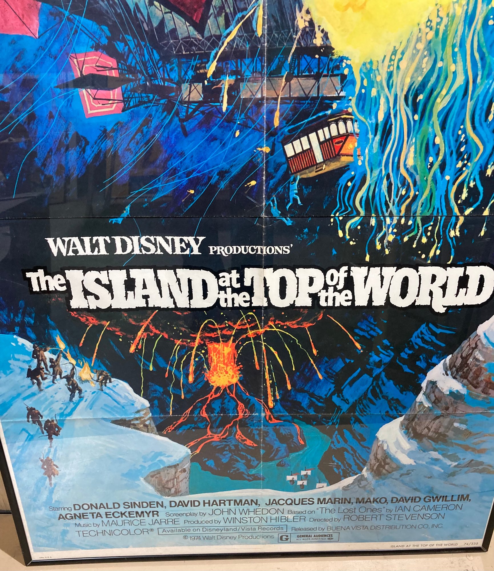Original movie poster from the 1974 film, Island at the Top of the World. This movie is a live action lost world/fantasy film starring Donald Sinden and David Hartman. There are some