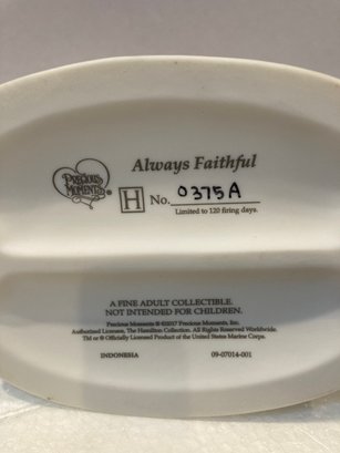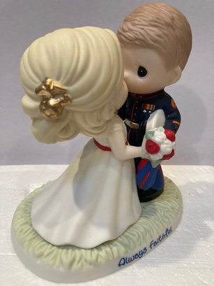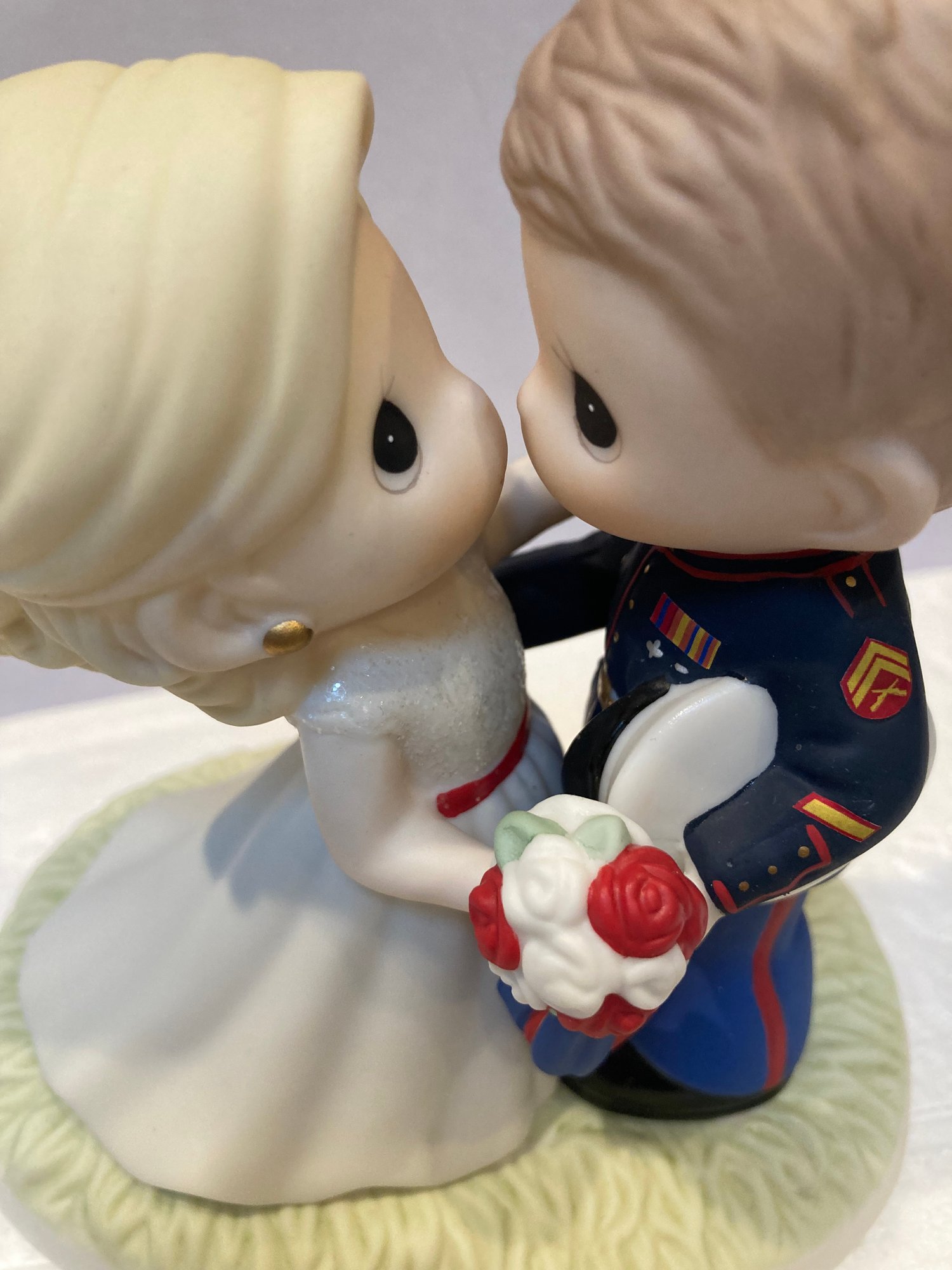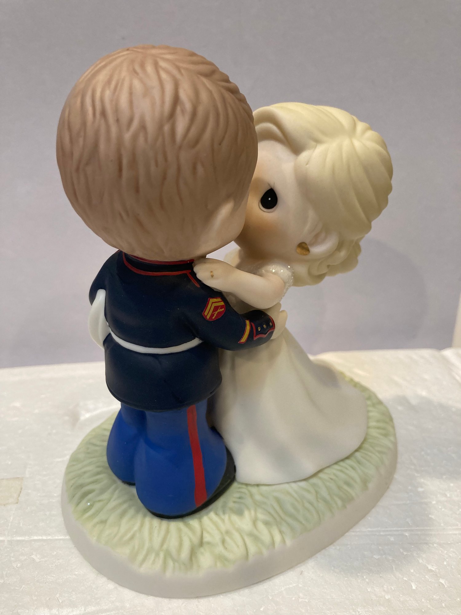 Precious Moments figurine depicts a United States Marine and his Bride. It is a limited edition made of bisque porcelain, hand numbered and hand painted. Comes with the original styrofoam packaging, but not the box. Like new condition.
