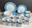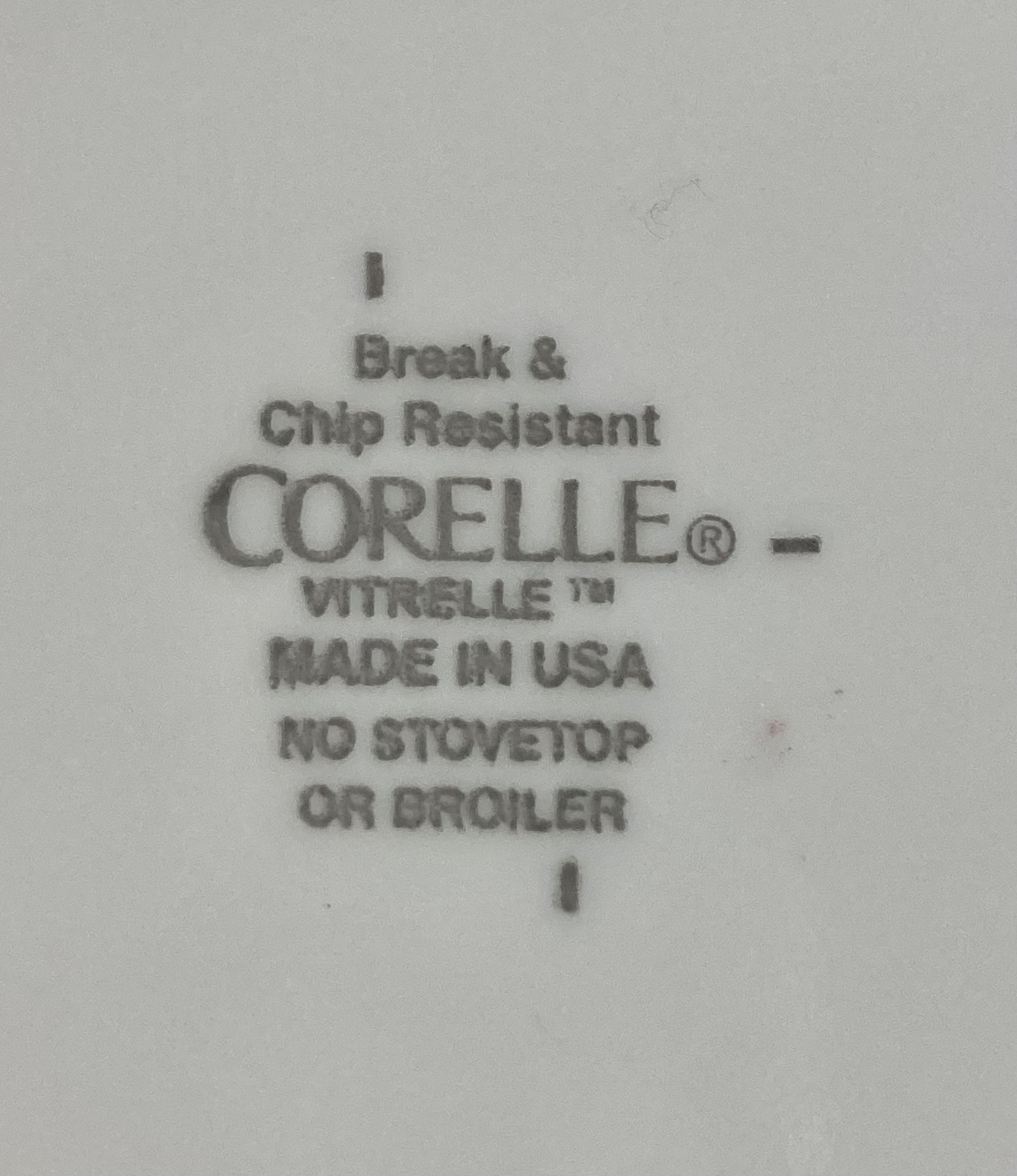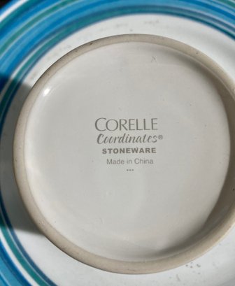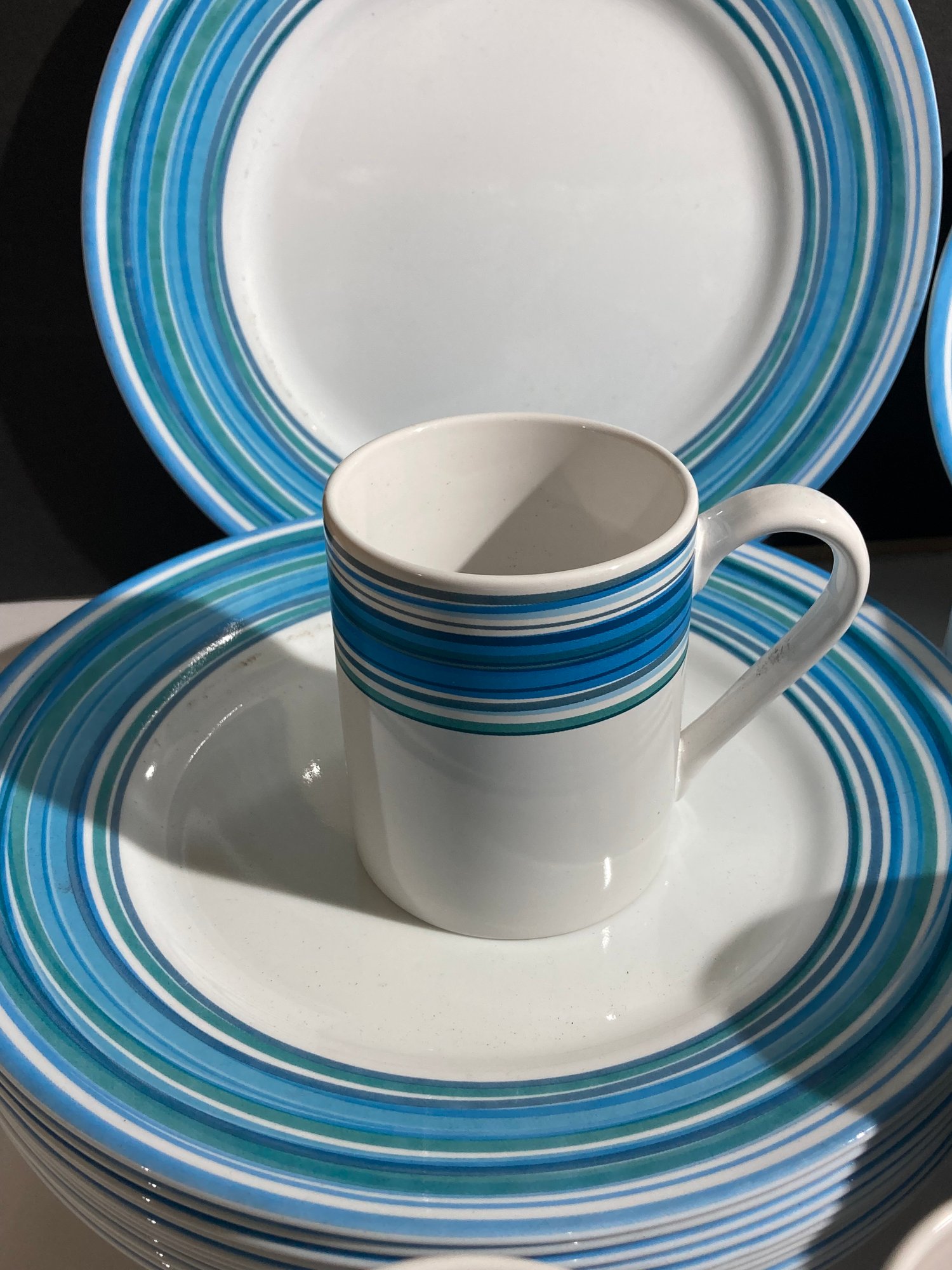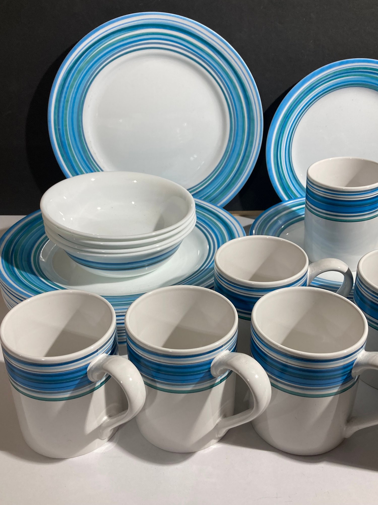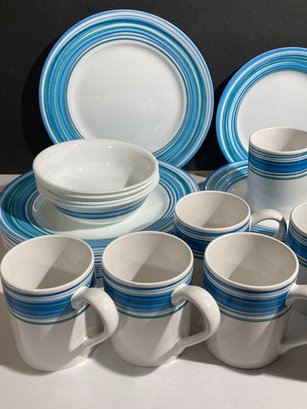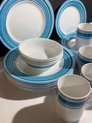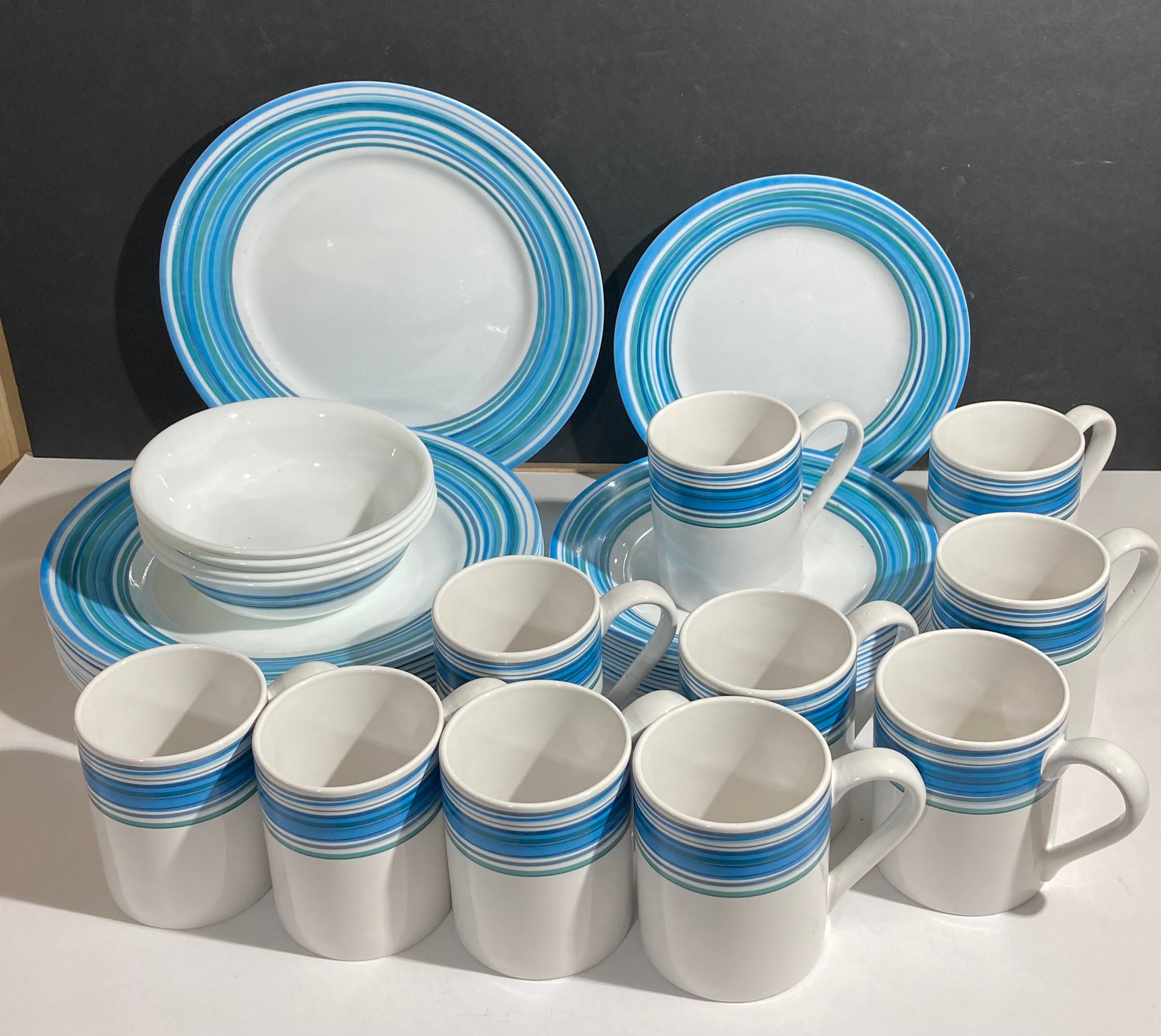 Partial set of Corelle dinnerware in the Blue Swirls pattern. Manufacture dates from 2008-2009. There are 12 dinner plates 10 3/4”, 11 luncheon or dessert plates 8 1/2”, 4 cereal or salad bowls 6” and 10 mugs for a total of 38 pieces. The rims are decorated in blue, green and white swirls. Corelle is durable, lightweight, dishwasher and microwave safe. Nice to use outdoors when you don’t want to use glass or ceramic dishes.