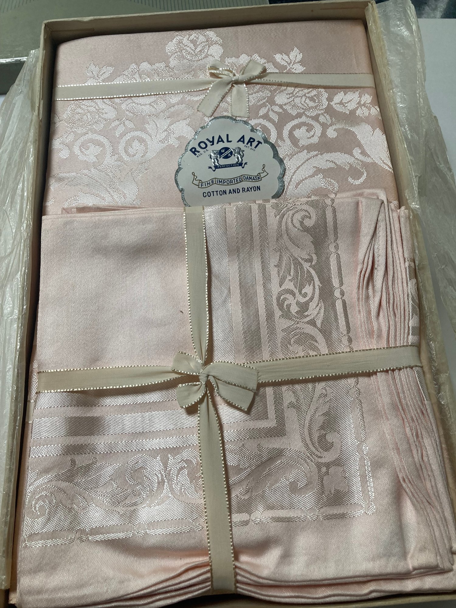 Egyptian Cotton and Rayon Damask Light Pink Tablecloth 66” x 86” with 8 Matching Napkins 18” x 18” Items Have Never Been Removed From the Box. Box has a Puncture in the Lid.