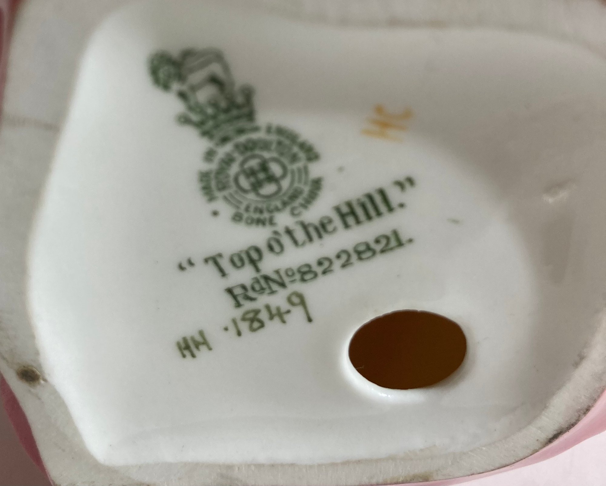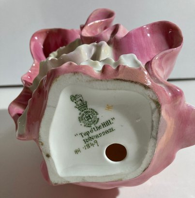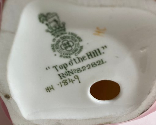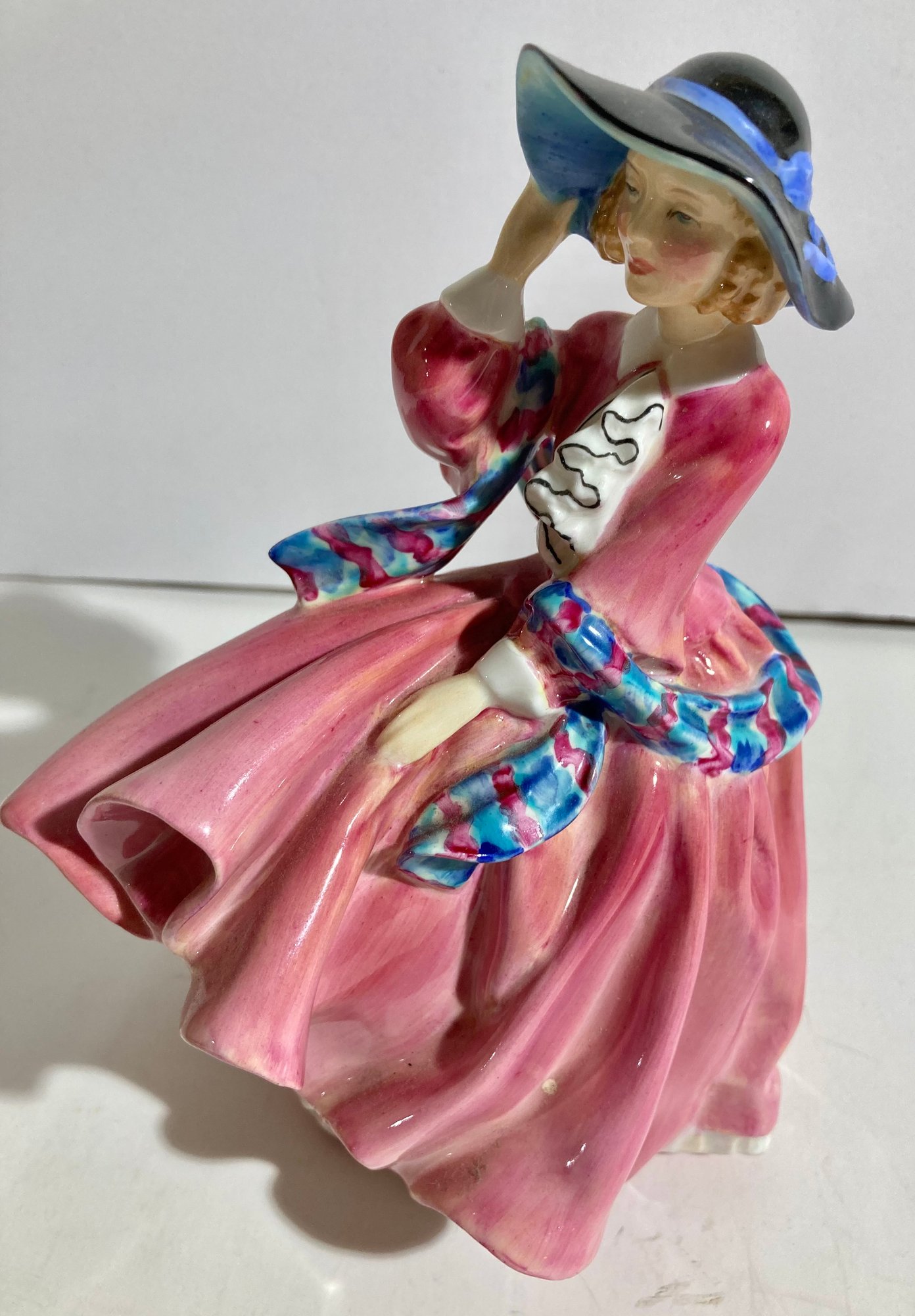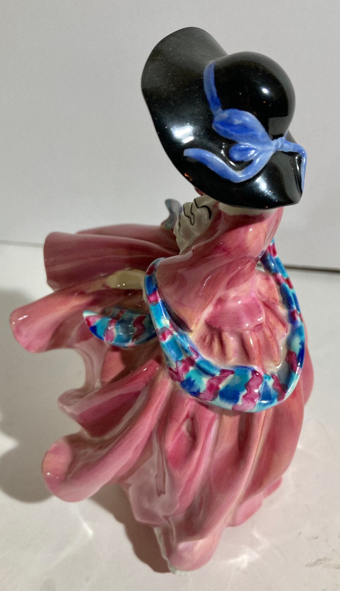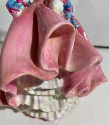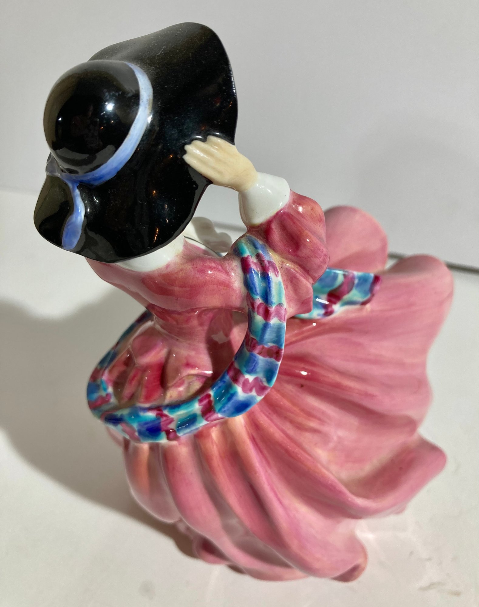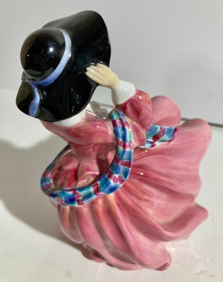 Royal Doulton HN 1849 shows a blond lady wearing a pink dress with a black hat. She stands 7” tall and was manufactured in England of bone china. The HN number is handpainted, indicating an older version. This version was issued 1937 to 2004. There are no cracks, chips or crazing. No box.
