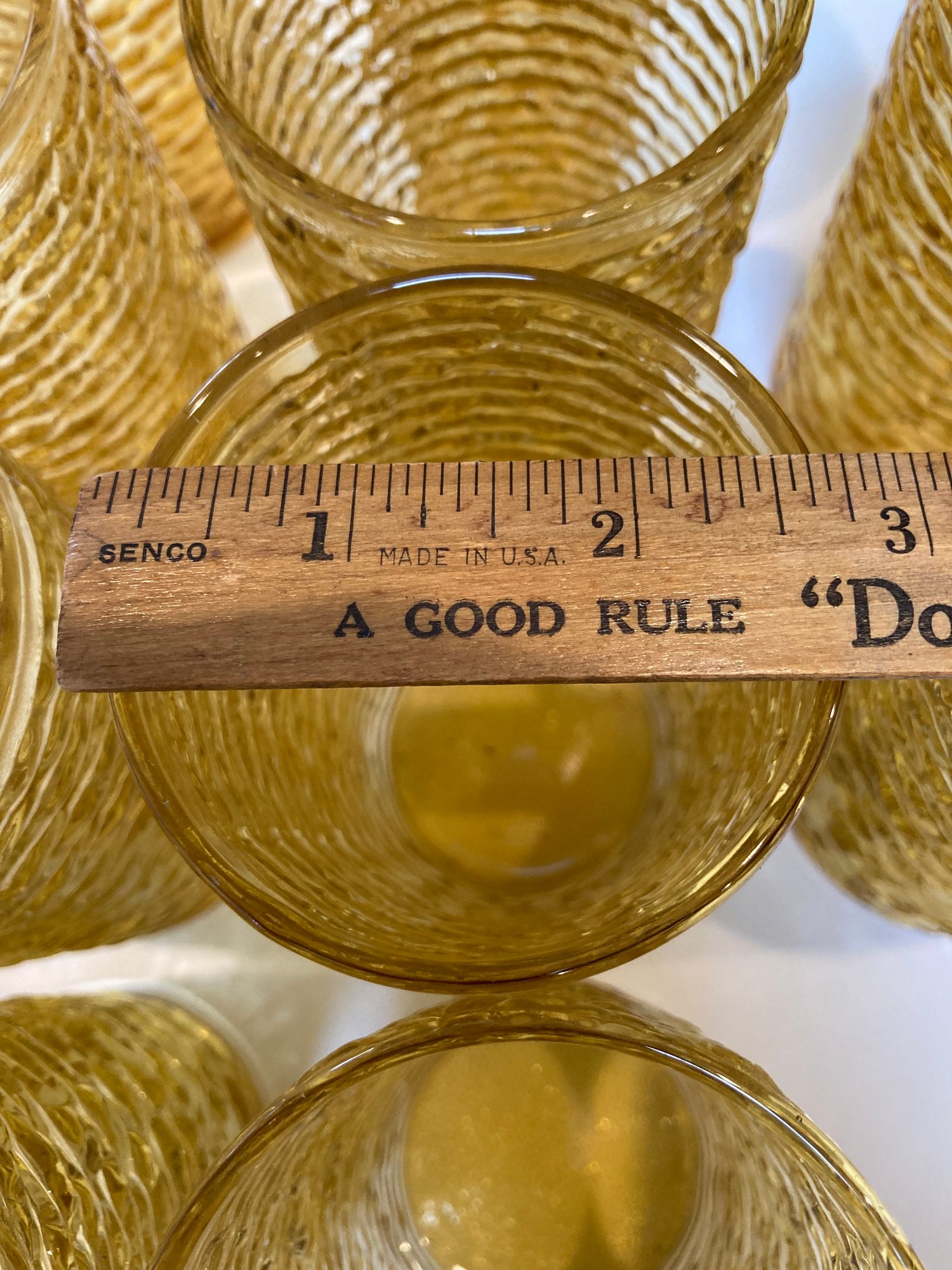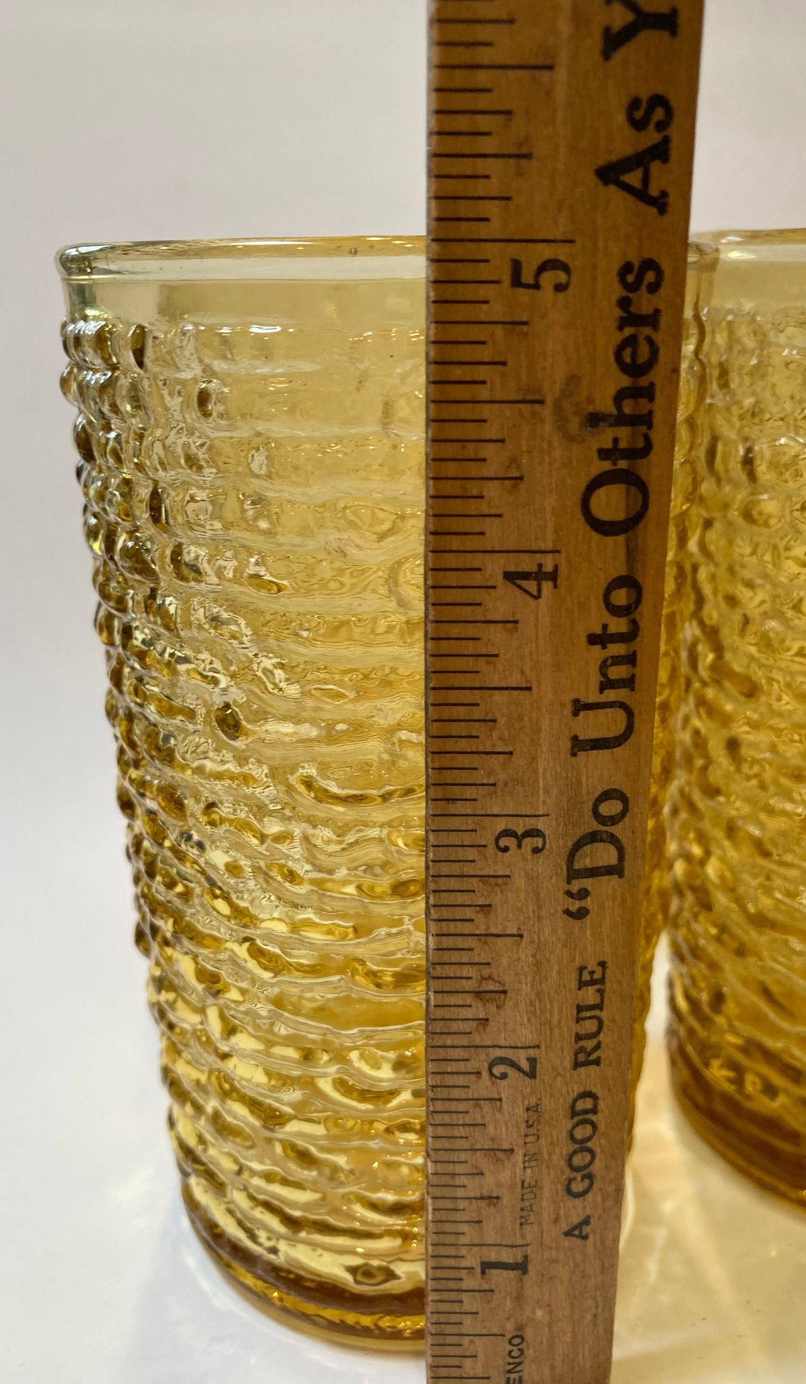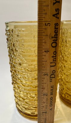 Beautiful set of ten glasses from Anchor Hocking. They measure 5” tall and are from the 1960’s. All are in mint condition. The textured exterior will keep them from slipping out of your hand.