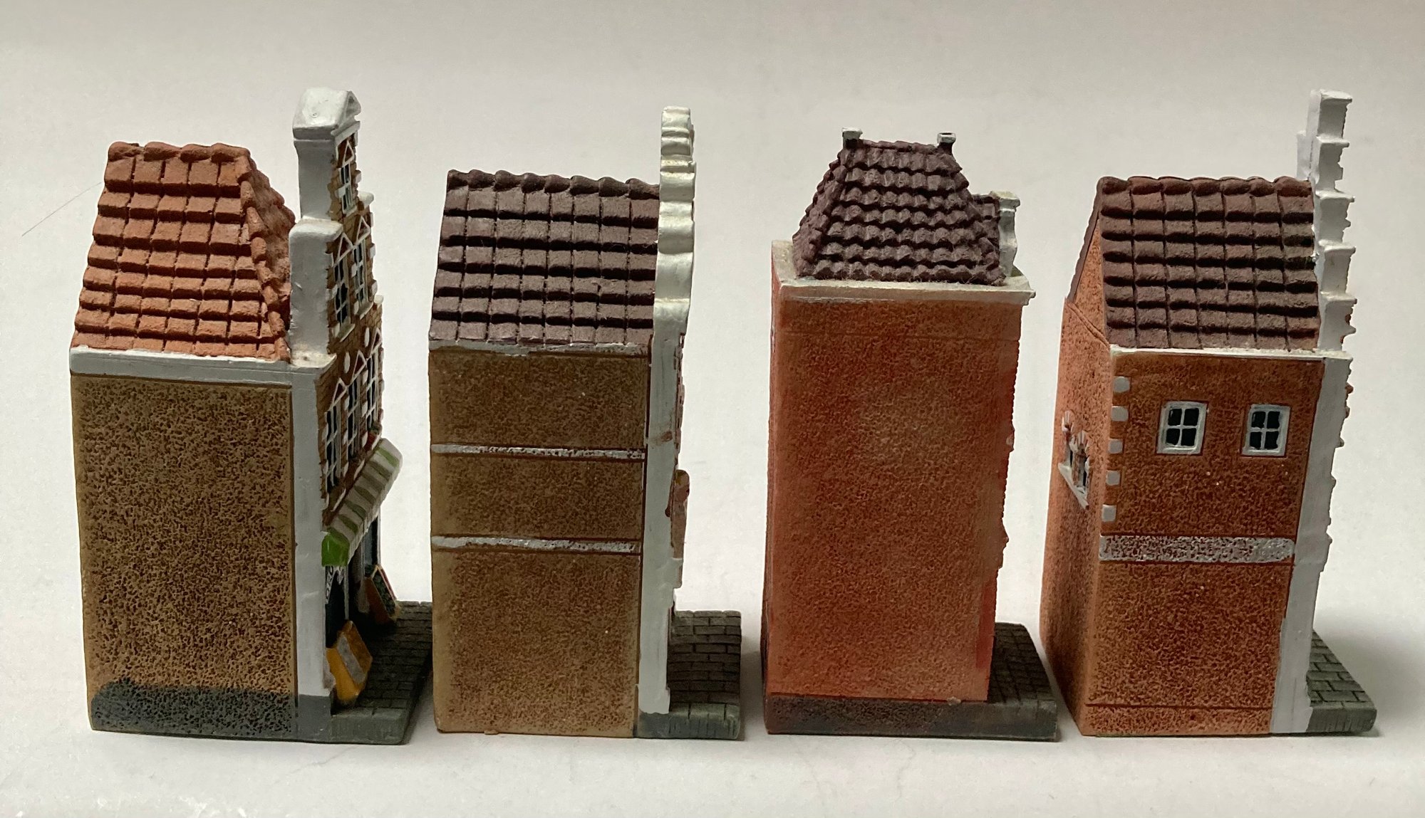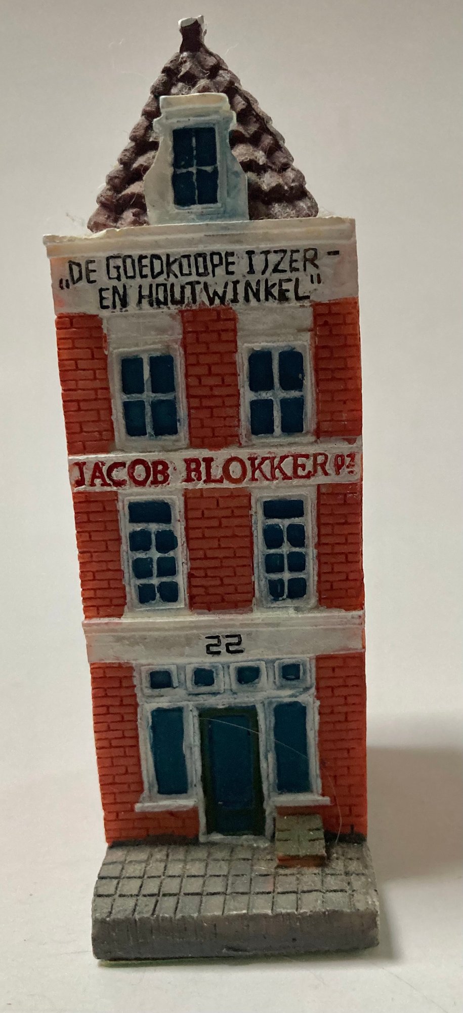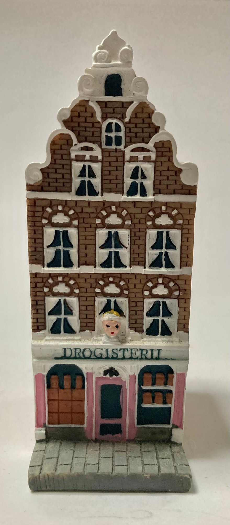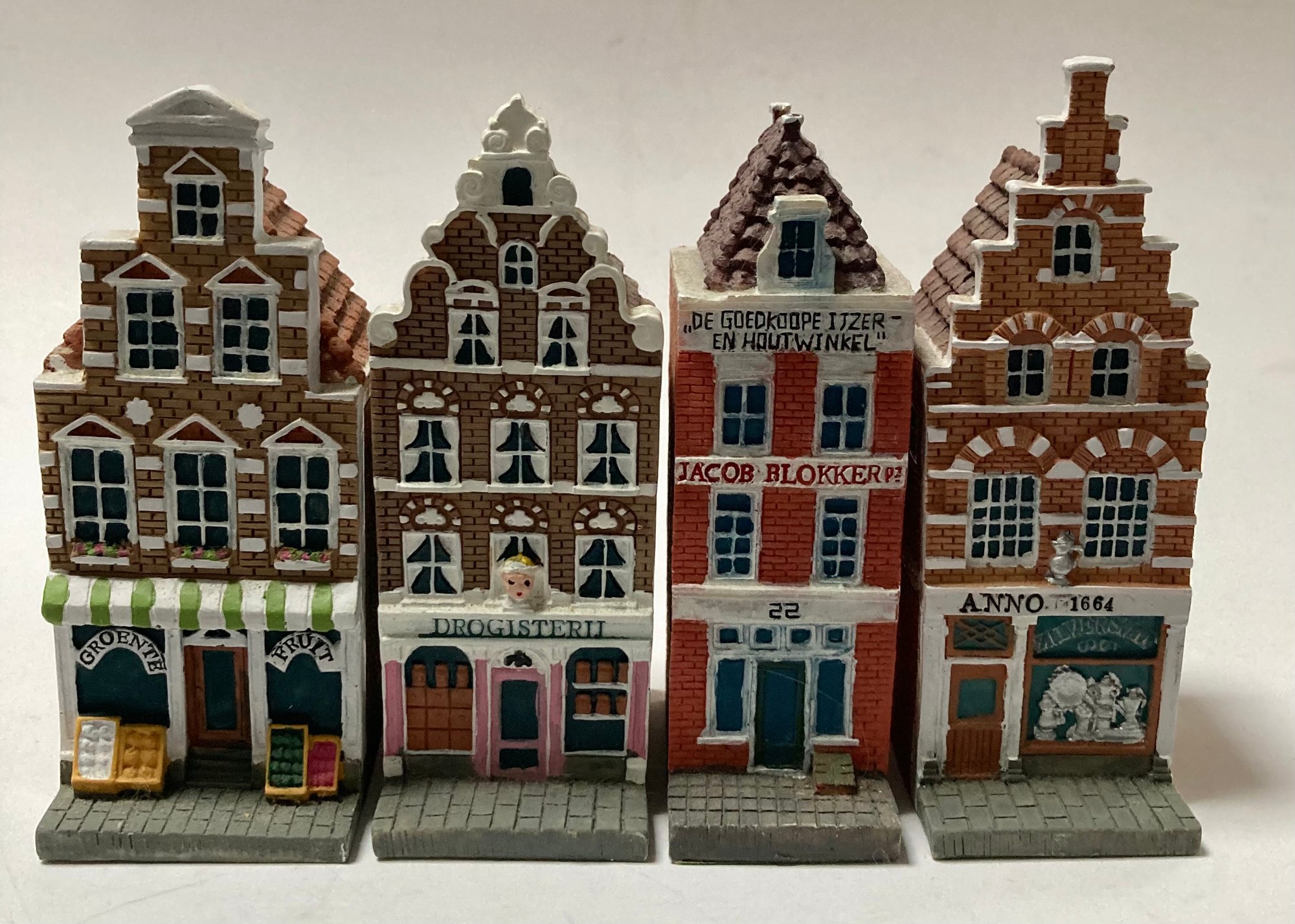 Highly detailed resin Blokker mini canal houses of Amsterdam. They are 4” tall. The four piece set includes the Jacob Blokker house, a drugstore, grocery and silversmith.
