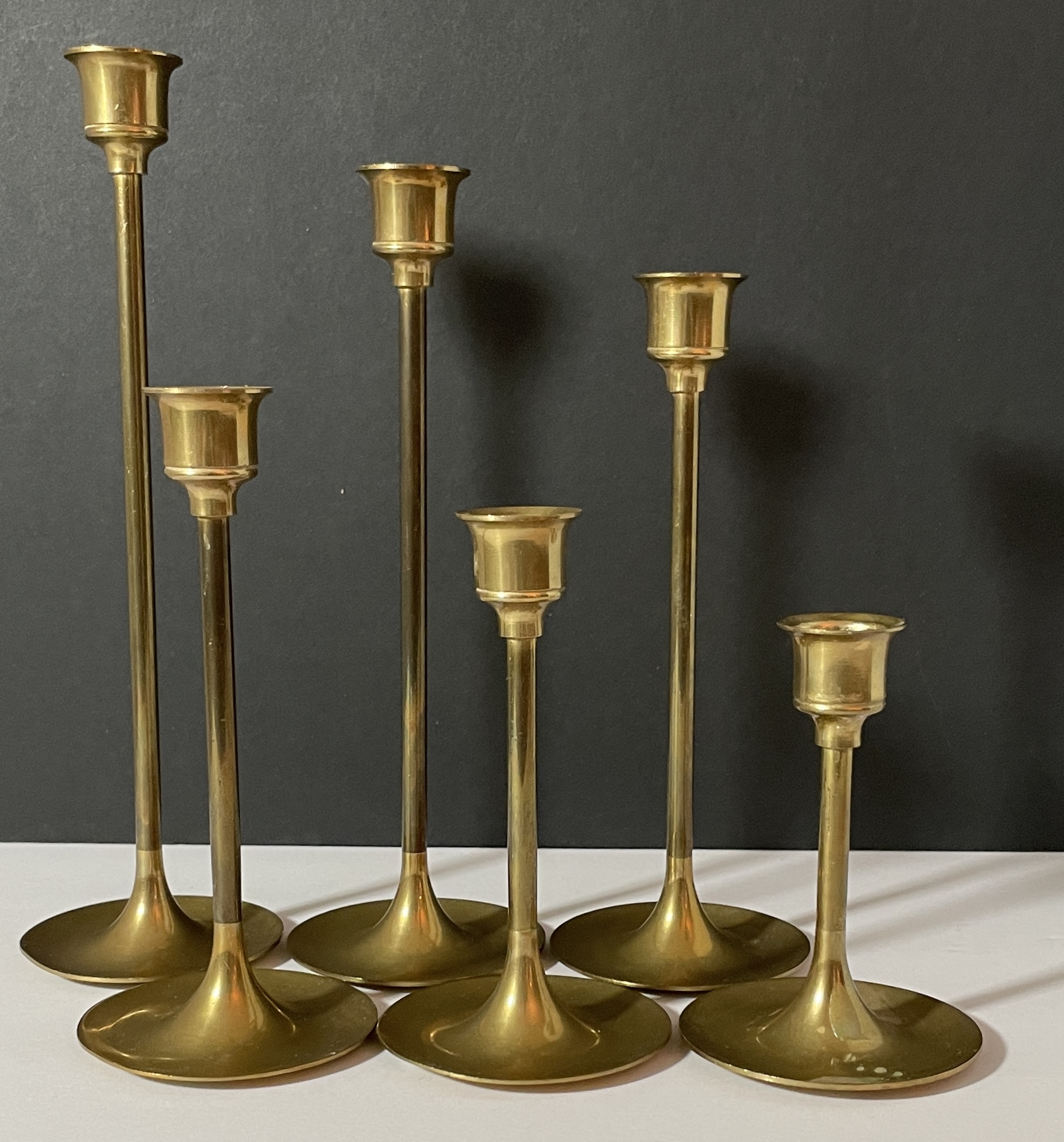Set of 6 Vintage Brass Graduated Candlestick Holders - Taiwan. Measure 9" down to 4" tall. 2.75" dia. base.